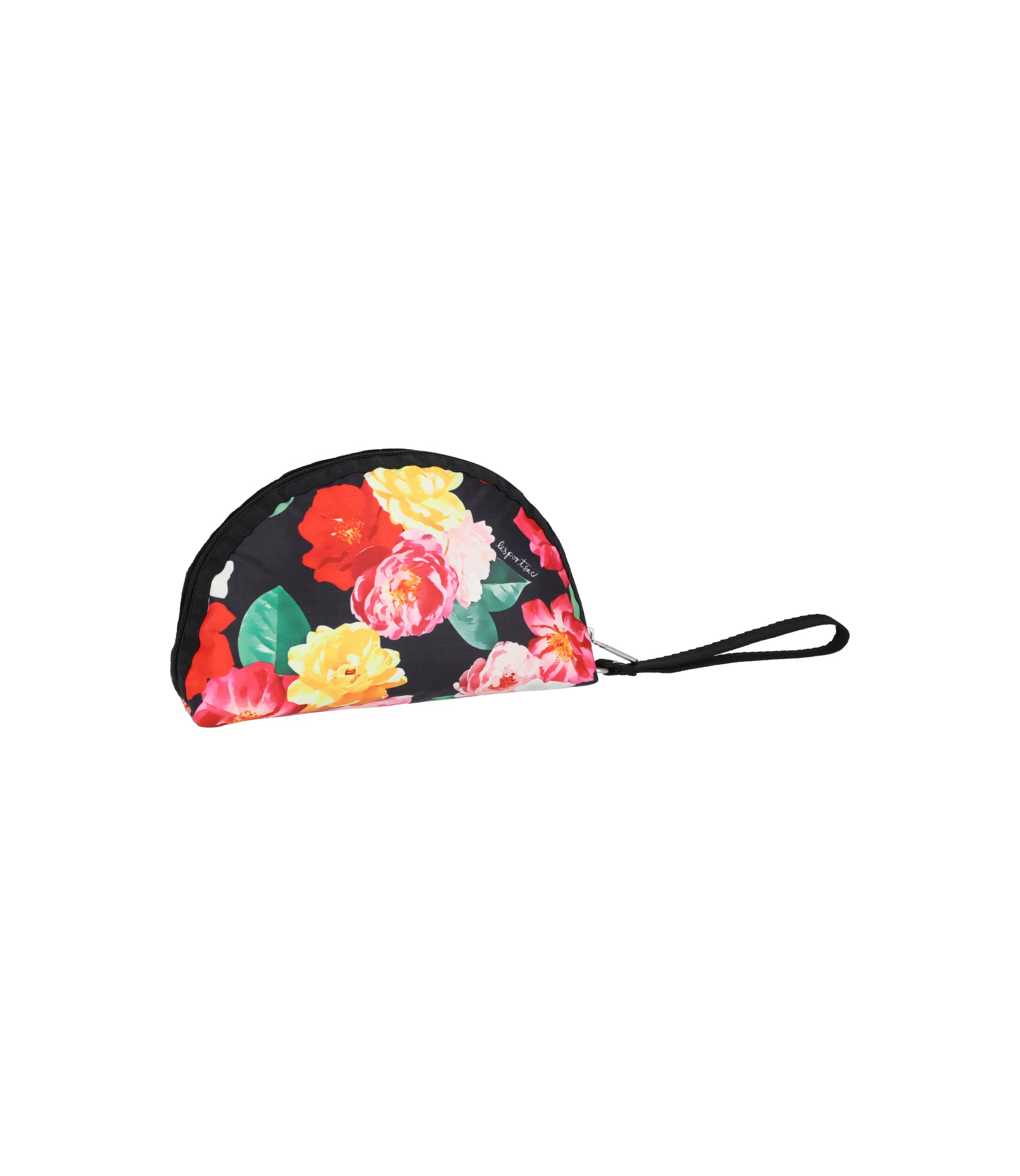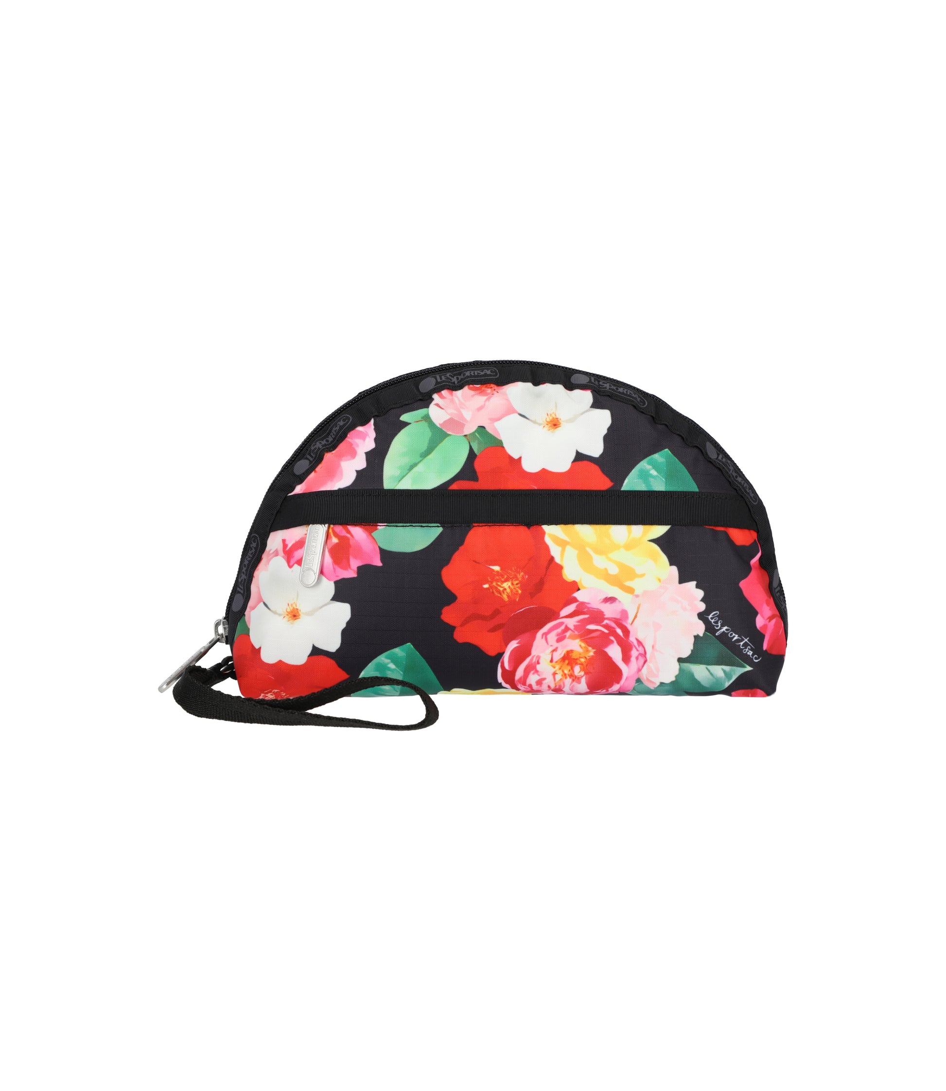 Zipped main closure, Exterior front zip pocket, 0.5in/1.3cm wide wristlet strap (Length: 5.5in/14cm)