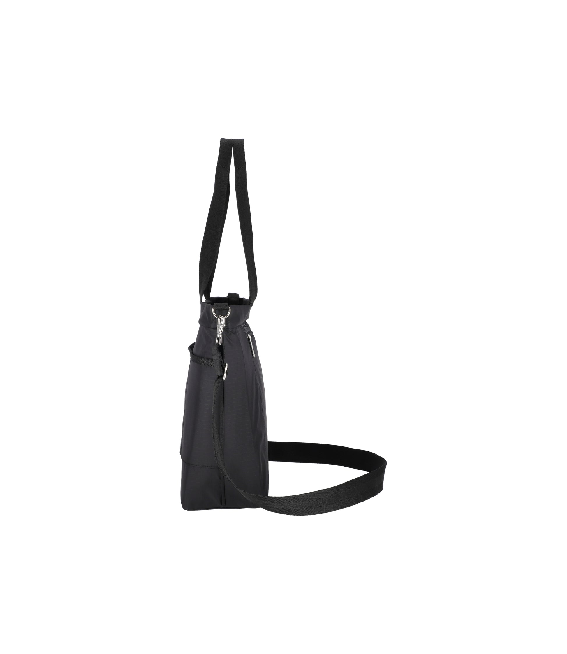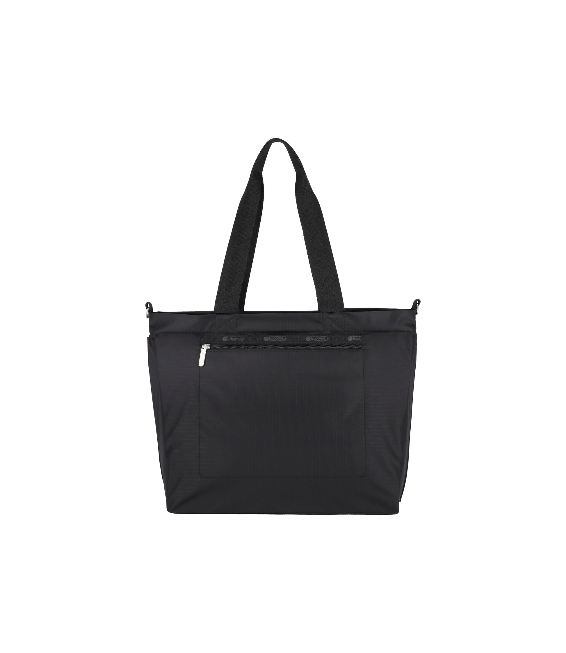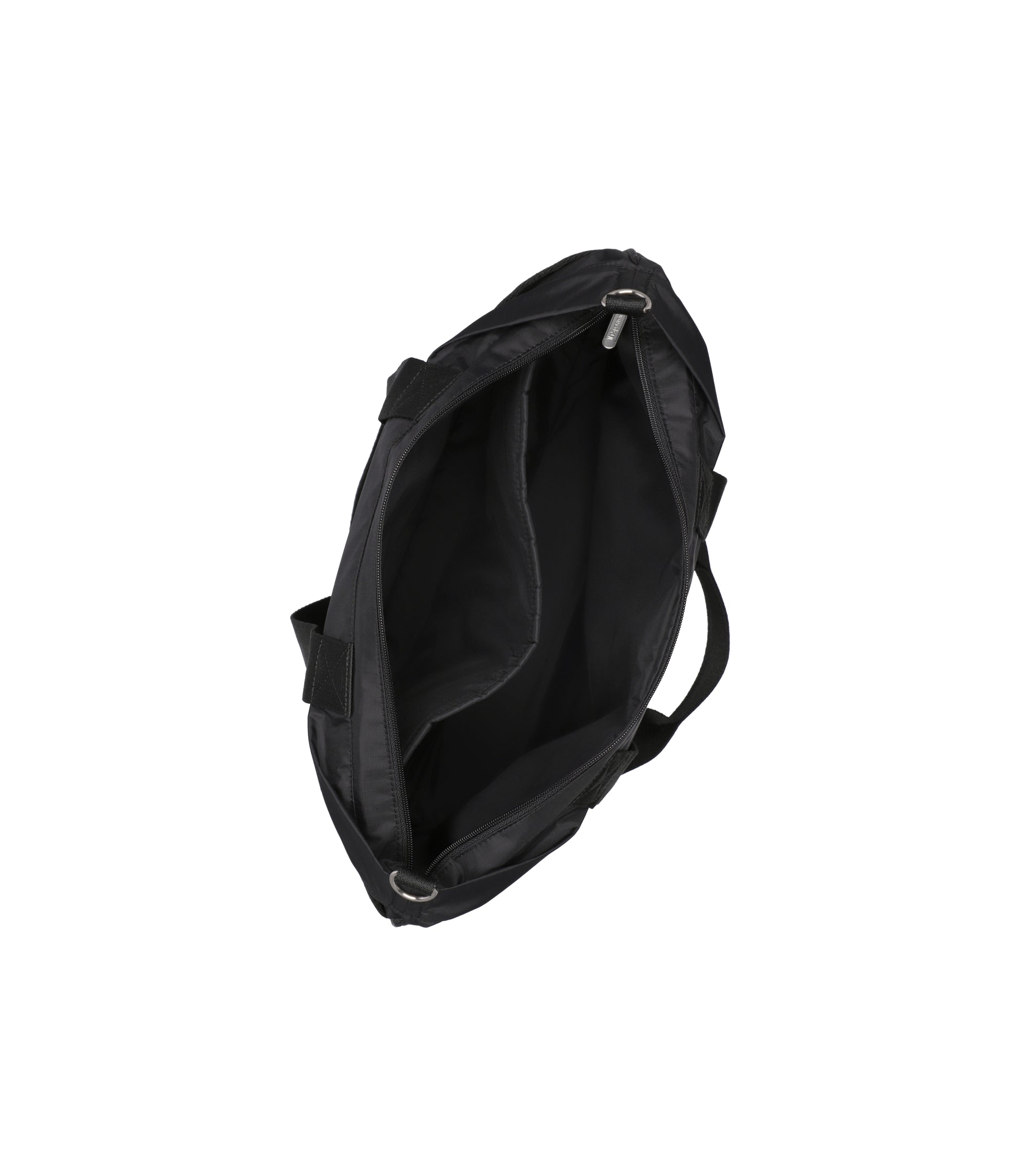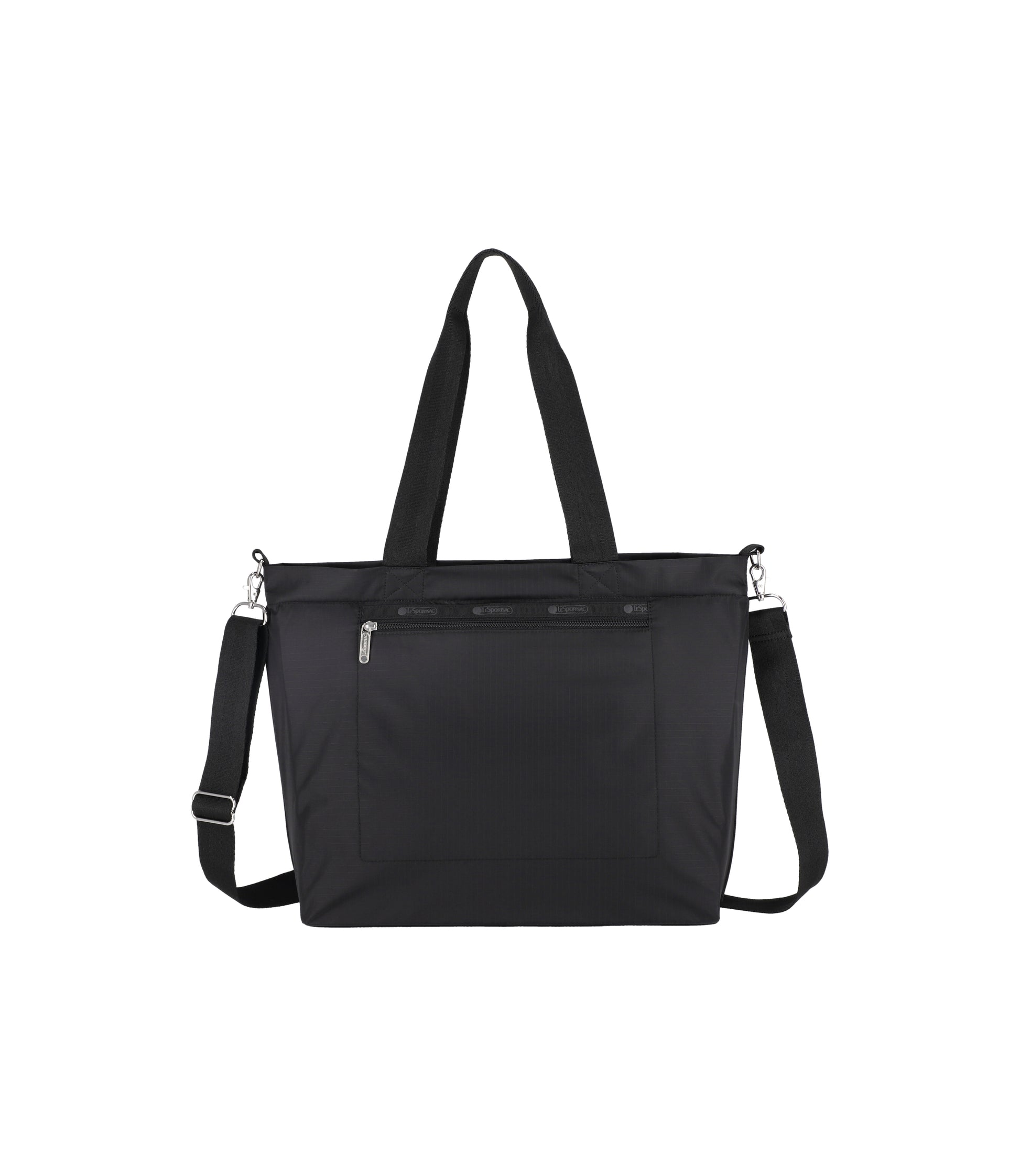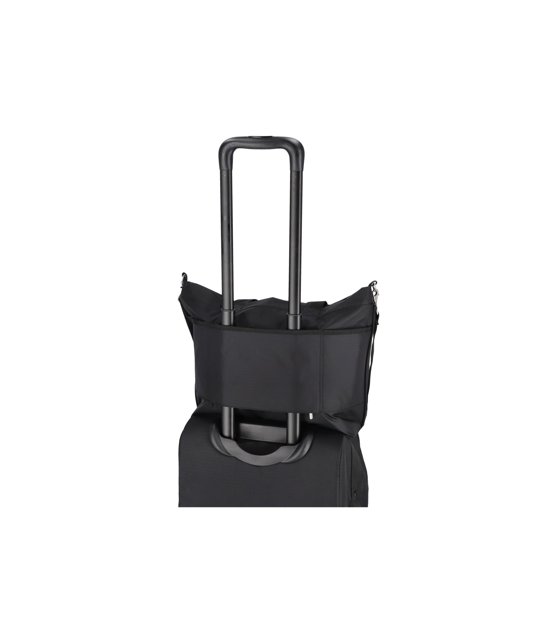 Zipped main closure, Exterior front zip pocket, Exterior back panel zip closure pocket with dual zipper pulls and a bottom zipper to convert pocket into a sleeve (to slide over rolling luggage handles), Interior back wall padded open pocket for 15in laptop, Metal D-Rings on sides, 1.5in/3.5cm pinched top handles (Drop: 10.25in/26cm), 1.5in/3.8cm wide adjustable/detachable shoulder strap (Max Length: 50in/127cm, Min Length: 26.5in/67.3cm)
