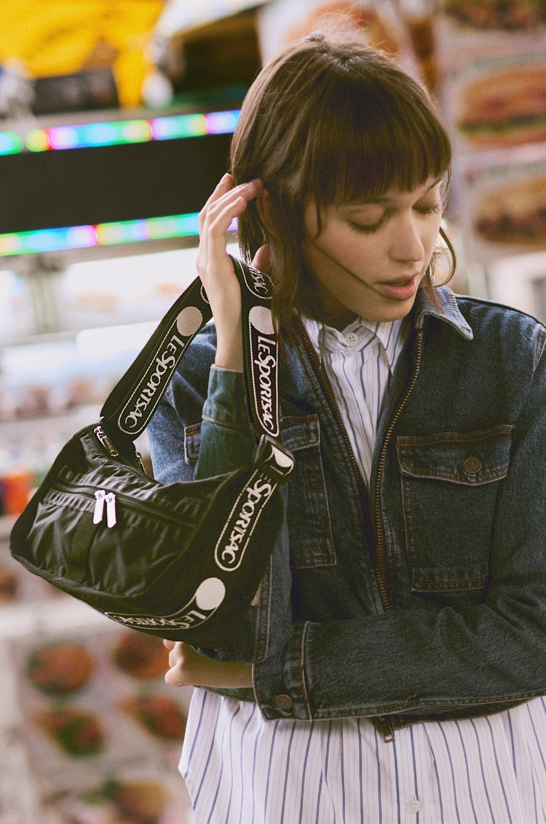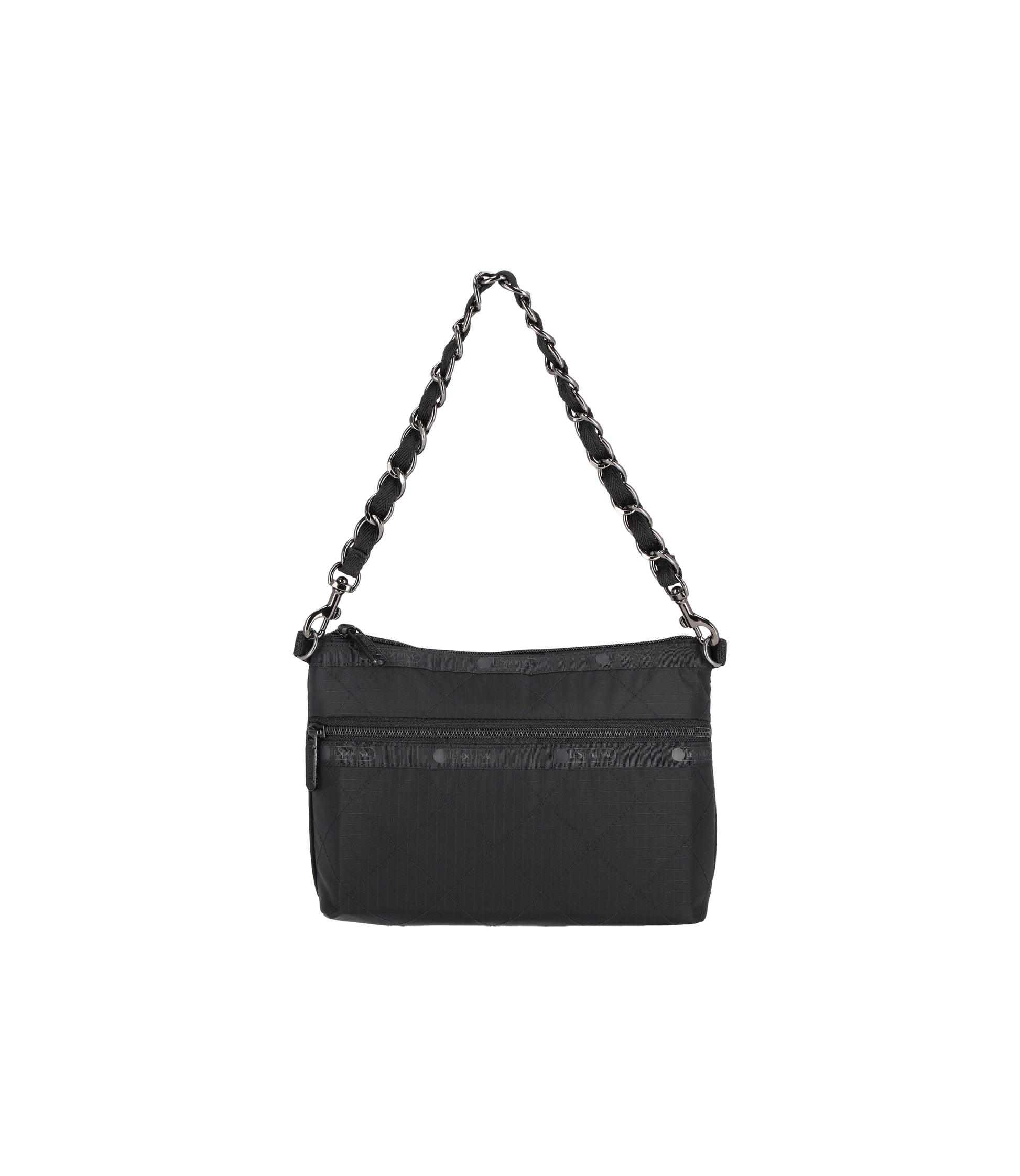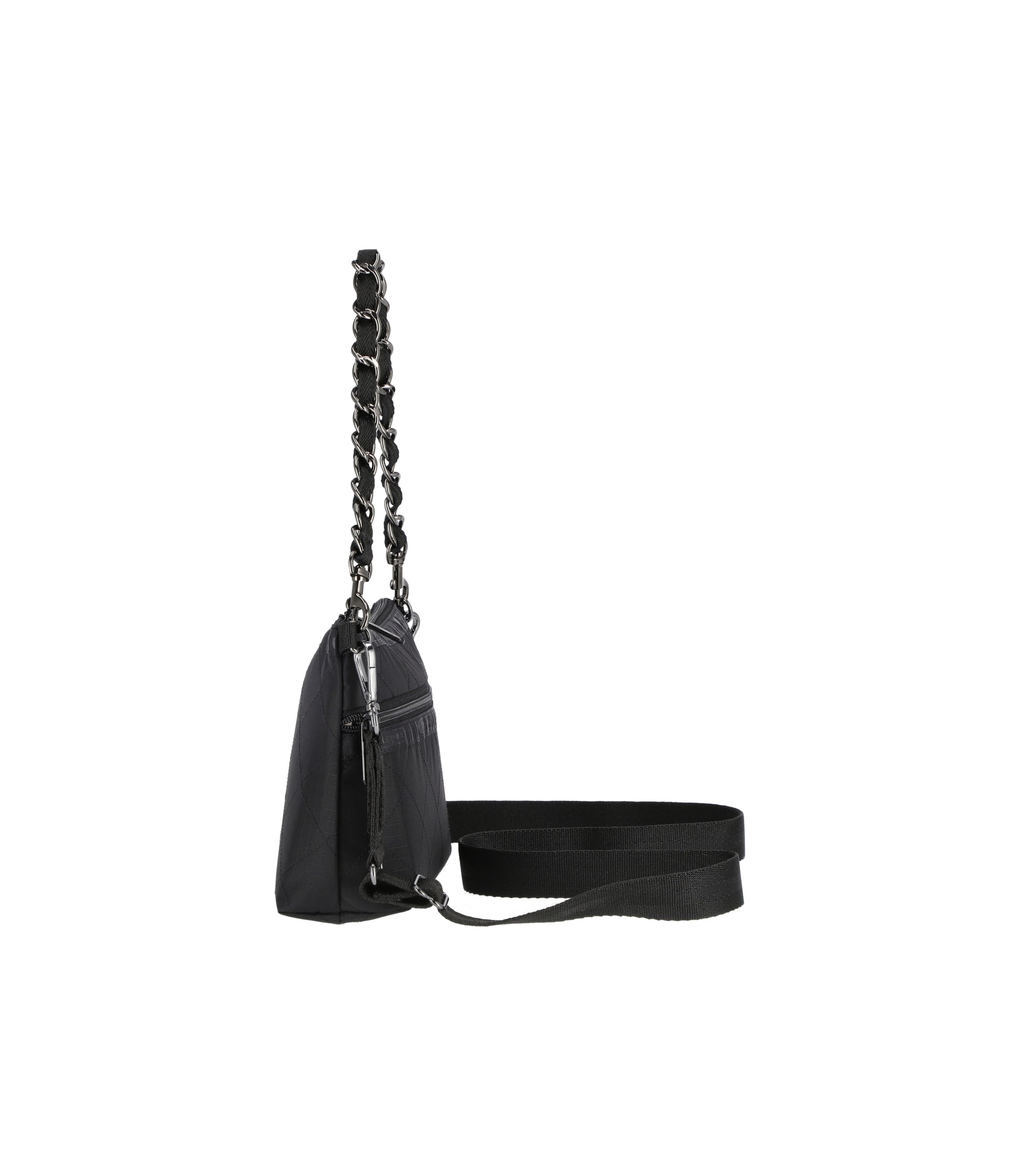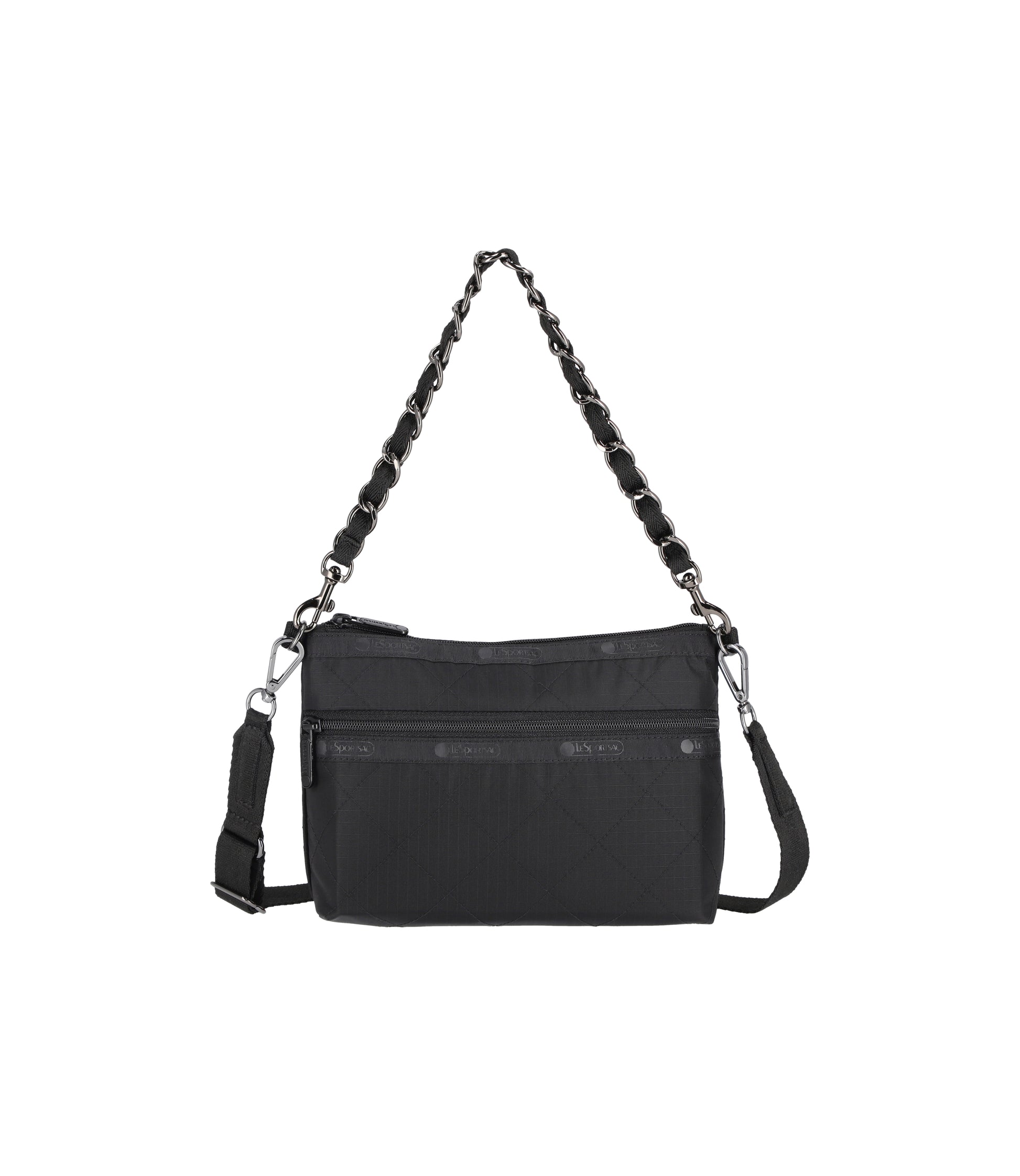 Zip main closure, Exterior front zip pocket, Two detachable strap options: Short Strap - Detachable 0.375in/1cm wide metal chain strap with intertwined fabric (with a drop of 5.75 in / 14.6 cm and a length of 17.75 in / 45 cm) and Long Strap - 1 in / 2.5 cm wide adjustable/detachable webbing crossbody strap (Min length: 24.8 in / 63 cm and max Length: 42.5 in / 108 cm)