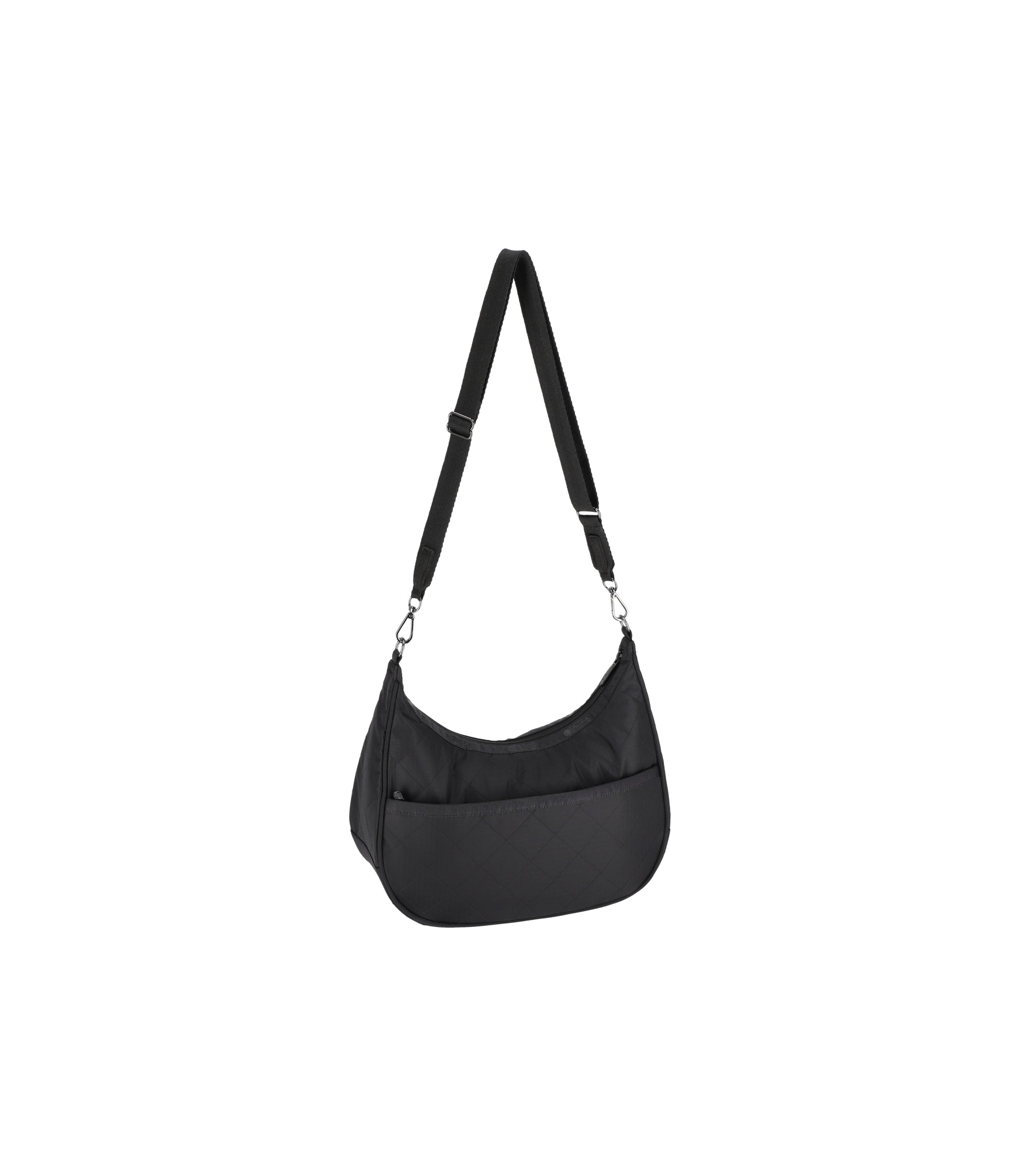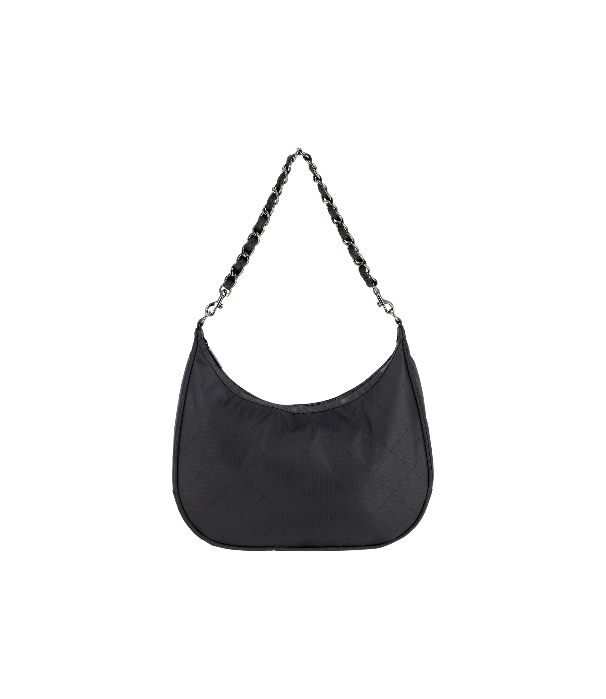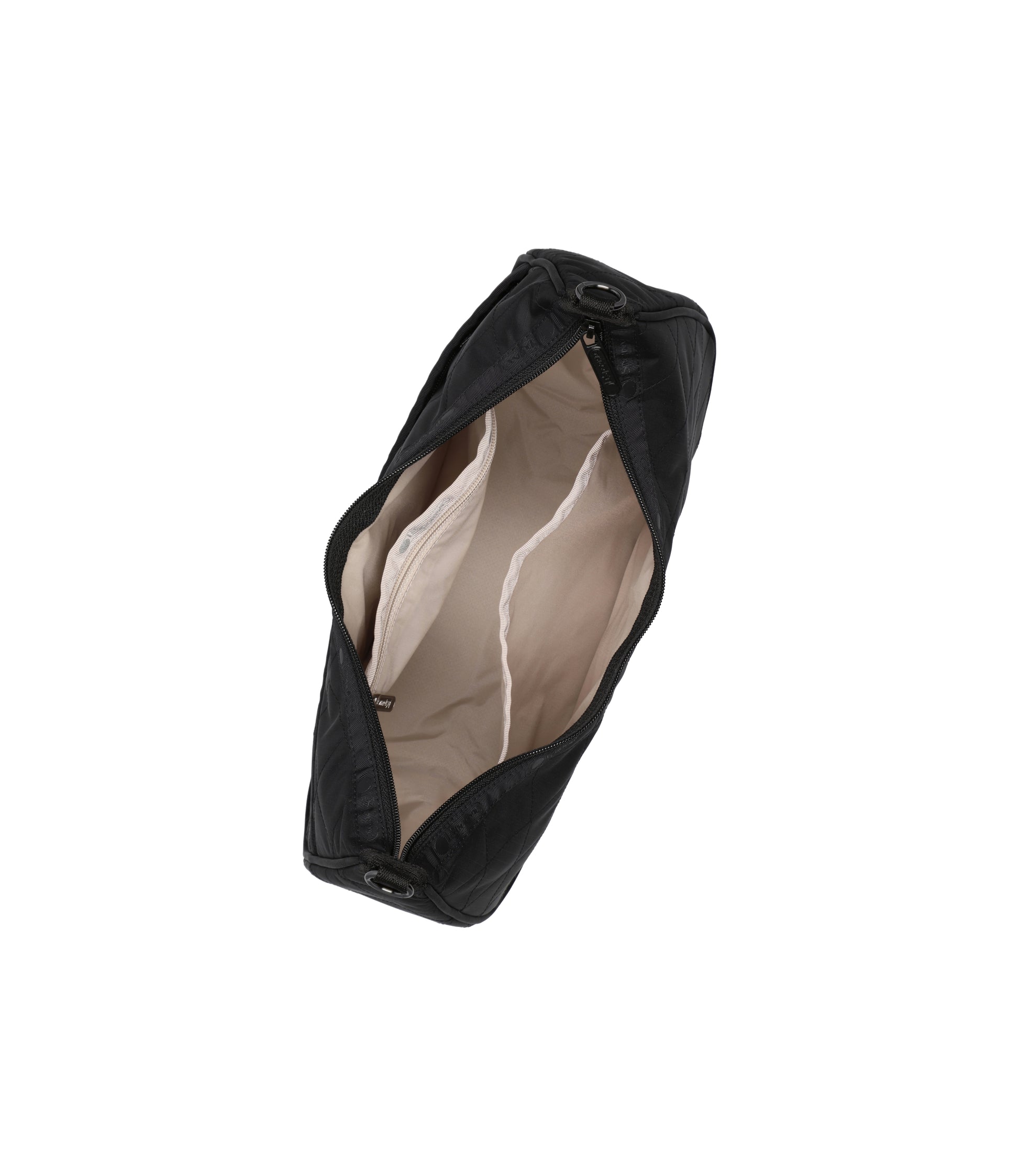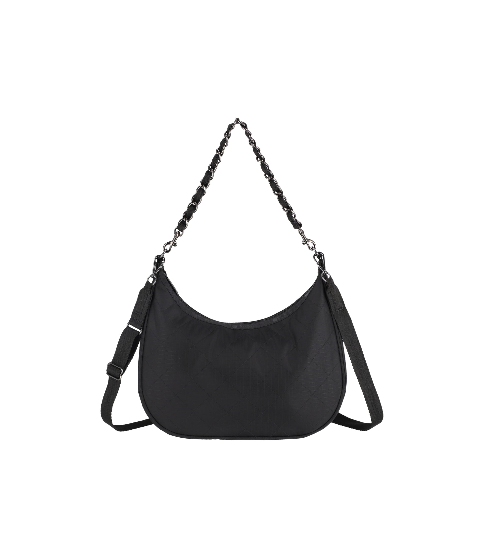 Zip top main closure, Exterior back pocket with zip closure, Interior front wall open pocket, Interior back wall combination zip/open pocket, Two detachable strap options: Short Strap - Detachable 0.375in/1cm wide metal chain strap with intertwined fabric (with a drop of 5.75 in / 14.6 cm and a length of 17.75 in / 45 cm) and Long Strap - 1 in / 2.5 cm wide adjustable/detachable webbing crossbody strap (Min length: 24.8 in / 63 cm and max Length: 42.5 in / 108 cm)