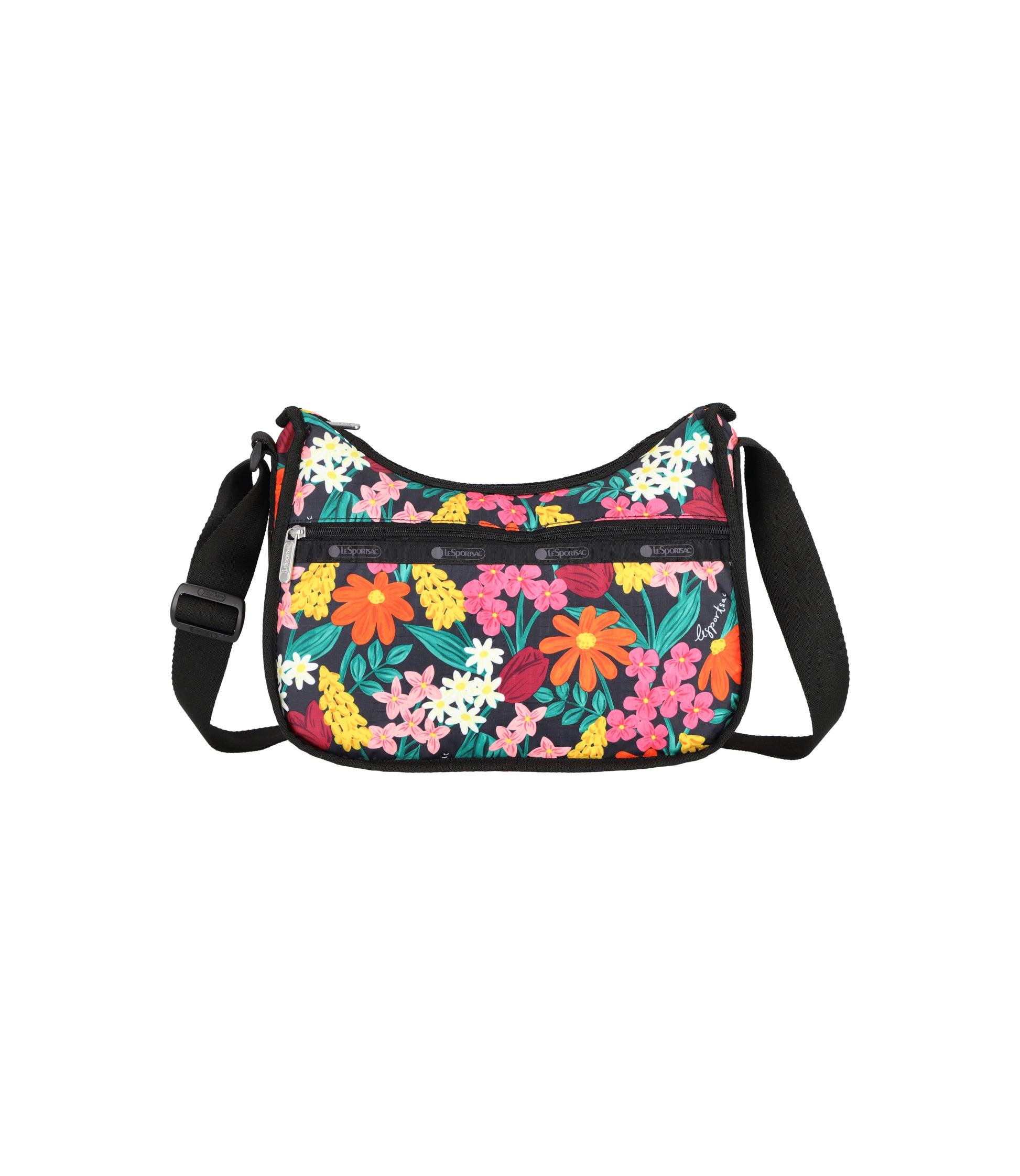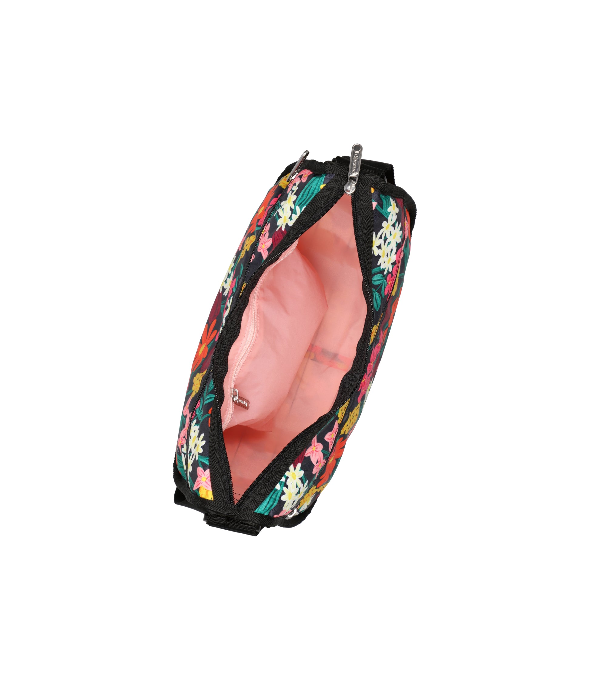 Zipped main closure, Exterior front pocket with zipped closure, Exterior back pocket with zipped closure, Interior back wall hanging zipper pocket, Adjustable shoulder strap (Max. 50in / 127cm), Includes matching pouch with zipped closure.