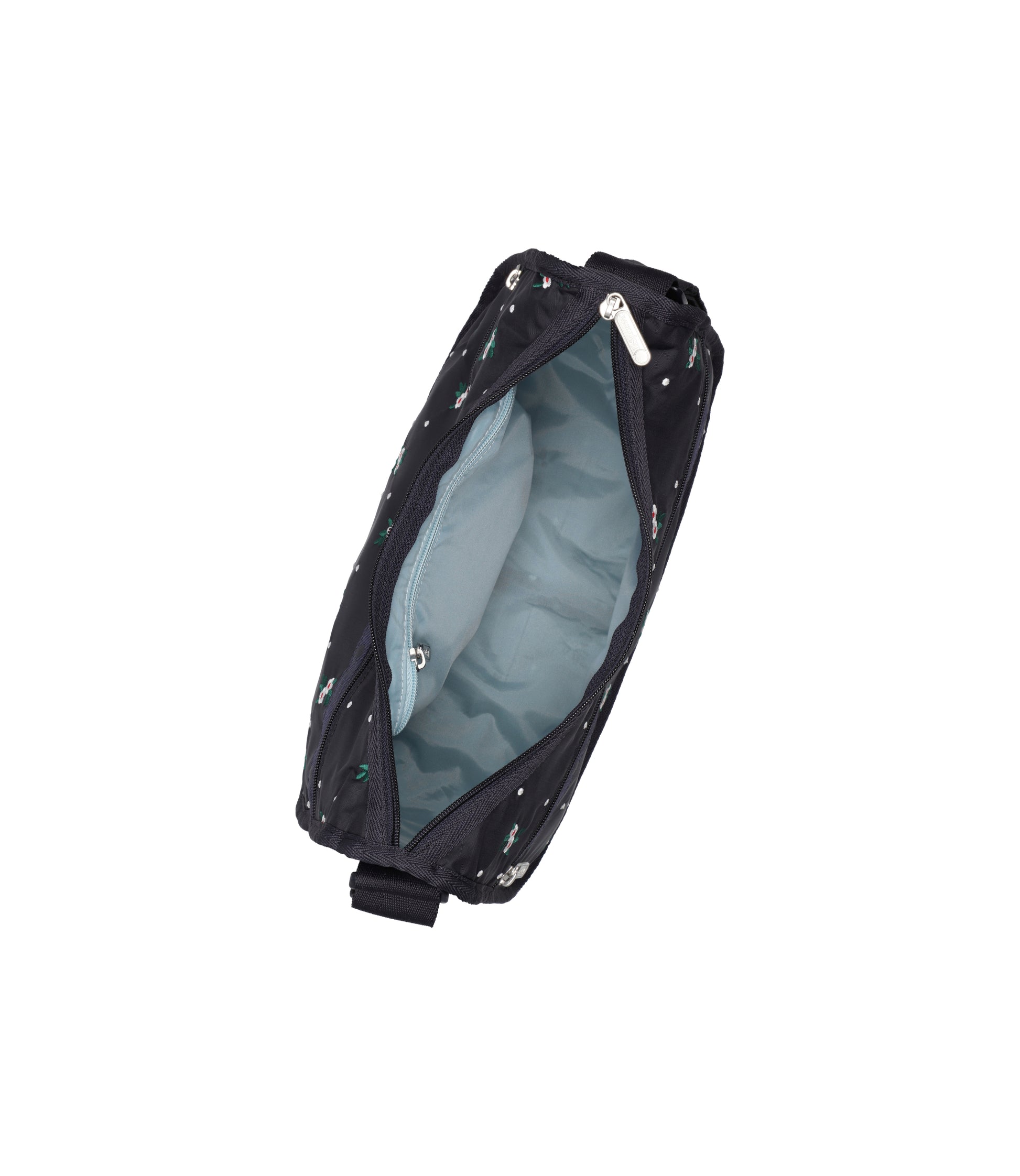 Zipped main closure, Exterior front pocket with zipped closure, Exterior back pocket with zipped closure, Interior back wall hanging zipper pocket, Adjustable shoulder strap (Max. 50in / 127cm), Includes matching pouch with zipped closure