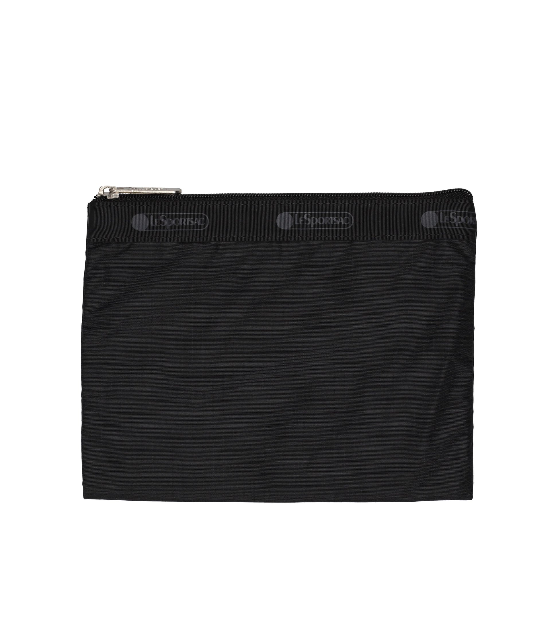 Zipped main closure, Exterior front pocket with zipped closure, Exterior back pocket with zipped closure, Interior back wall hanging zipper pocket, Adjustable shoulder strap (Max. 50in / 127cm), Includes matching pouch with zipped closure.