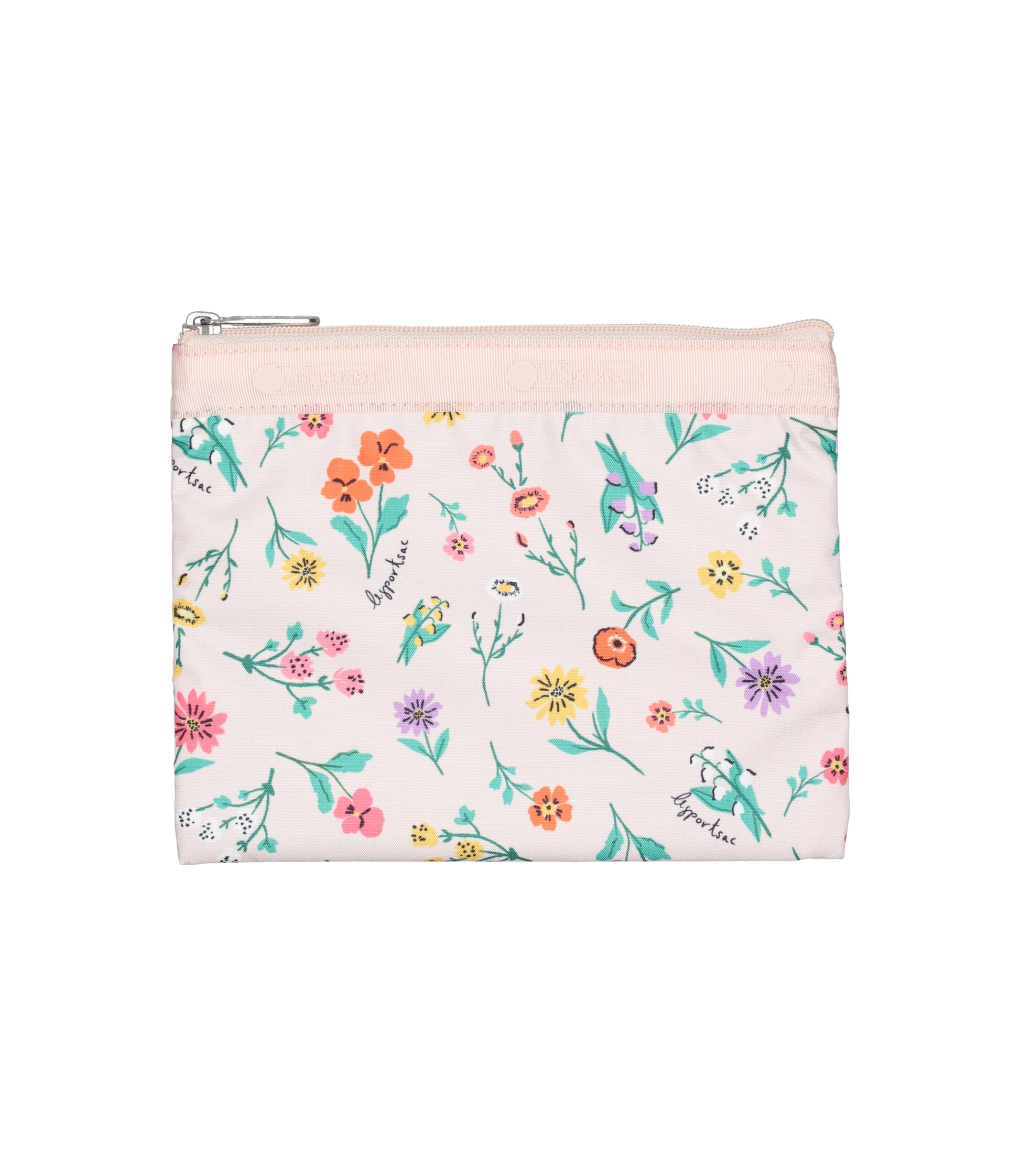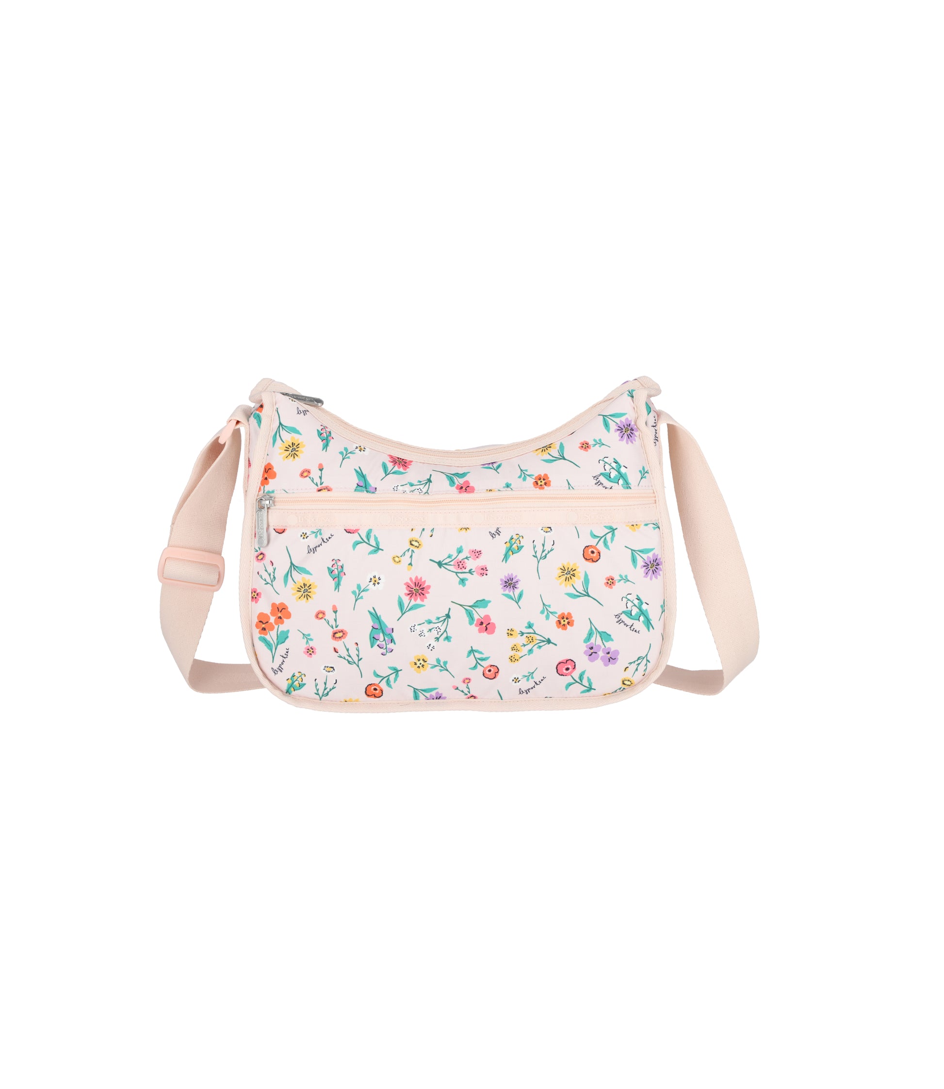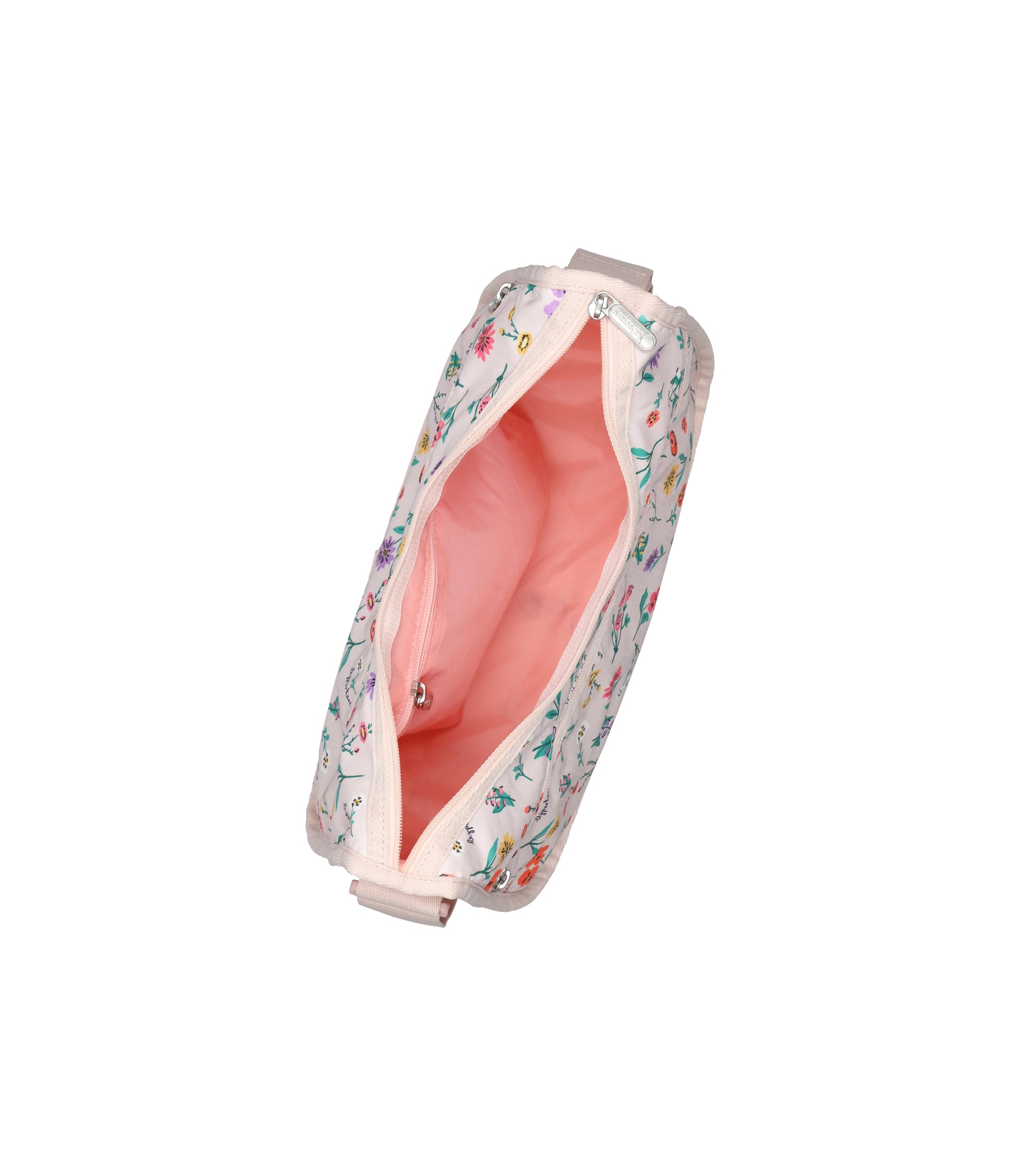 Zipped main closure, Exterior front pocket with zipped closure, Exterior back pocket with zipped closure, Interior back wall hanging zipper pocket, Adjustable shoulder strap (Max. 50in / 127cm), Includes matching pouch with zipped closure.
