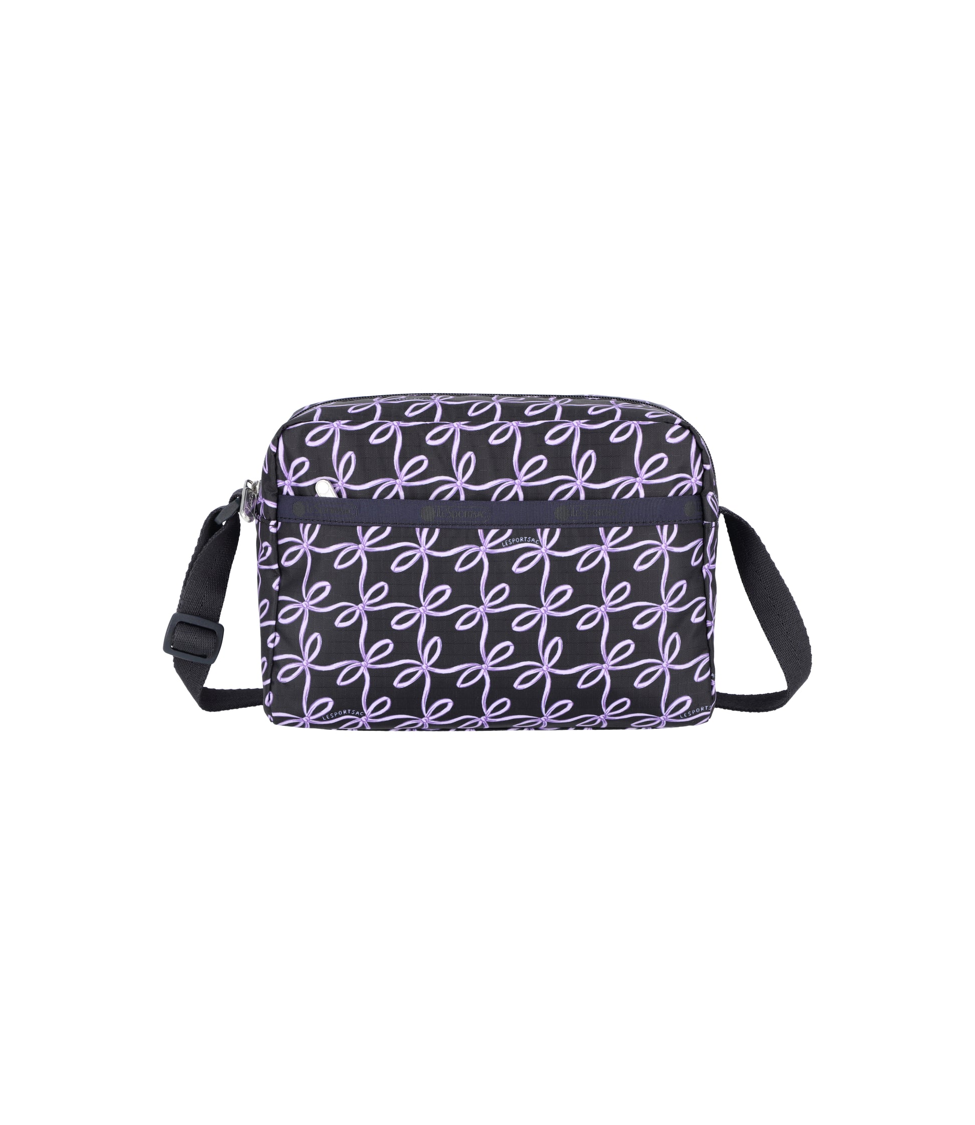 Zip top main closure, Exterior front pocket with zip closure, Exterior back pocket with zip closure, Adjustable crossbody strap (52in/132.08cm), Two interior back wall open pockets, Plastic hardware