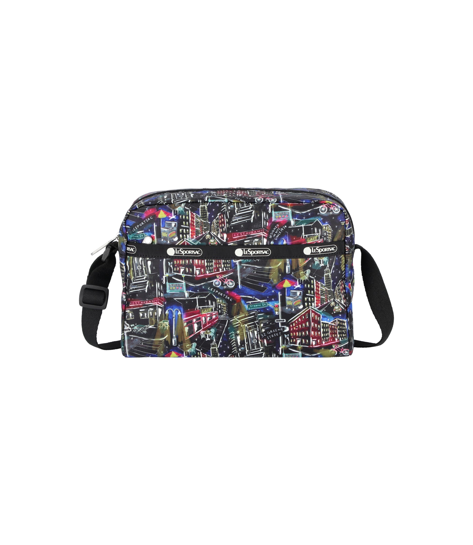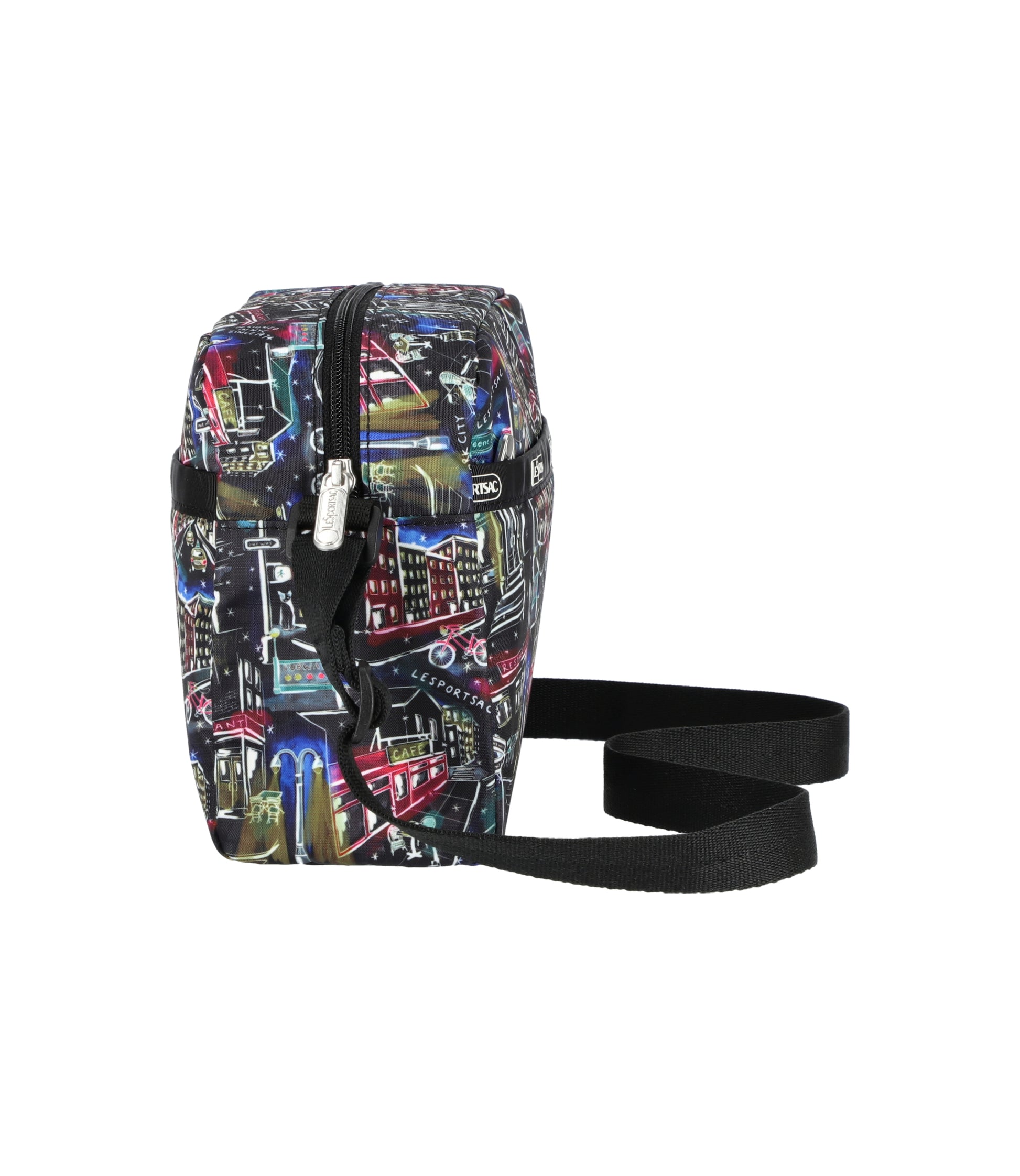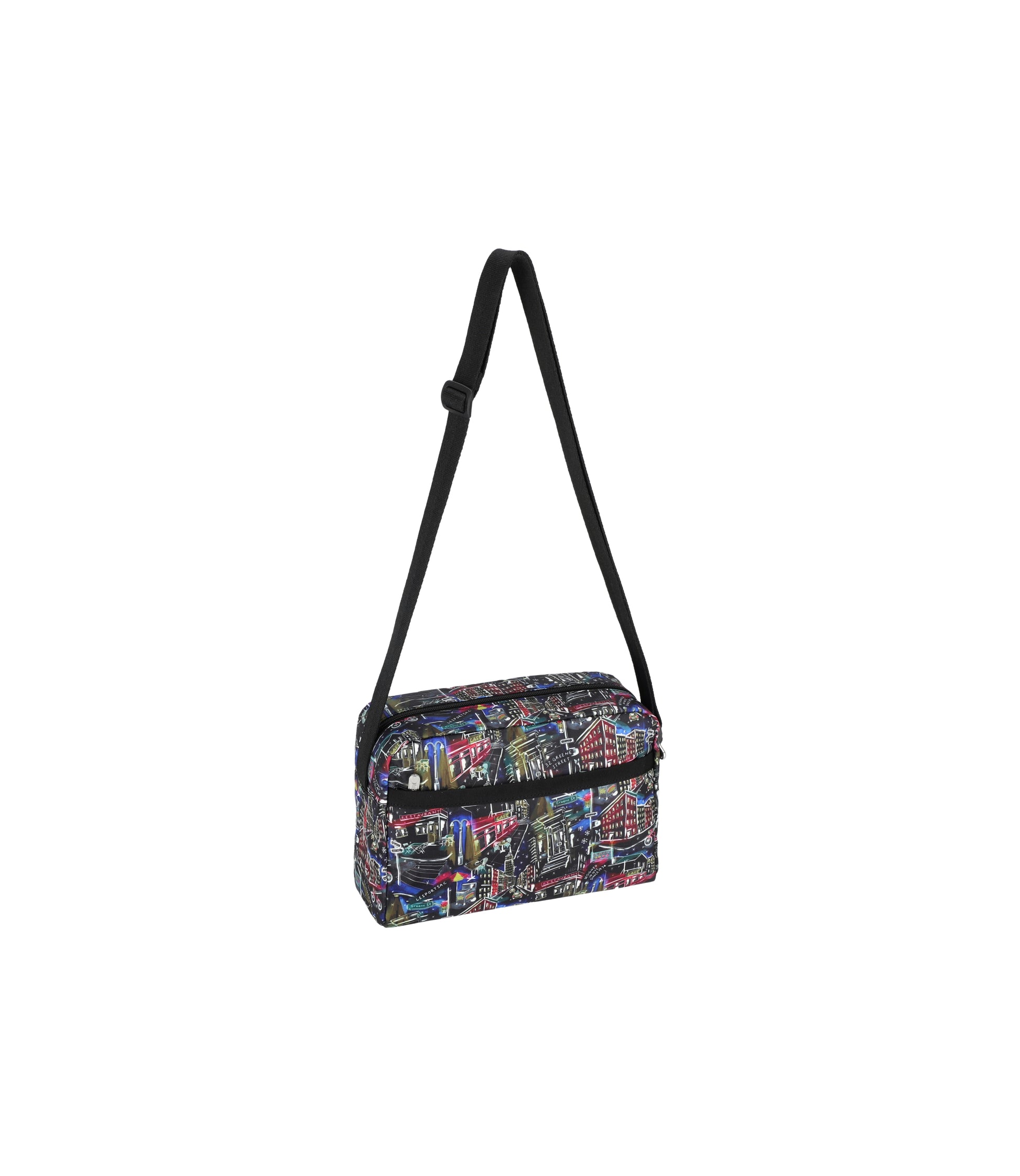 Zip top main closure, Exterior front pocket with zip closure, Exterior back pocket with magnetic snap closure, Adjustable crossbody strap 132.08cm, Two interior back wall open pockets, Plastic hardware