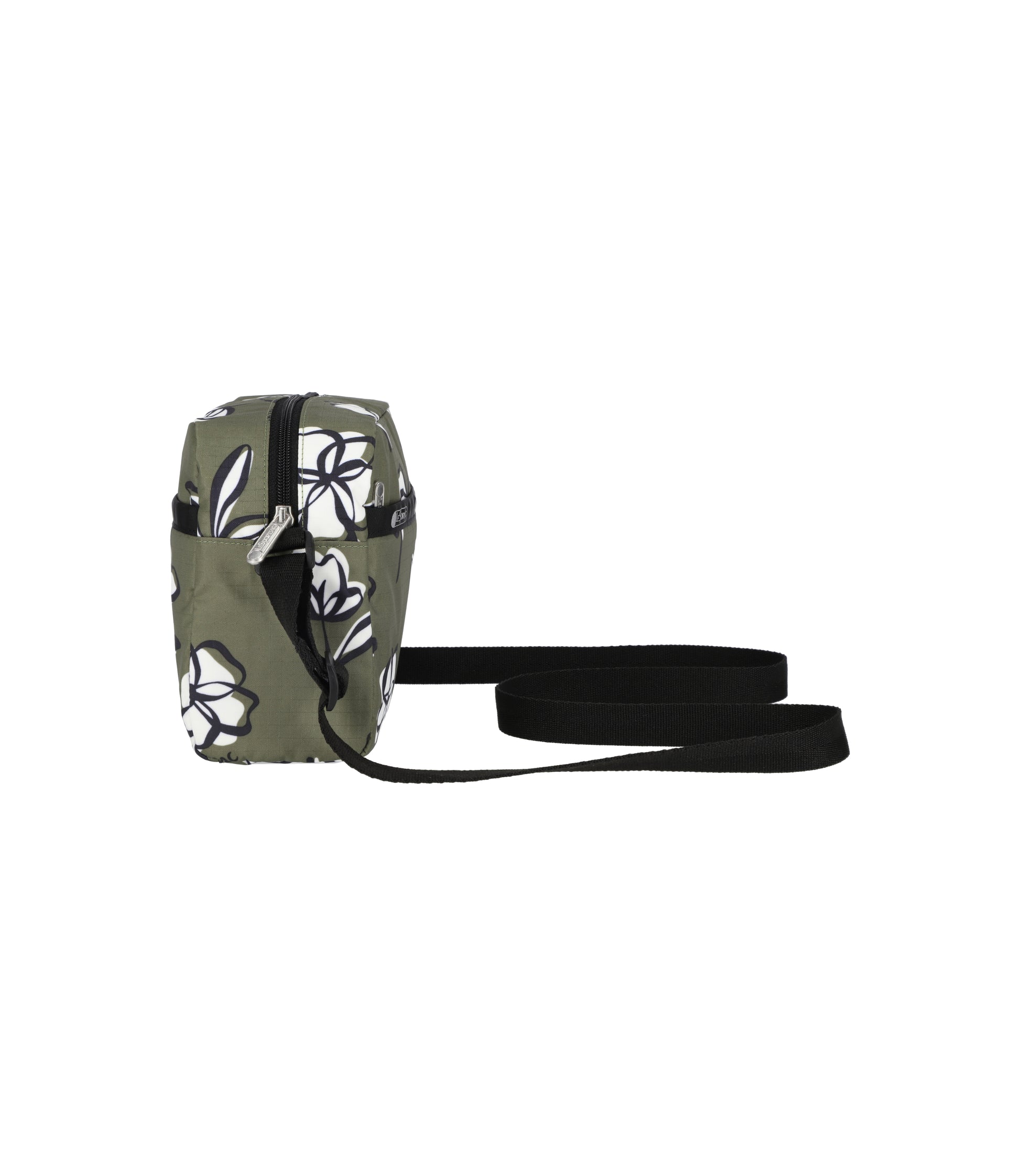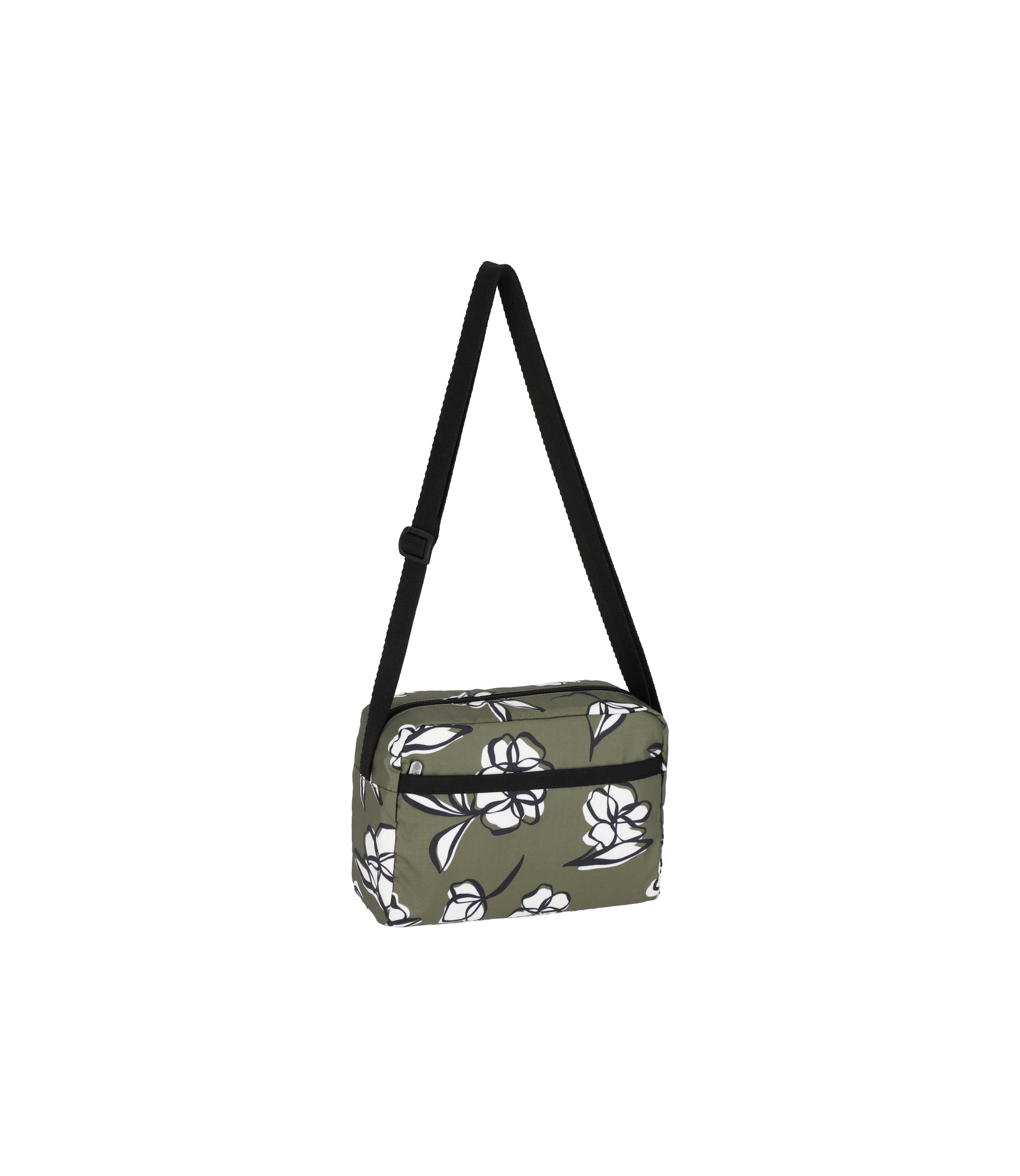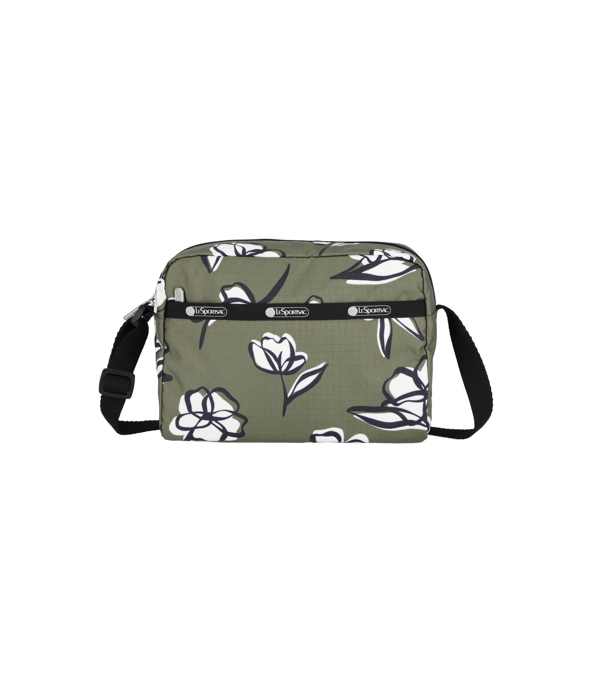 Zip top main closure, Exterior front pocket with zip closure, Exterior back pocket with zip closure, Adjustable crossbody strap (52in/132.08cm), Two interior back wall open pockets, Plastic hardware