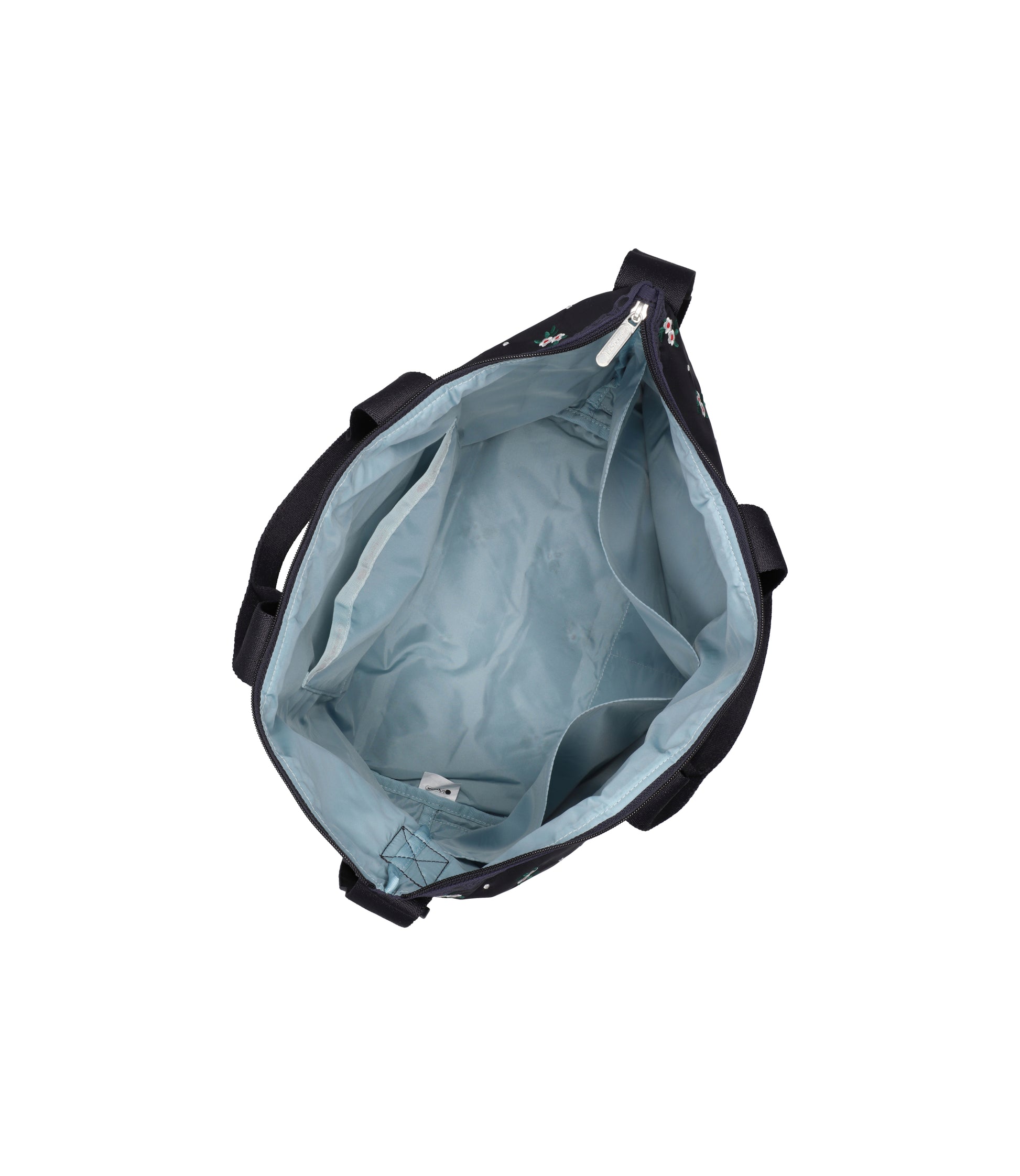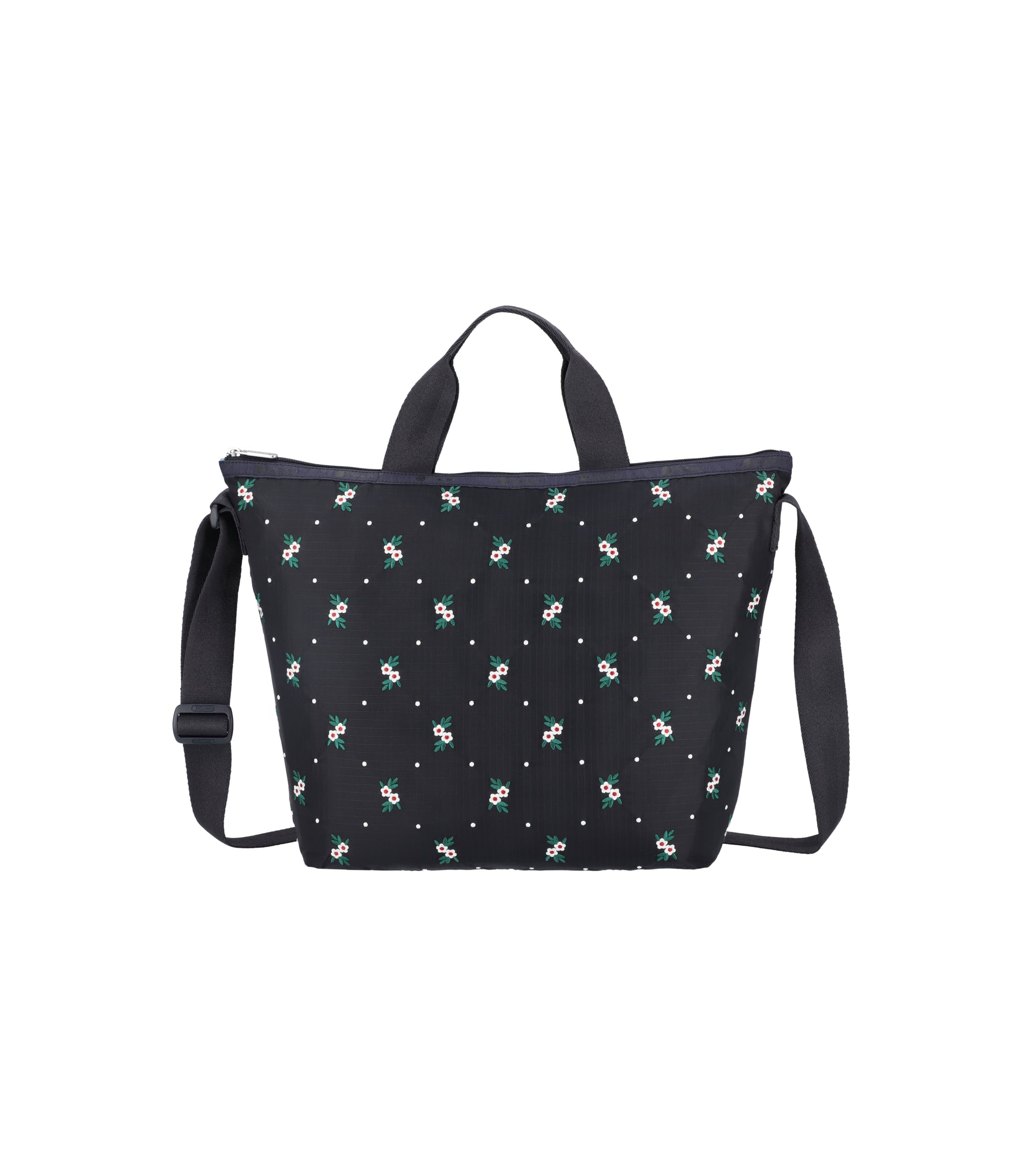 Zip top main closure, 1.5in (3.81cm) Wide pinched top handles (Drop: 5in /12.7cm), Adjustable crossbody strap (1.5in/3.81cm wide with a maximum extension of 52in/132cm), Exterior back panel pocket with zip closure, Two interior front wall open pockets, Interior back wall open pocket