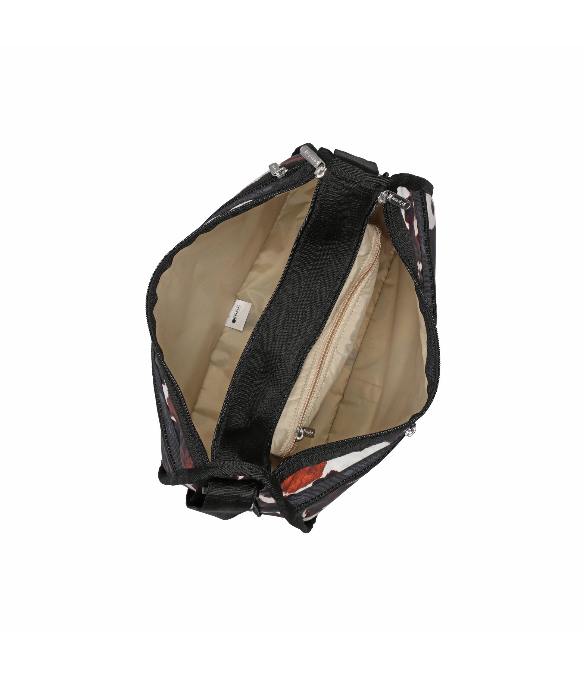 Two main compartments with zipped closures, Zip out expandable front main compartment, Two exterior front pockets with zipped closures, Exterior back pocket with zipped closure, Interior hanging pocket with zip closure (in front compartment), Adjustable shoulder strap (Max. 52in/132cm), Includes matching pouch with zipped closure