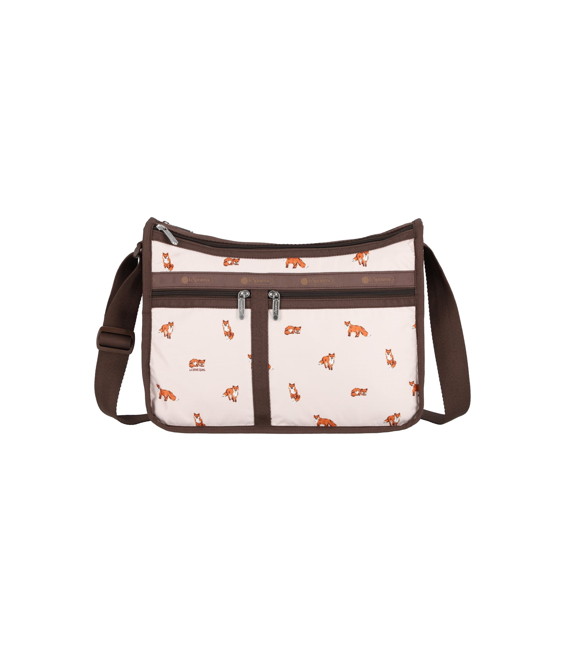 Two main compartments with zipped closures, Zip out expandable front main compartment, Two exterior front pockets with zipped closures, Exterior back pocket with zipped closure, Interior hanging pocket with zip closure (in front compartment), Adjustable shoulder strap (Max. 52in/132cm), Includes matching pouch with zipped closure