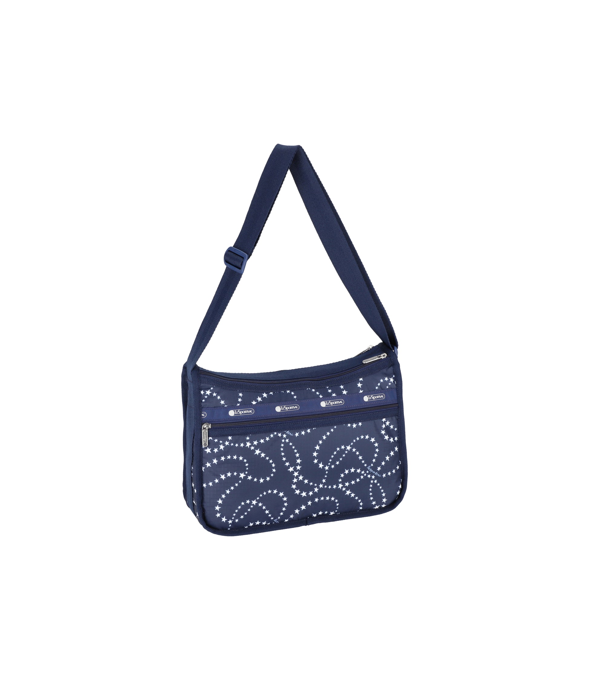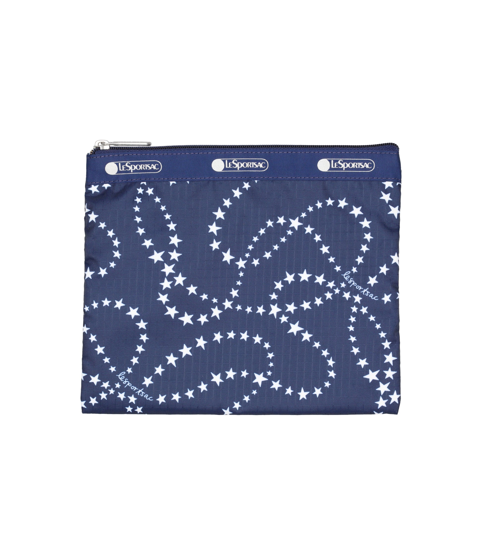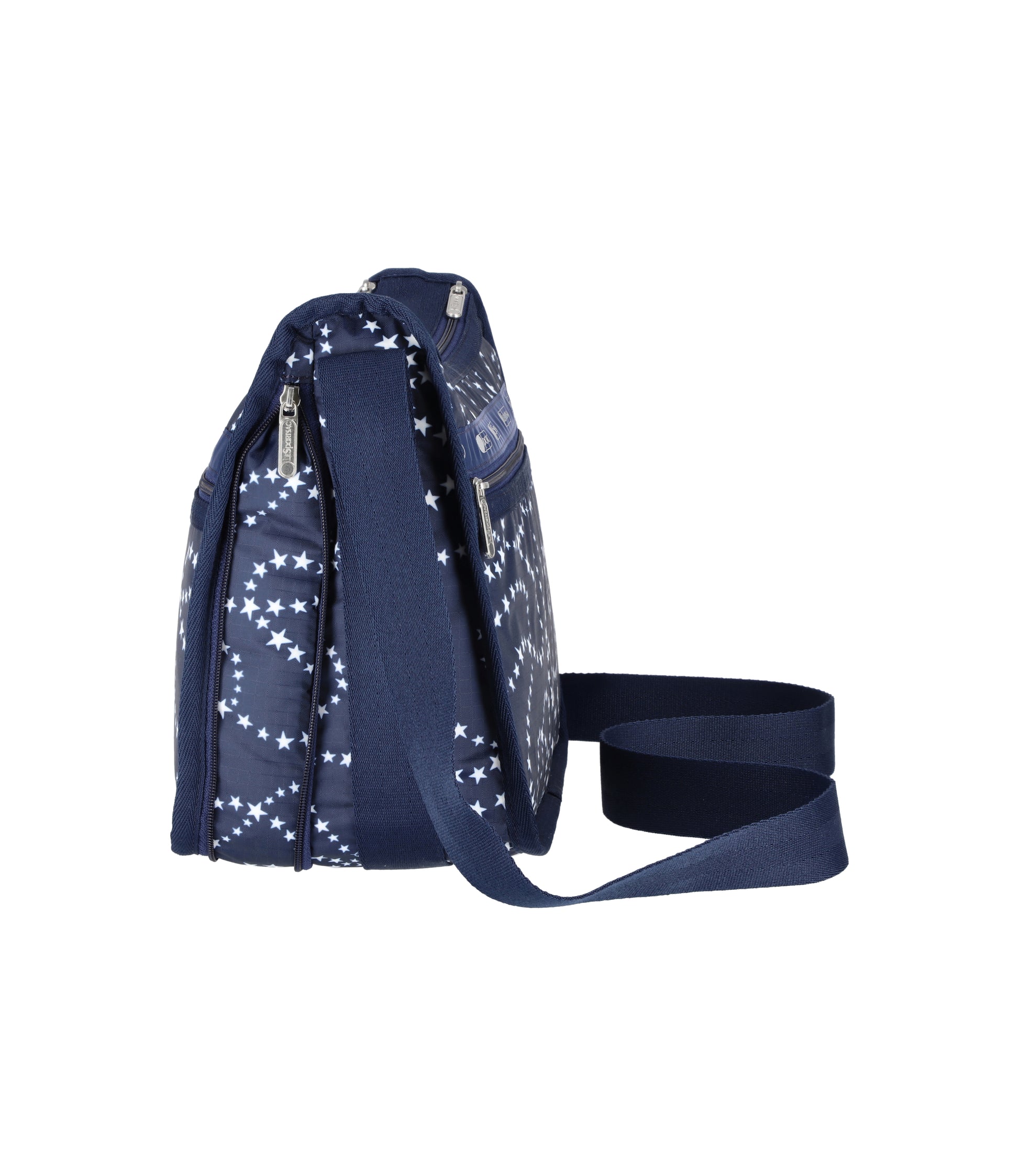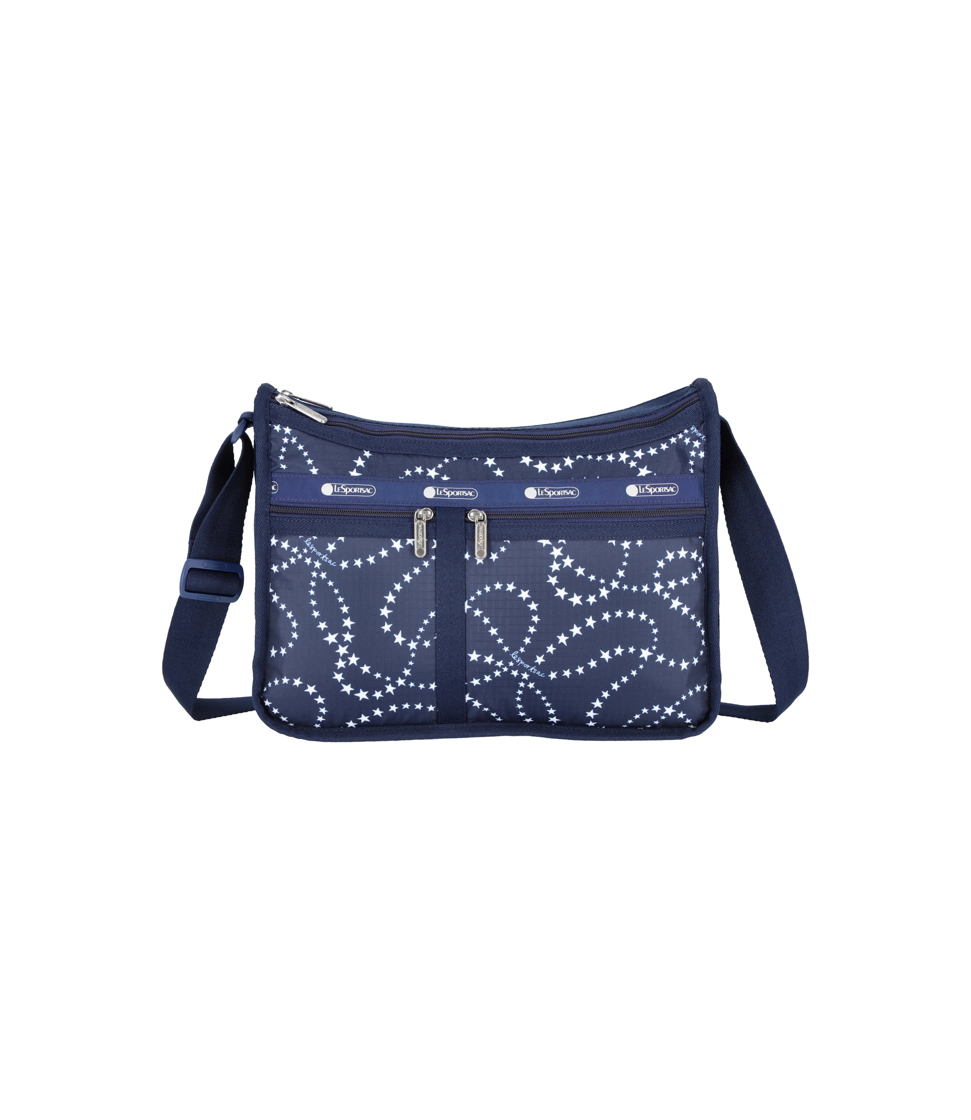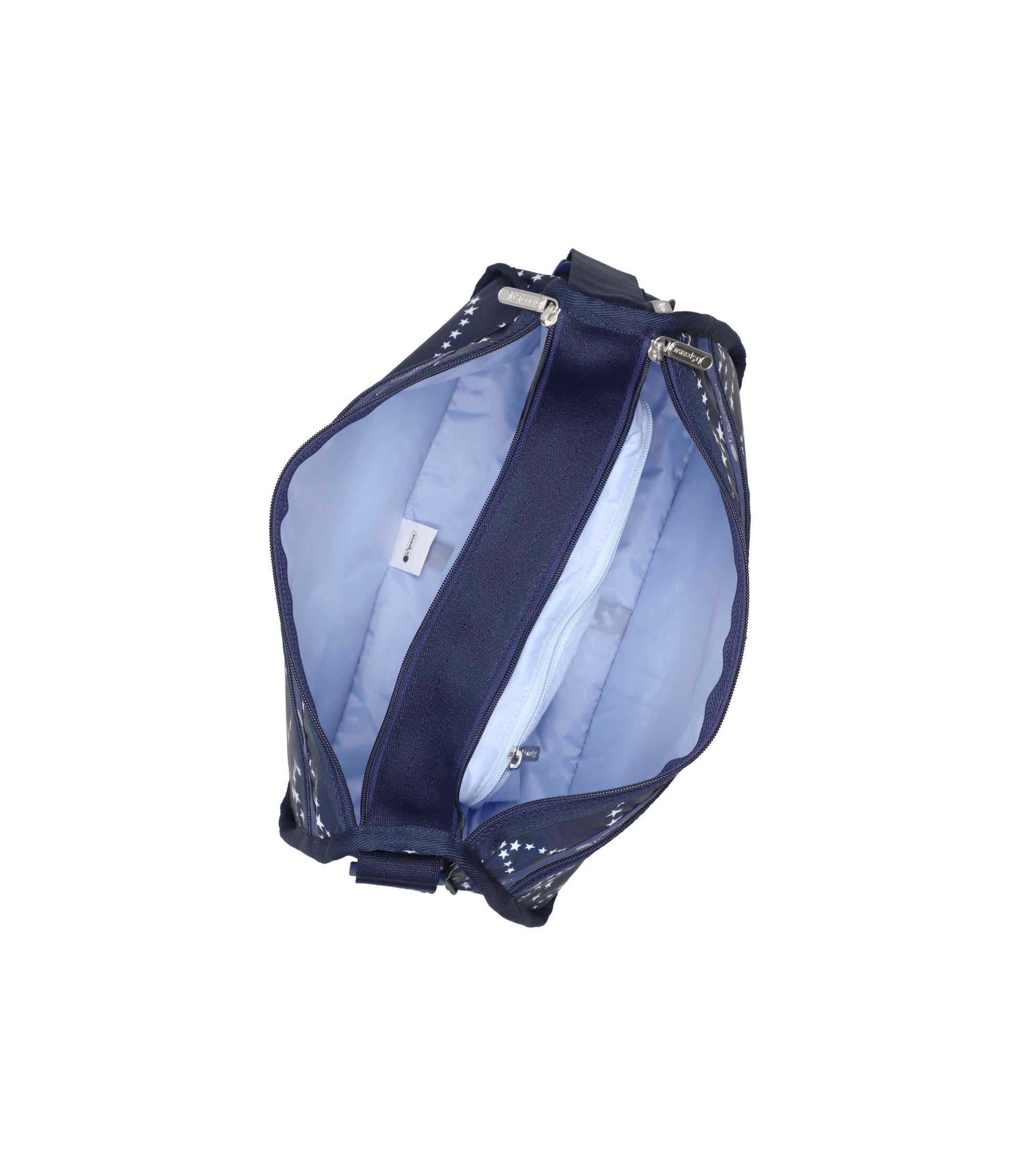 Two main compartments with zipped closures, Zip out expandable front main compartment, Two exterior front pockets with zipped closures, Exterior back pocket with zipped closure, Interior hanging pocket with zip closure (in front compartment), Adjustable shoulder strap (Max. 52in/132cm), Includes matching pouch with zipped closure