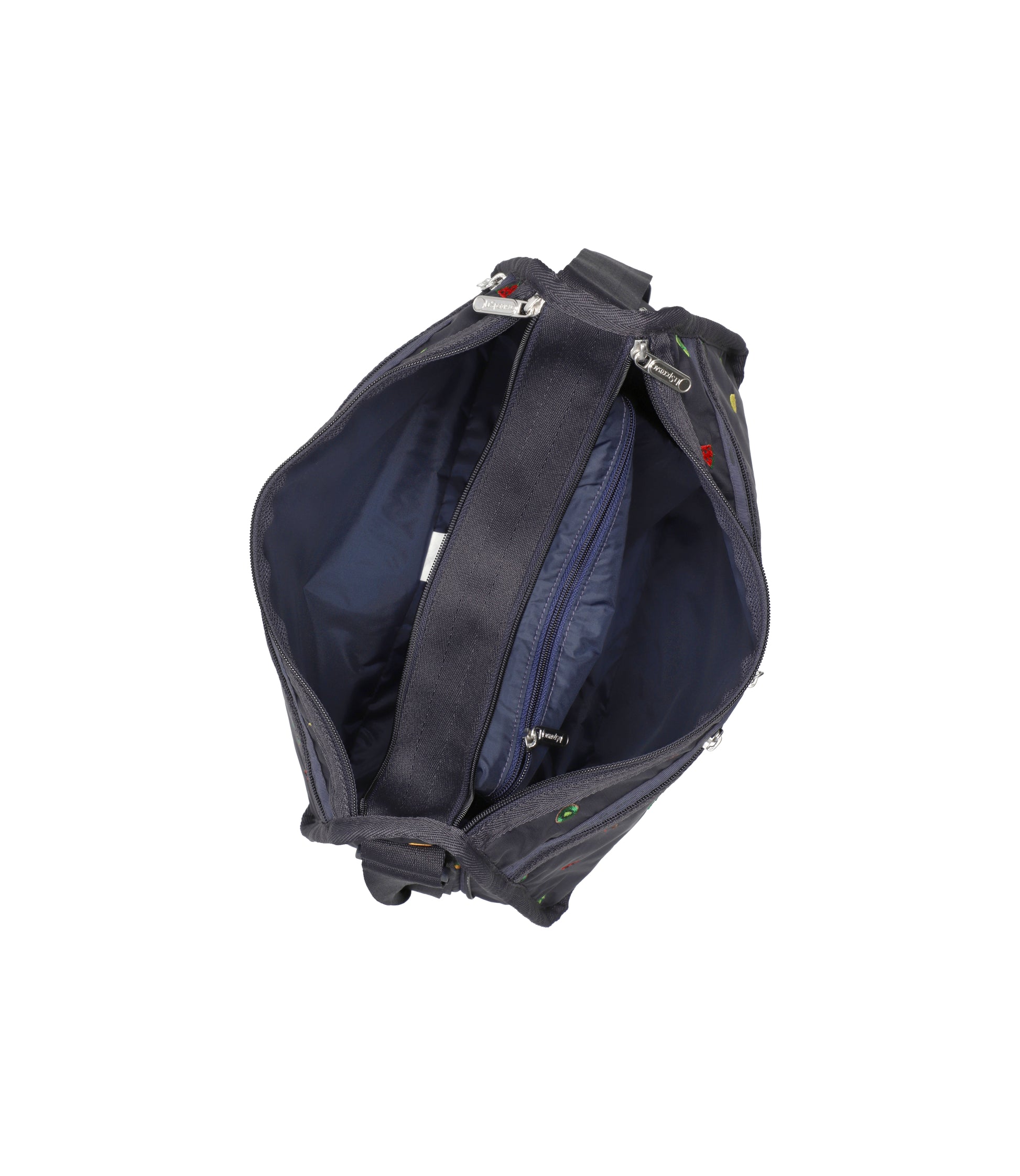 Two main compartments with zipped closures, Zip out expandable front main compartment, Exterior back pocket with zipped closure, Two exterior front pockets with zipped closures, Adjustable shoulder strap (Max. 52in/132cm), Includes matching pouch with zipped closure.