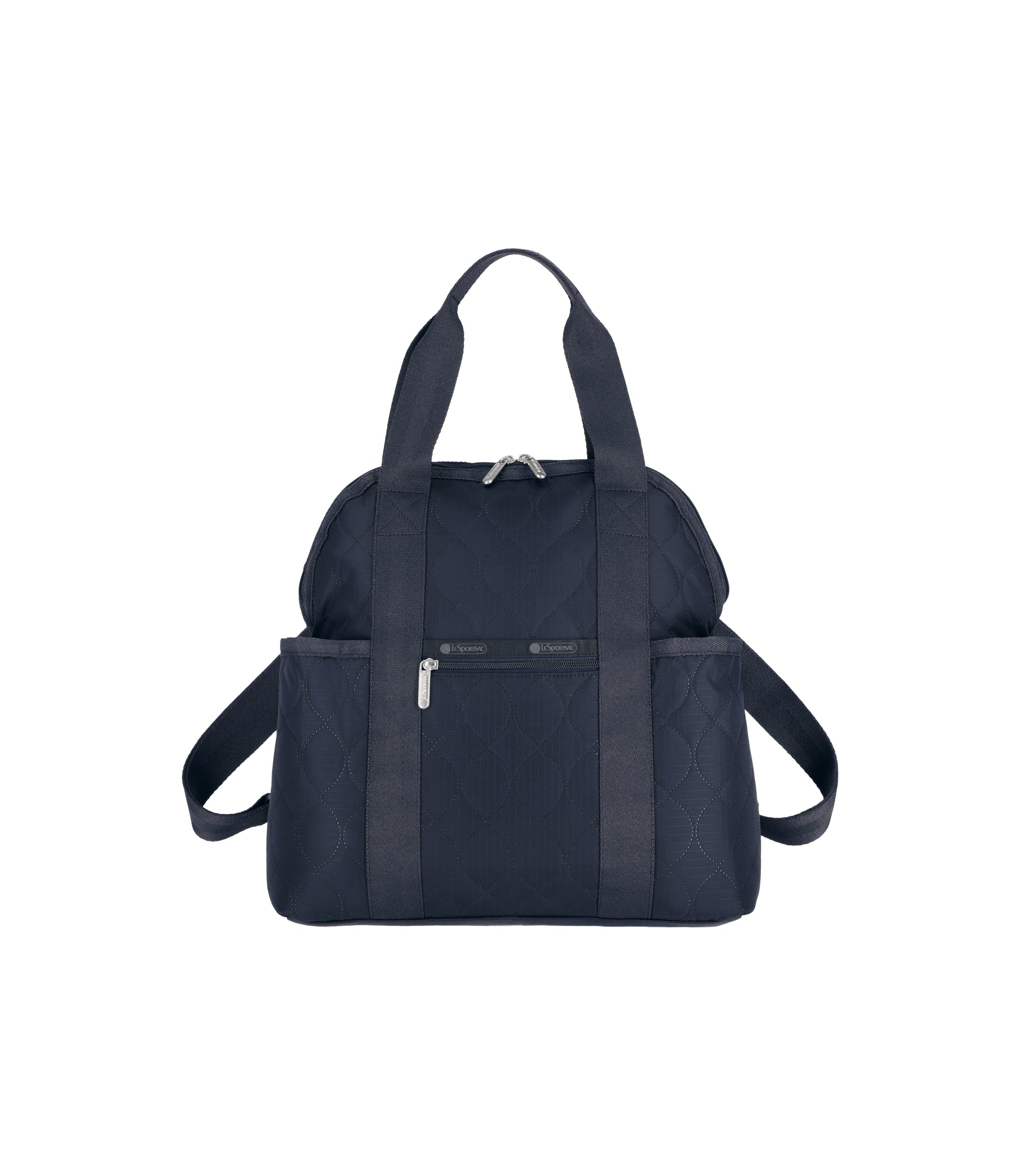 Zip top main closure with dual zipper pulls, Pinched top handles with a 6.5in (16.51cm) drop, Exterior front pocket with zip closure, Exterior front open pocket (behind zipper pocket), Two exterior side open top pockets, Exterior back panel zip closure pocket with dual zipper pulls at top and a bottom zipper (to convert pocket into a sleeve to slide over rolling luggage handles), Adjustable shoulder straps, Two interior front wall open mesh pocket, Two interior back wall open mesh pocket, Plastic hardware