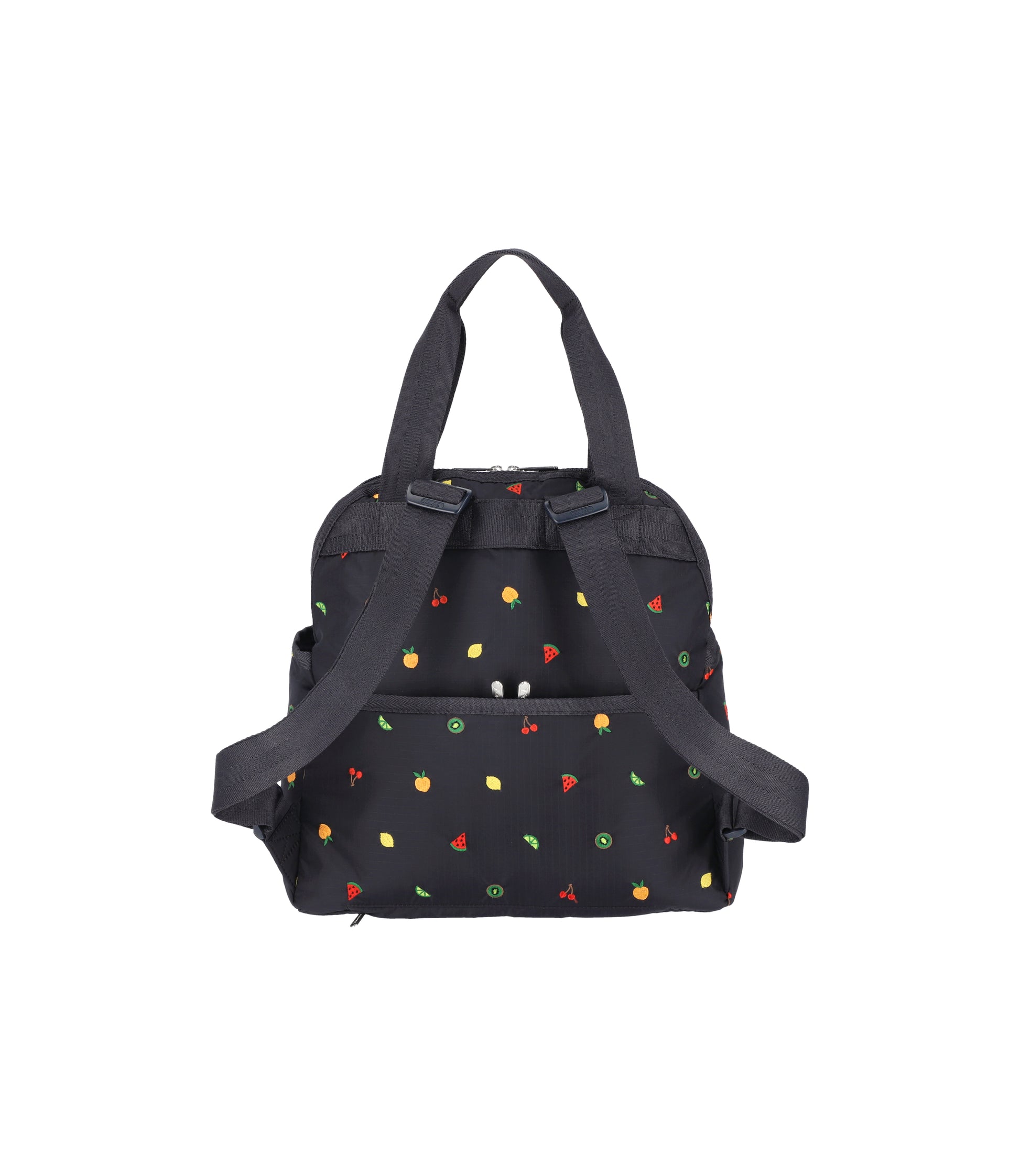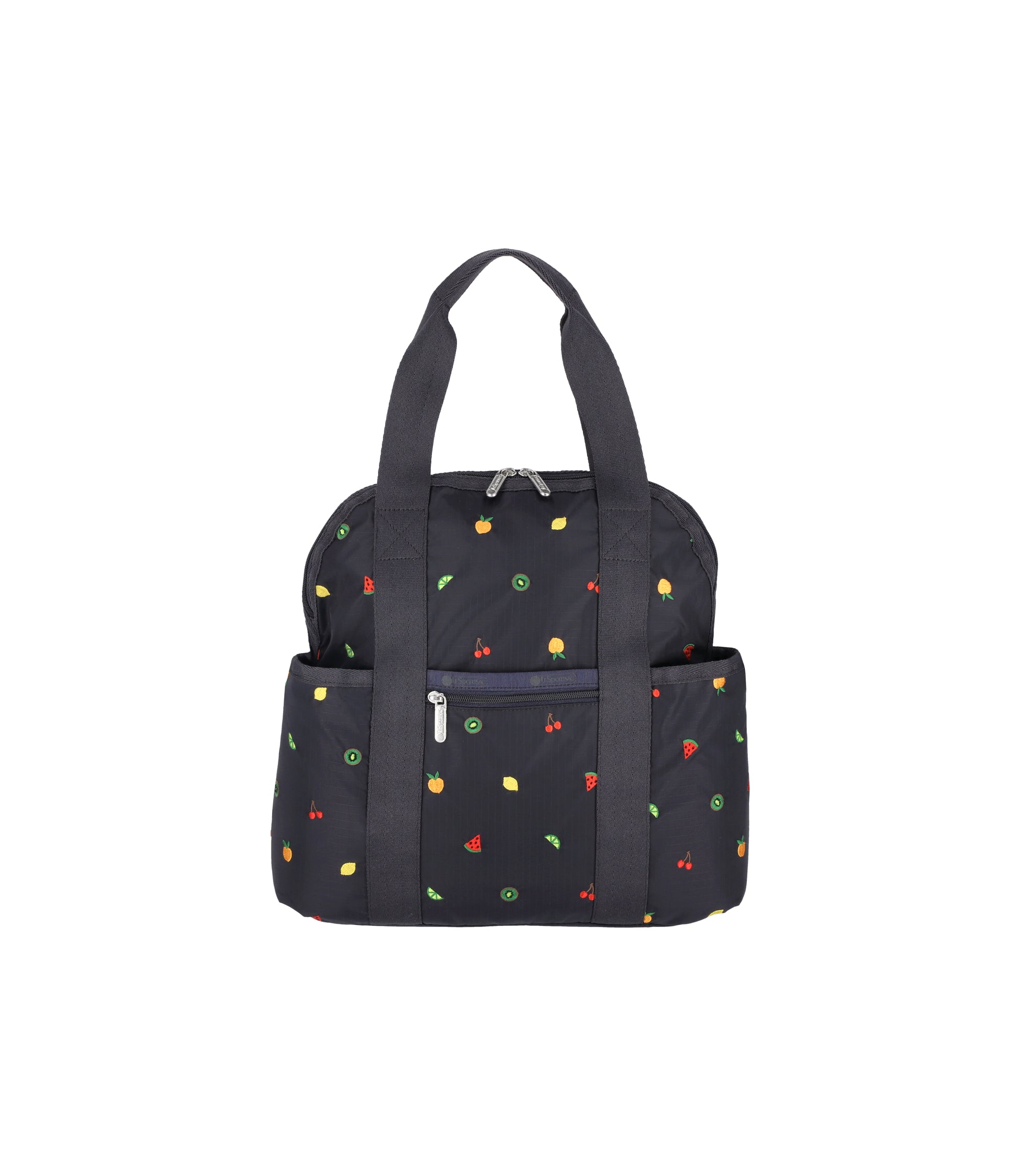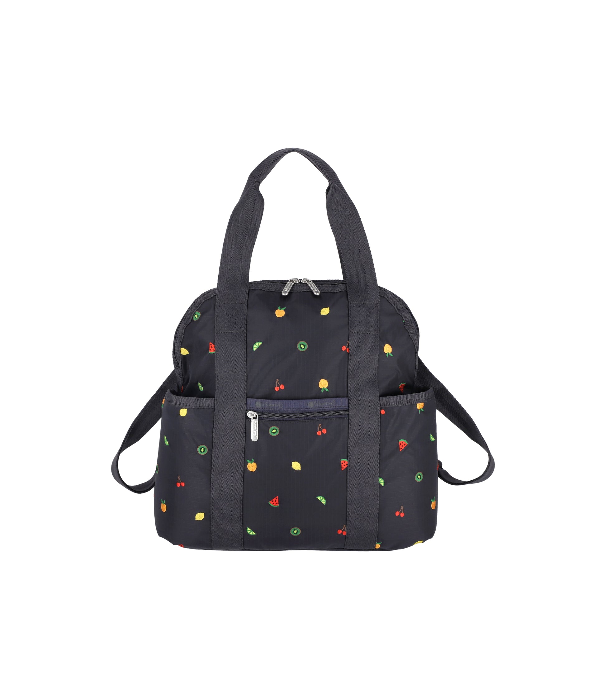 Zip top main closure with dual zipper pulls, Pinched top handles with a 6.5in (16.51cm) drop, Exterior front pocket with zip closure, Exterior front open pocket (behind zipper pocket), Two exterior side open top pockets, Exterior back panel zip closure pocket with dual zipper pulls at top and a bottom zipper (to convert pocket into a sleeve to slide over rolling luggage handles), Adjustable shoulder straps, Two interior front wall open mesh pocket, Two interior back wall open mesh pocket, Plastic hardware.