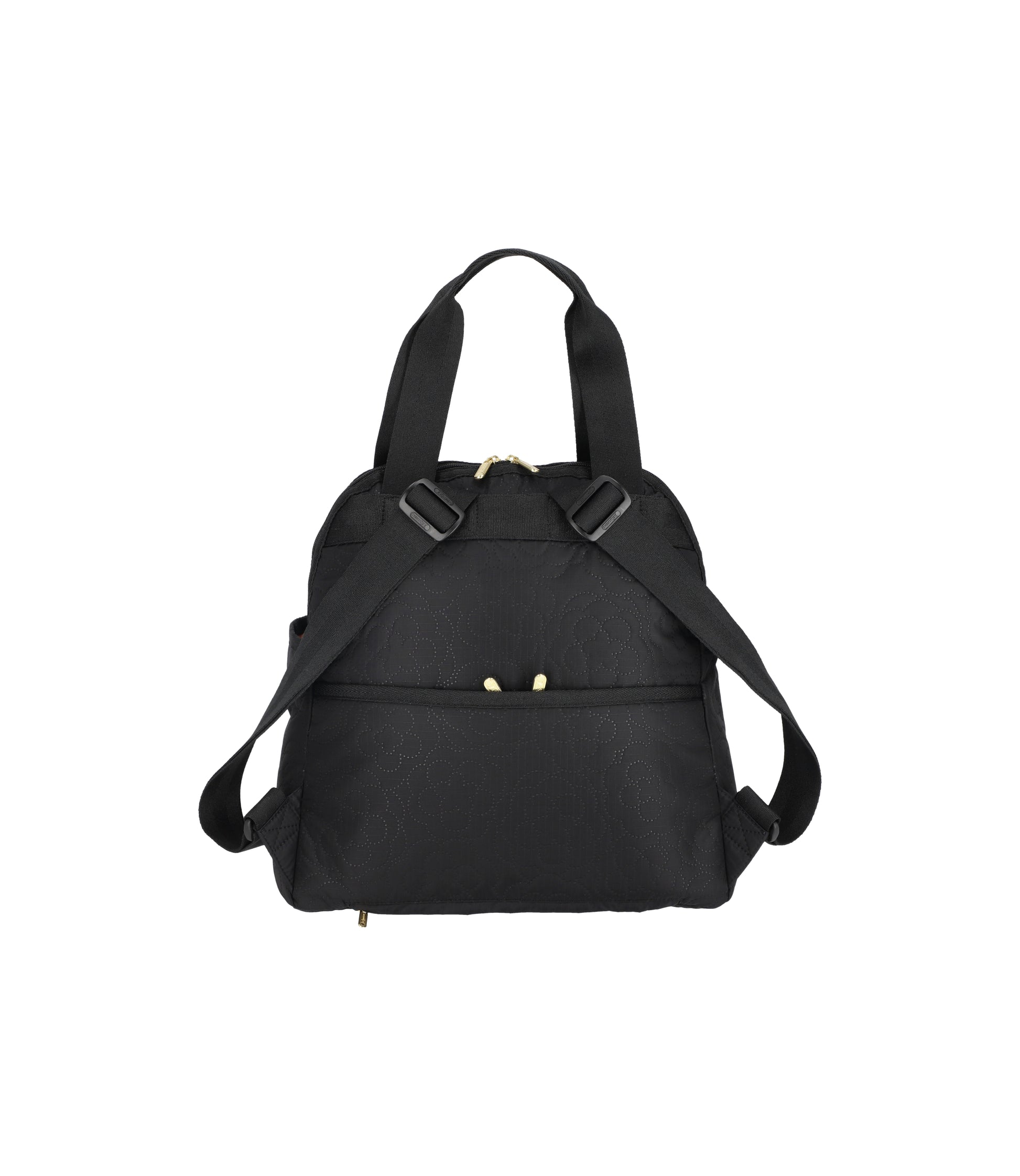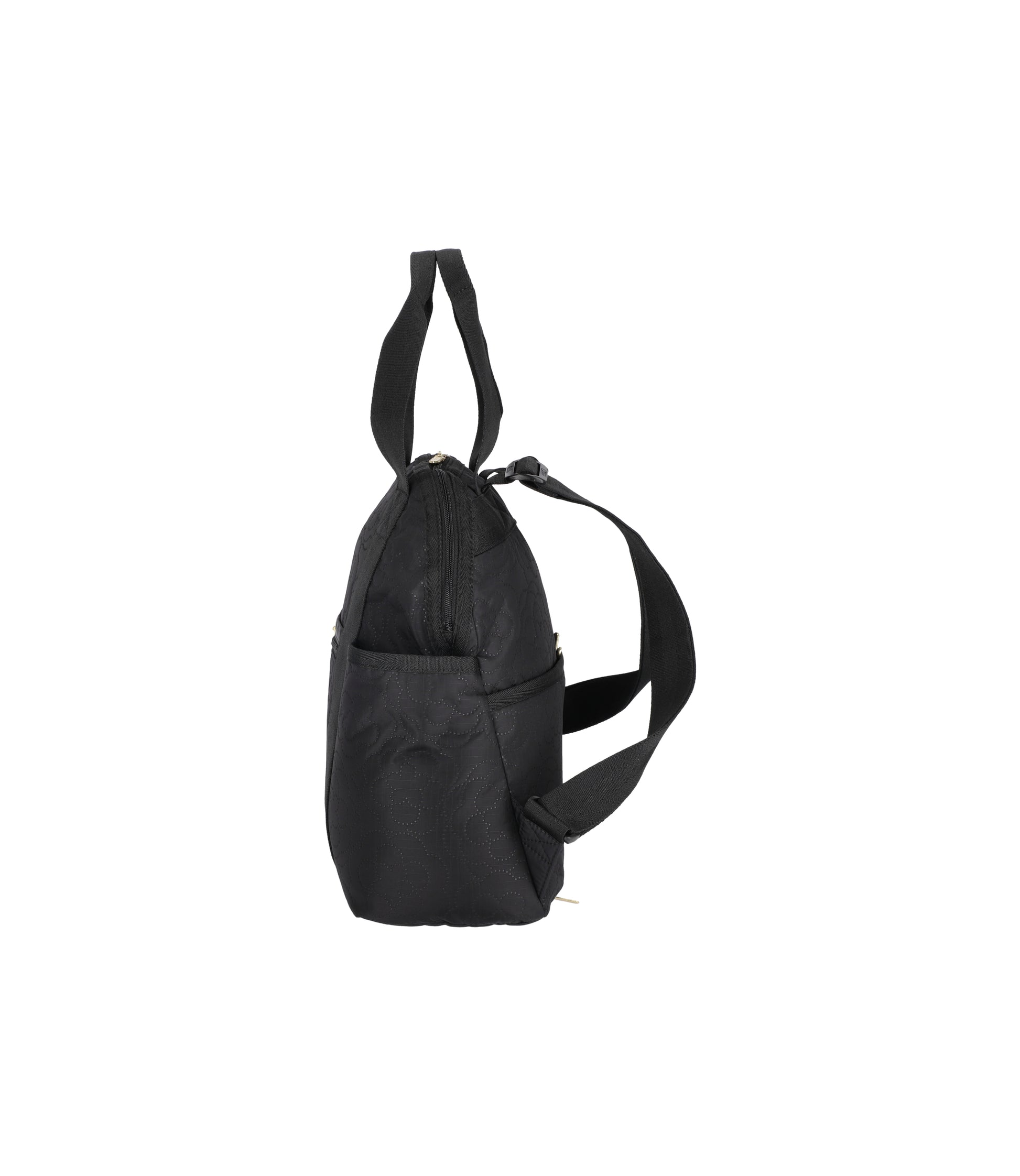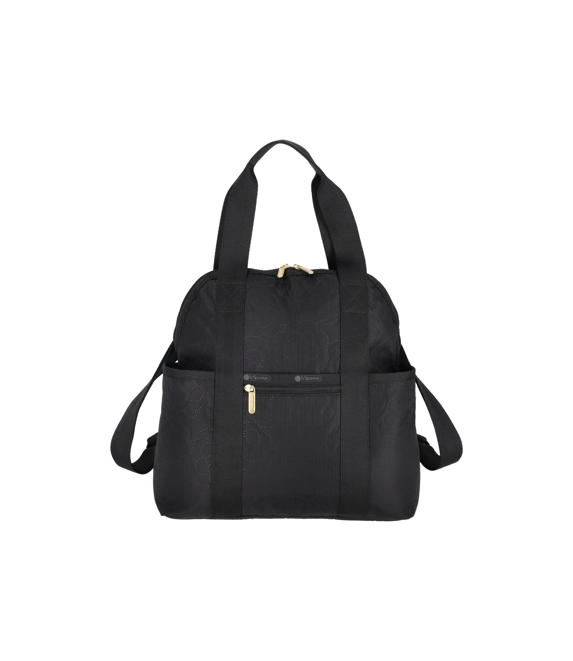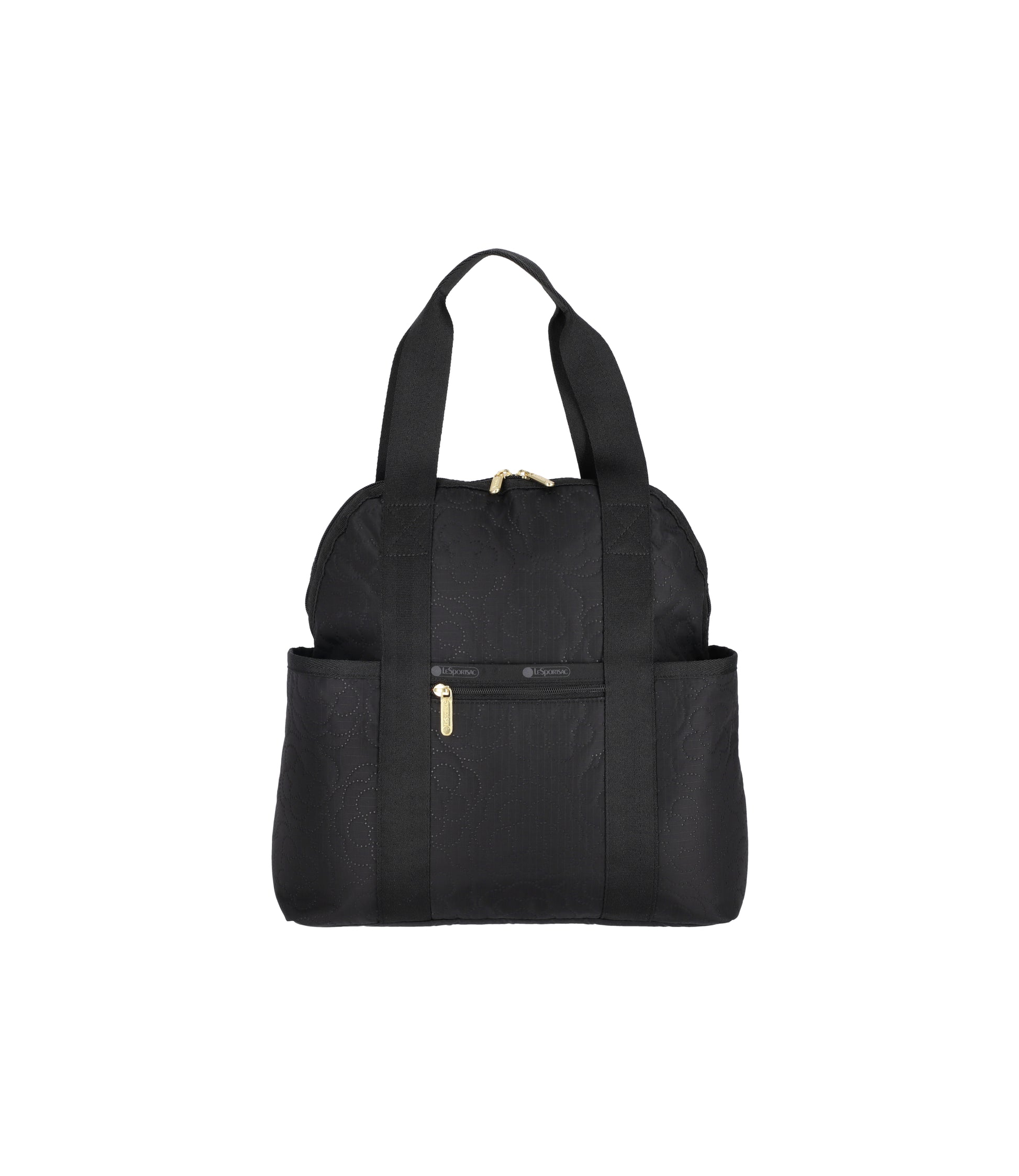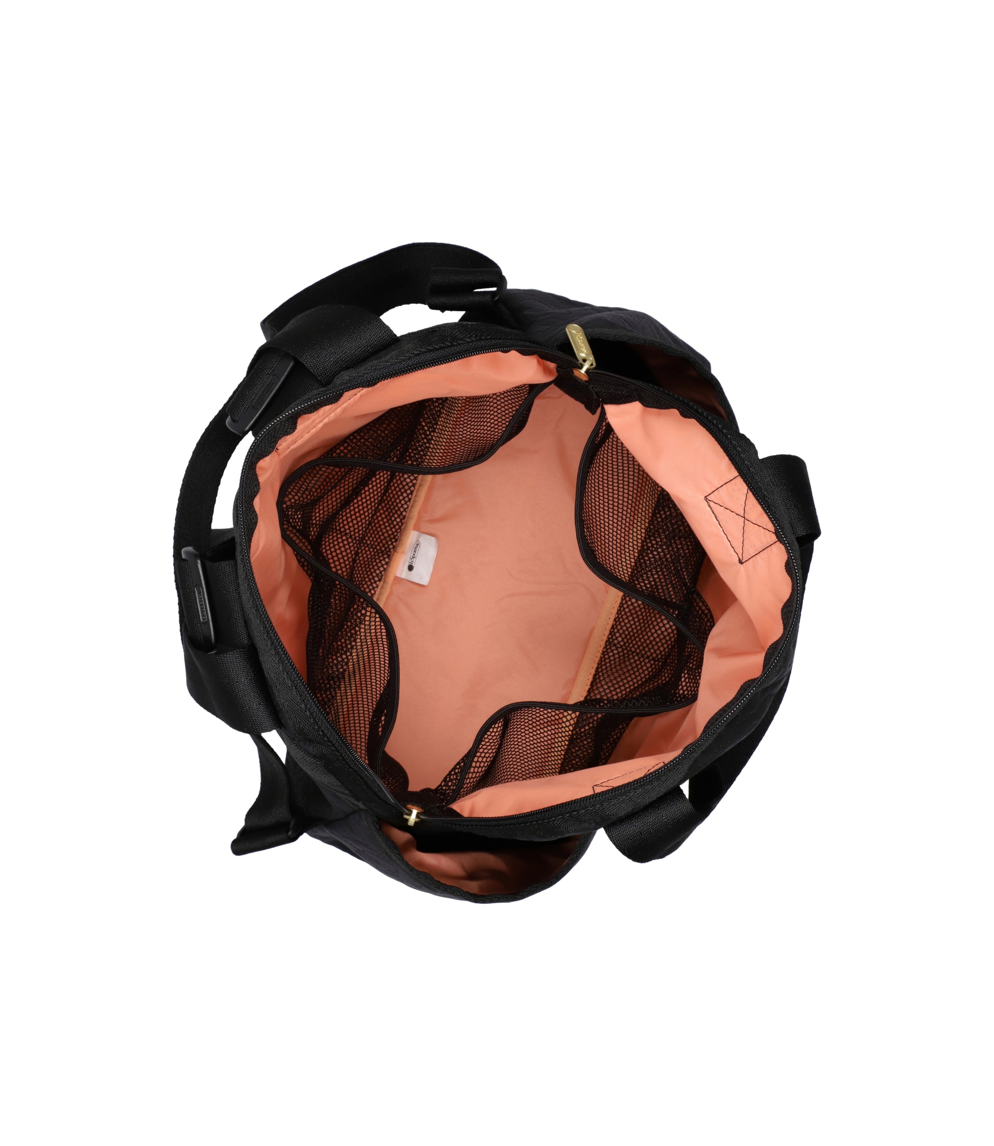 Zip top main closure with dual zipper pulls, Pinched top handles with a 6.5in (16.51cm) drop, Exterior front pocket with zip closure, Exterior front open pocket (behind zipper pocket), Two exterior side open top pockets, Exterior back panel zip closure pocket with dual zipper pulls at top and a bottom zipper (to convert pocket into a sleeve to slide over rolling luggage handles), Adjustable shoulder straps, Two interior front wall open mesh pocket, Two interior back wall open mesh pocket, Plastic hardware