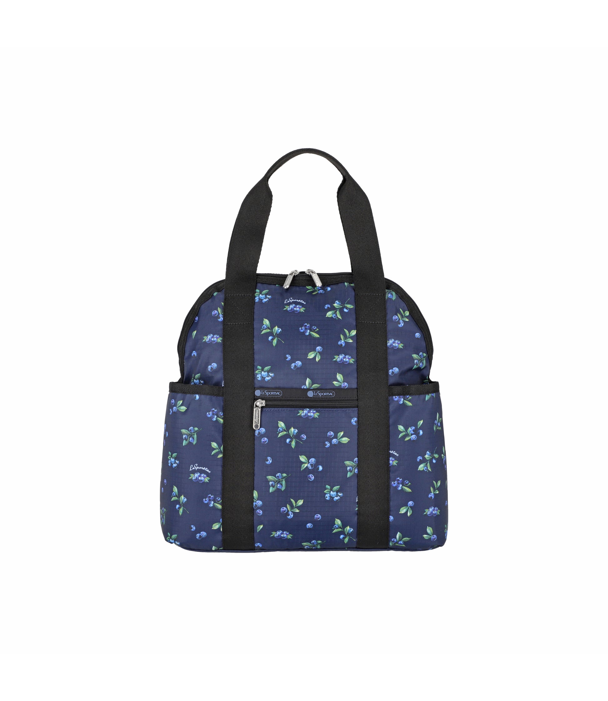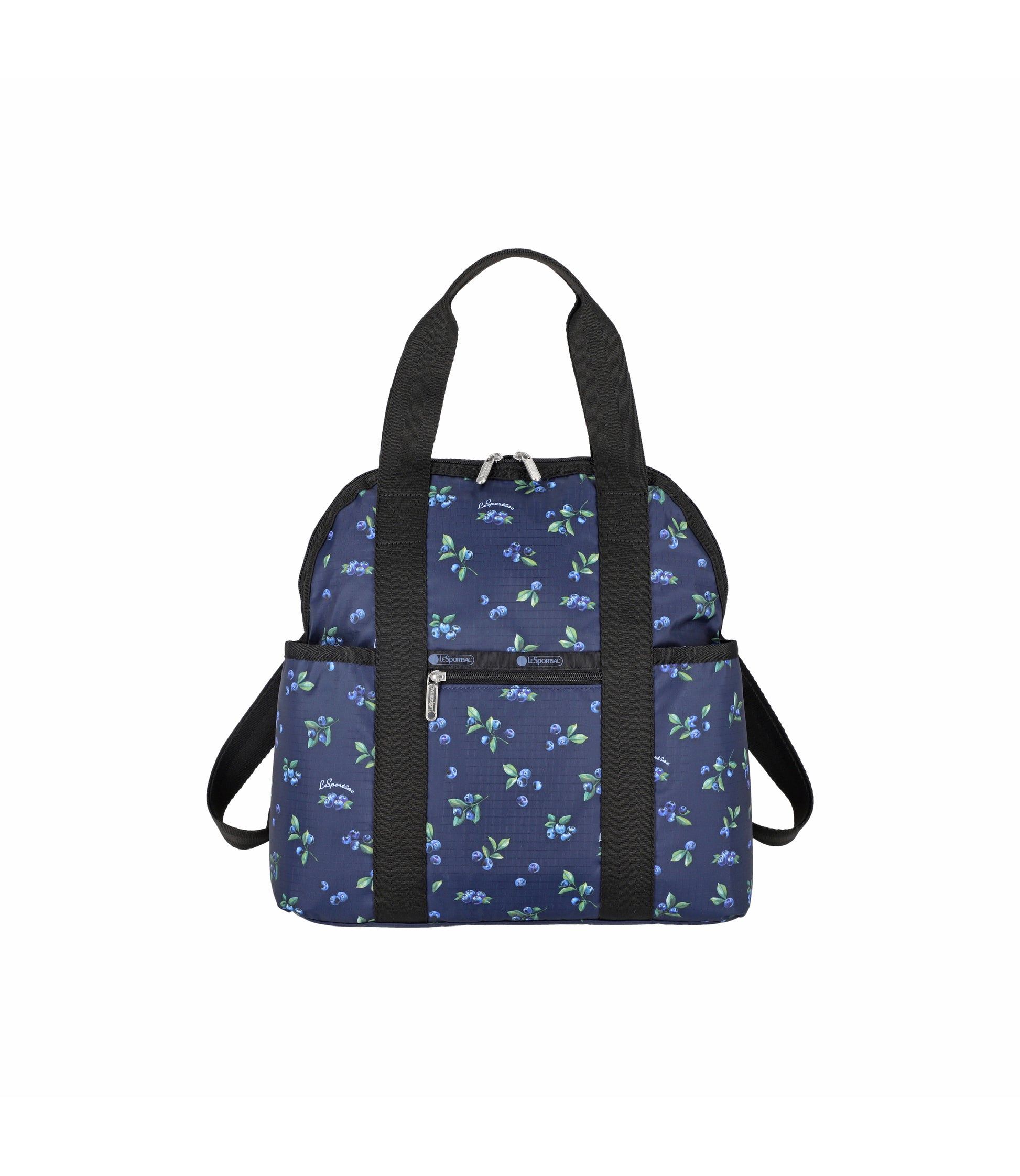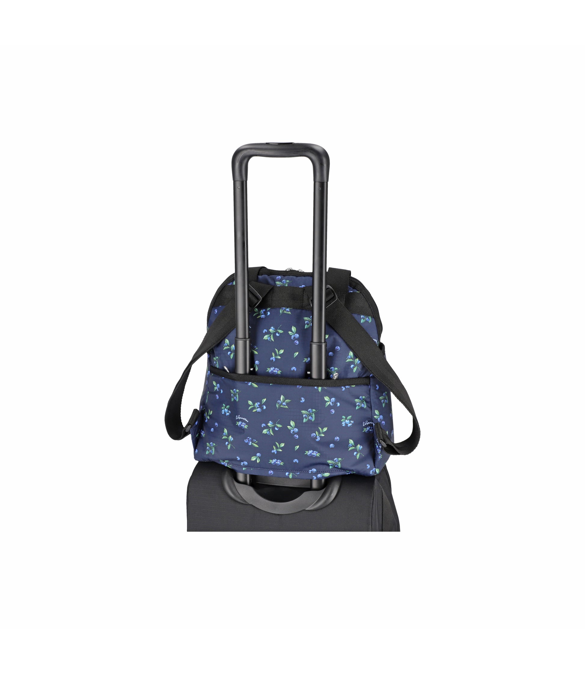 Zip top main closure with dual zipper pulls, Pinched top handles with a 6.5in (16.51cm) drop, Exterior front pocket with zip closure, Exterior front open pocket (behind zipper pocket), Two exterior side open top pockets, Exterior back panel zip closure pocket with dual zipper pulls at top and a bottom zipper (to convert pocket into a sleeve to slide over rolling luggage handles), Adjustable shoulder straps, Two interior front wall open mesh pocket, Two interior back wall open mesh pocket, Plastic hardware