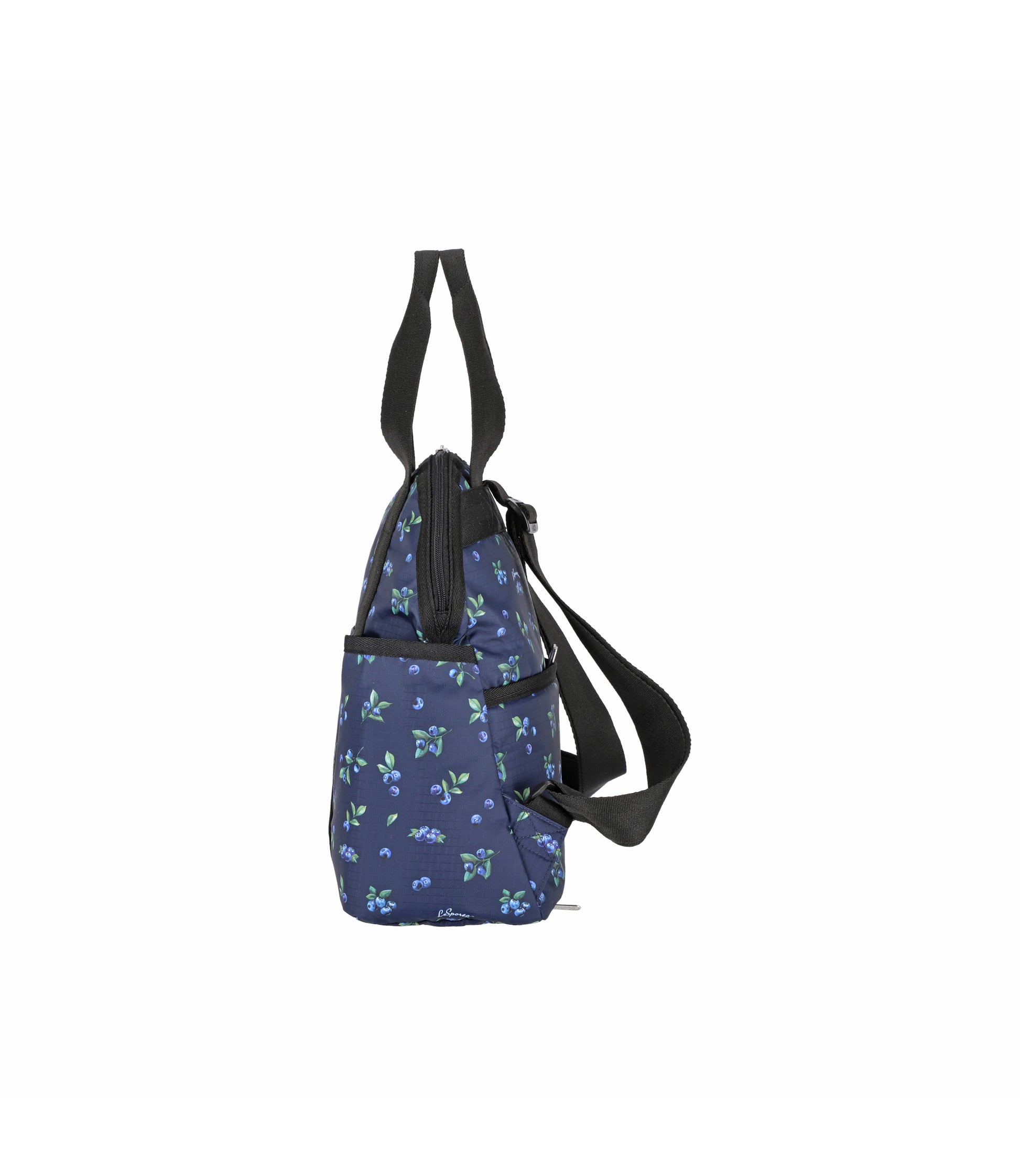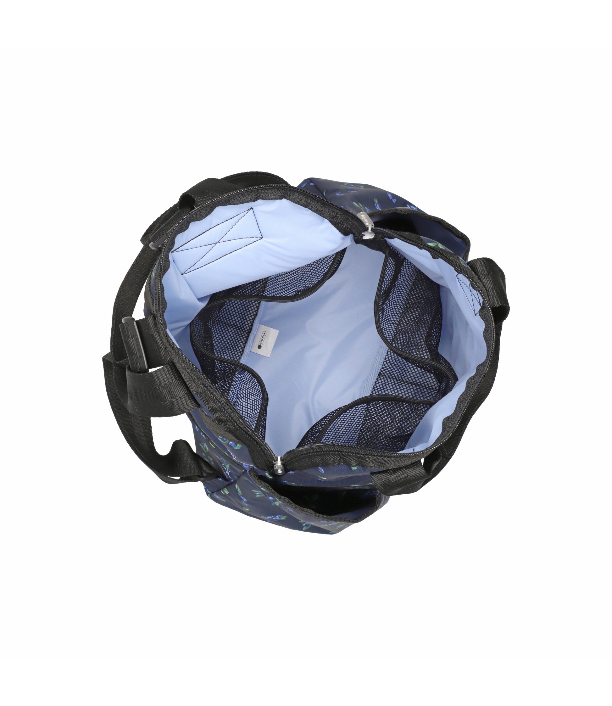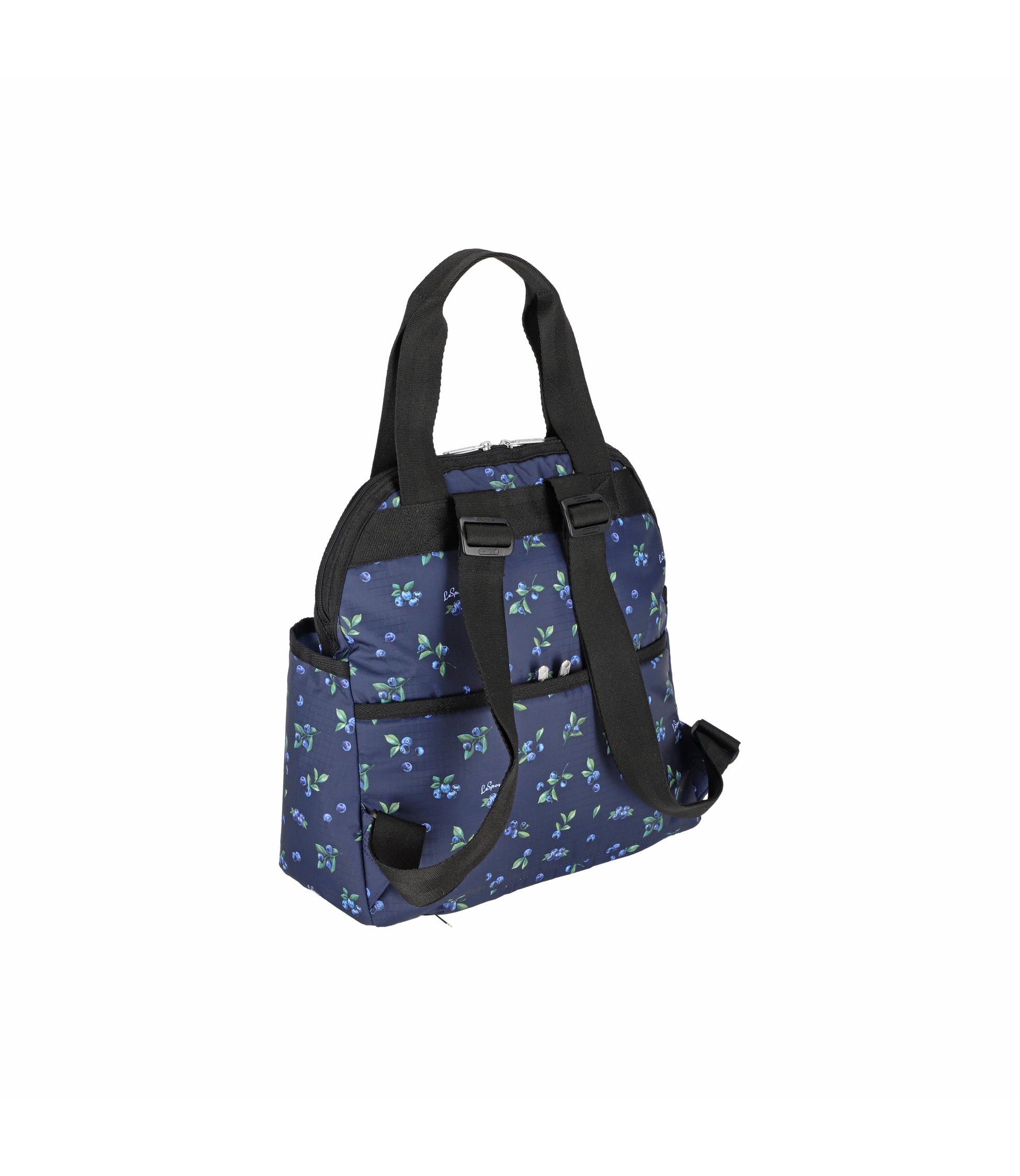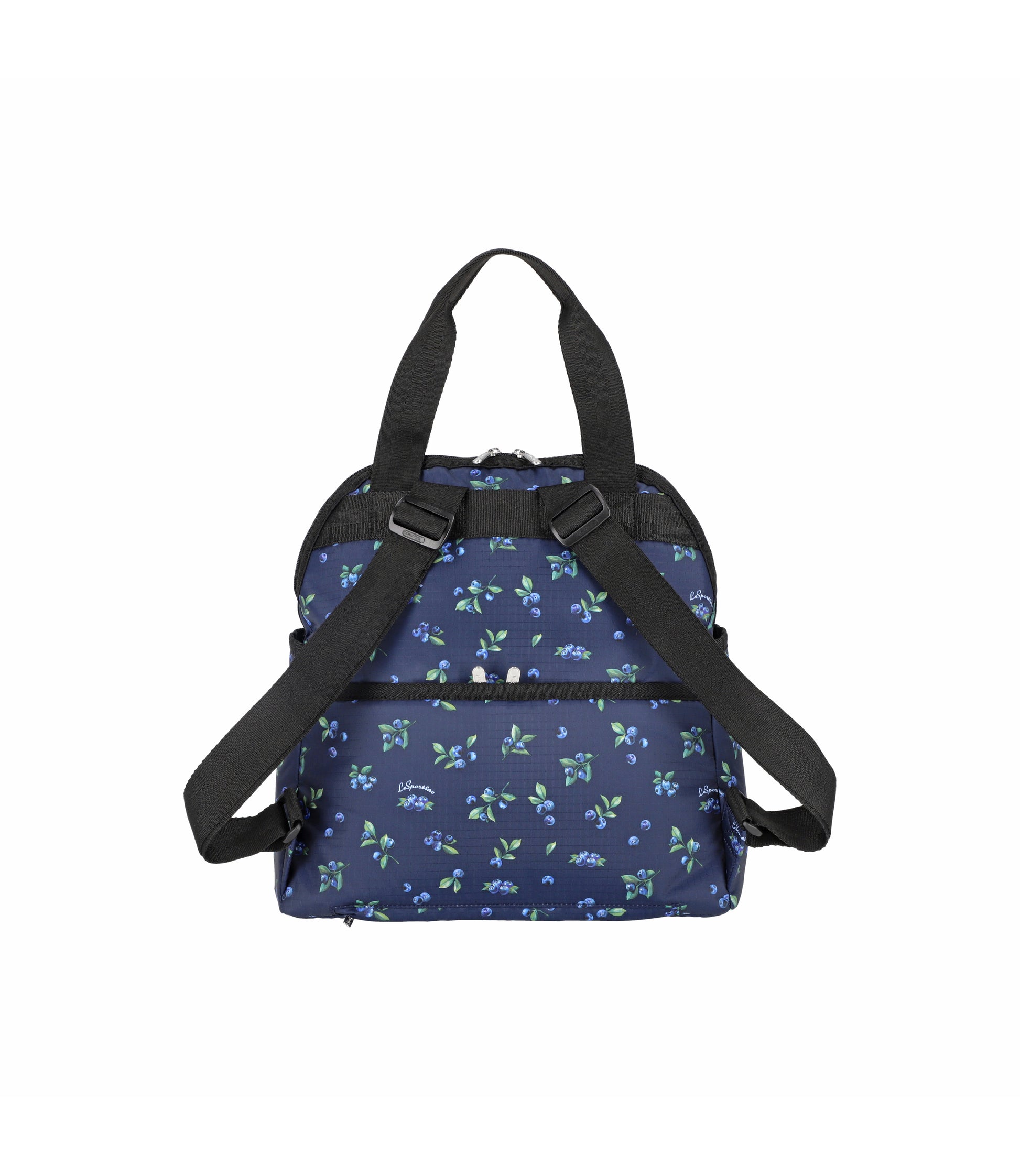 Zip top main closure with dual zipper pulls, Pinched top handles with a 6.5in (16.51cm) drop, Exterior front pocket with zip closure, Exterior front open pocket (behind zipper pocket), Two exterior side open top pockets, Exterior back panel zip closure pocket with dual zipper pulls at top and a bottom zipper (to convert pocket into a sleeve to slide over rolling luggage handles), Adjustable shoulder straps, Two interior front wall open mesh pocket, Two interior back wall open mesh pocket, Plastic hardware