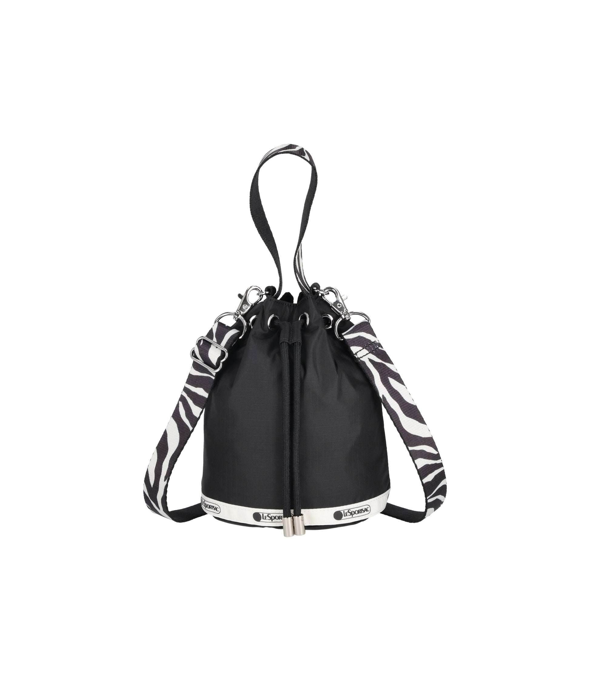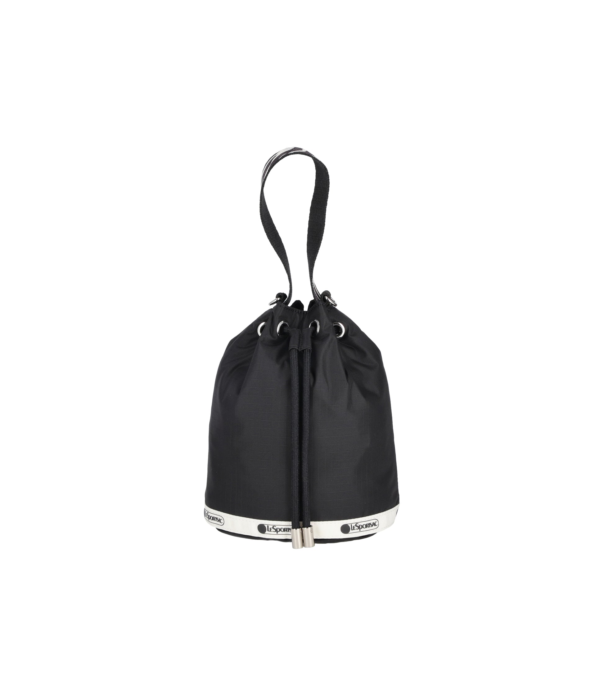 Top Handle Drawstring Bucket Bag – Features an adjustable, removable webbed strap, drawstring main closure, dual interior front slash pockets, and a back zip pocket for secure storage.