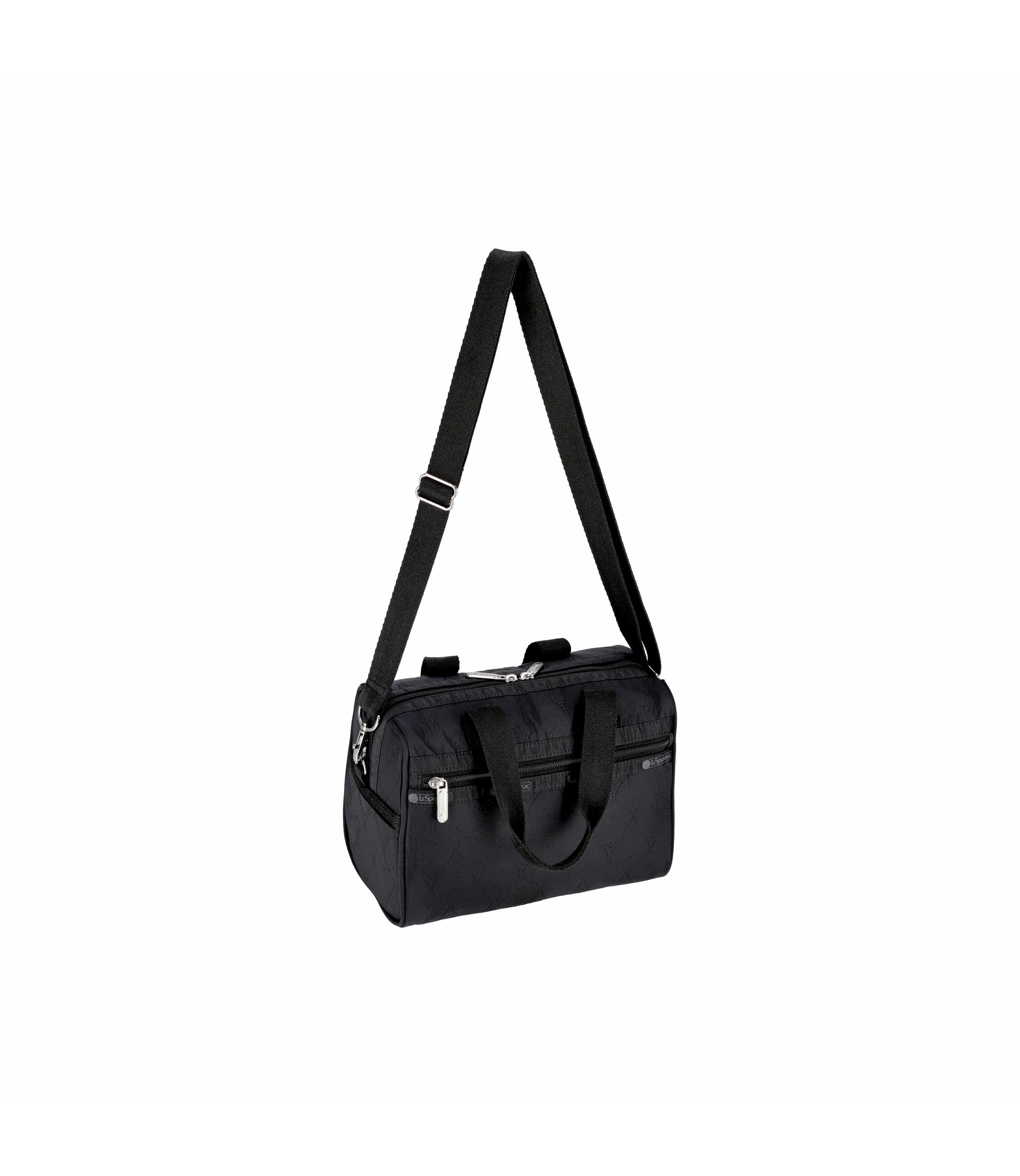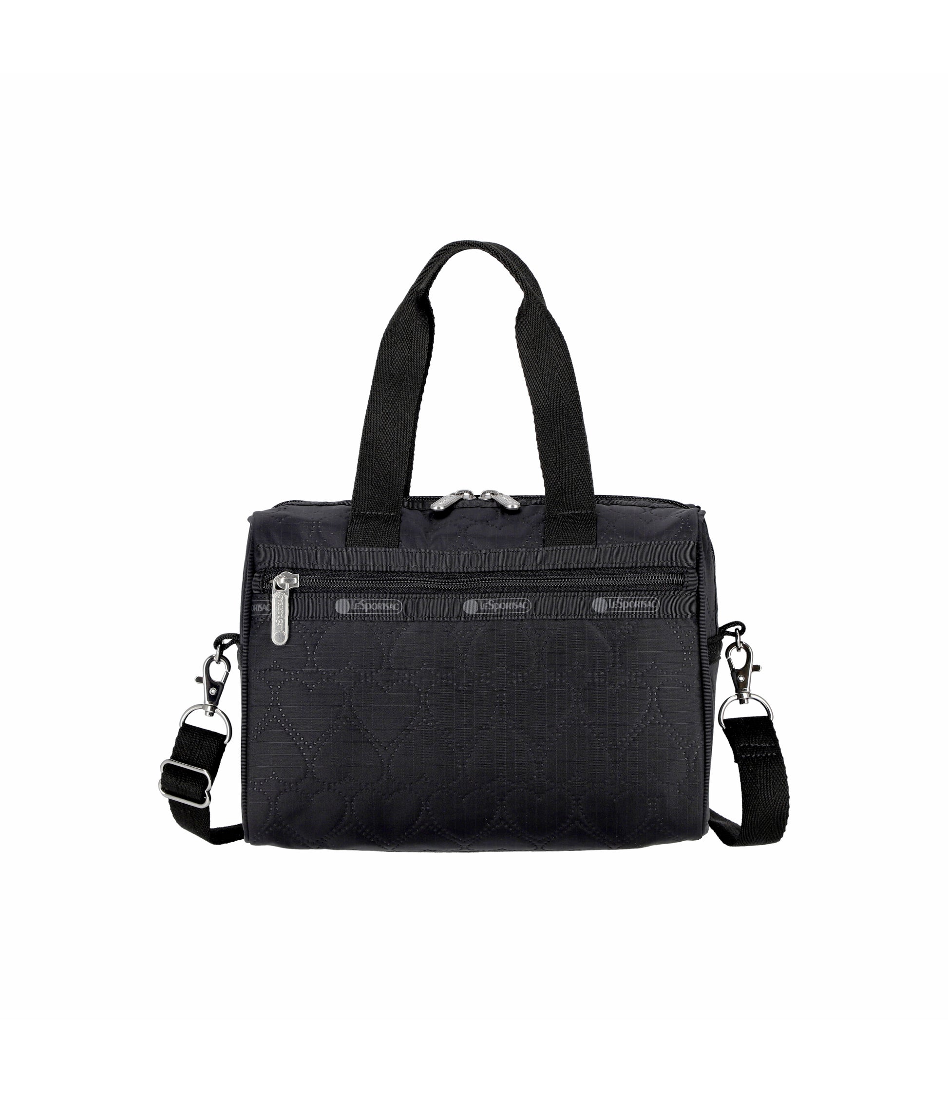Zip top main closure with dual zipper pulls, Exterior front and back zipper pockets, Interior front wall open pocket, Interior back wall combination zip/open pocket, 1in/2.5cm wide pinched top handles (Drop: 4.5in/11.4cm), 1in/2.5cm wide adjustable/removable shoulder strap (Min Length: 26in/66cm, Max Length: 50in/127cm).