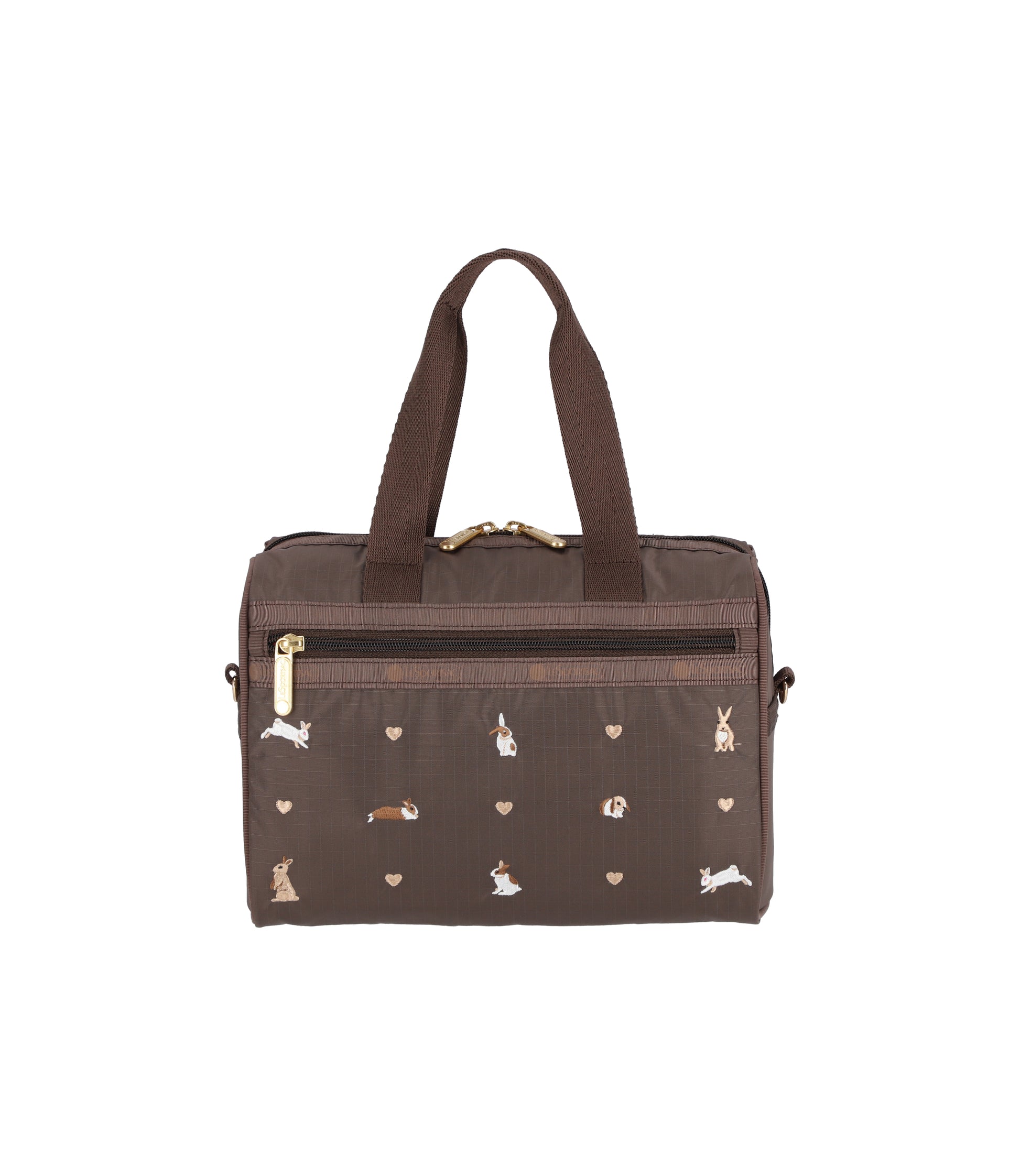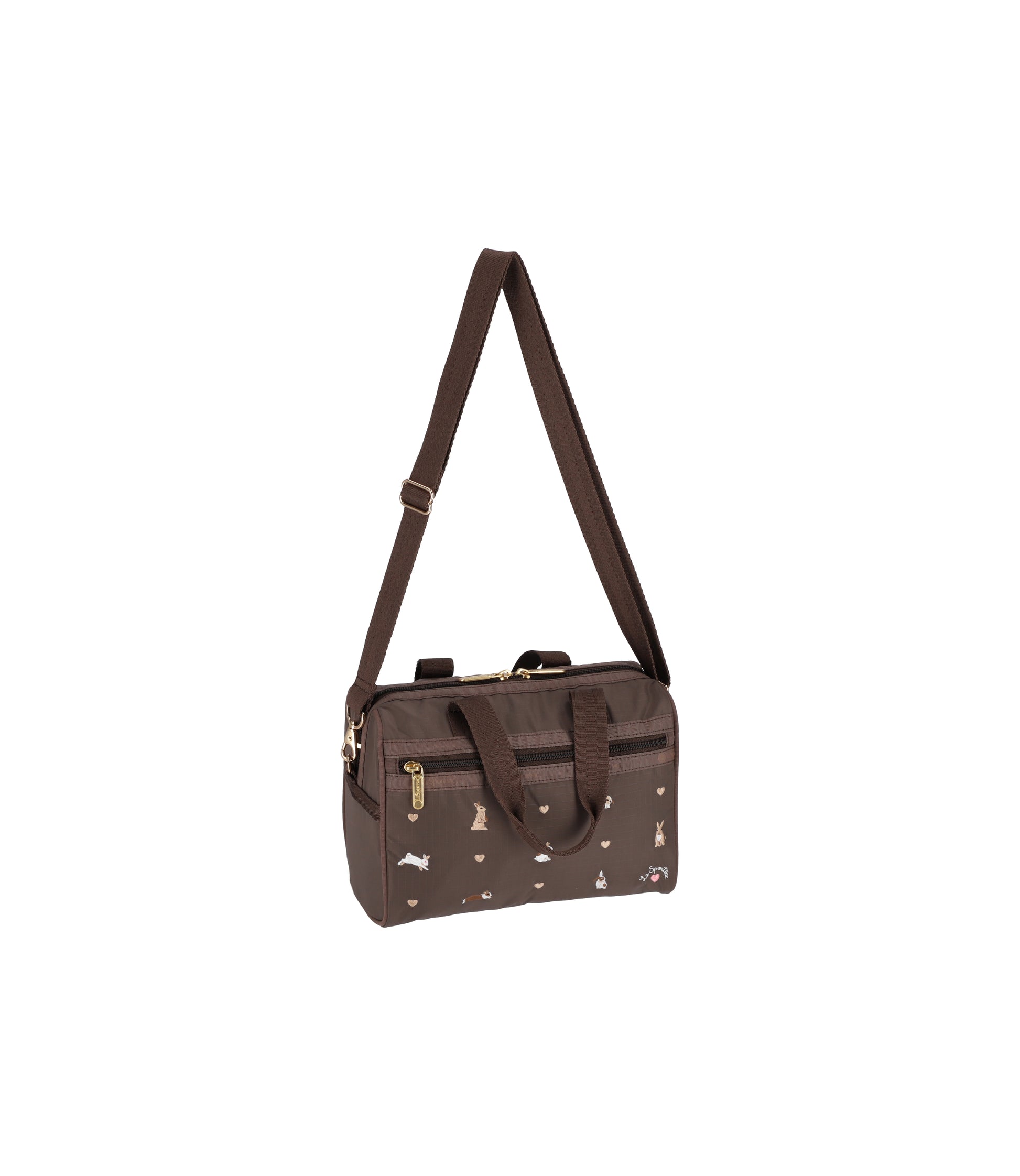 Zip top main closure with dual zipper pulls, Exterior front and back zipper pockets, Interior front wall open pocket, Interior back wall combination zip/open pocket, 1in/2.5cm wide pinched top handles (Drop: 4.5in/11.4cm), 1in/2.5cm wide adjustable/removable shoulder strap (Min Length: 26in/66cm, Max Length: 50in/127cm)