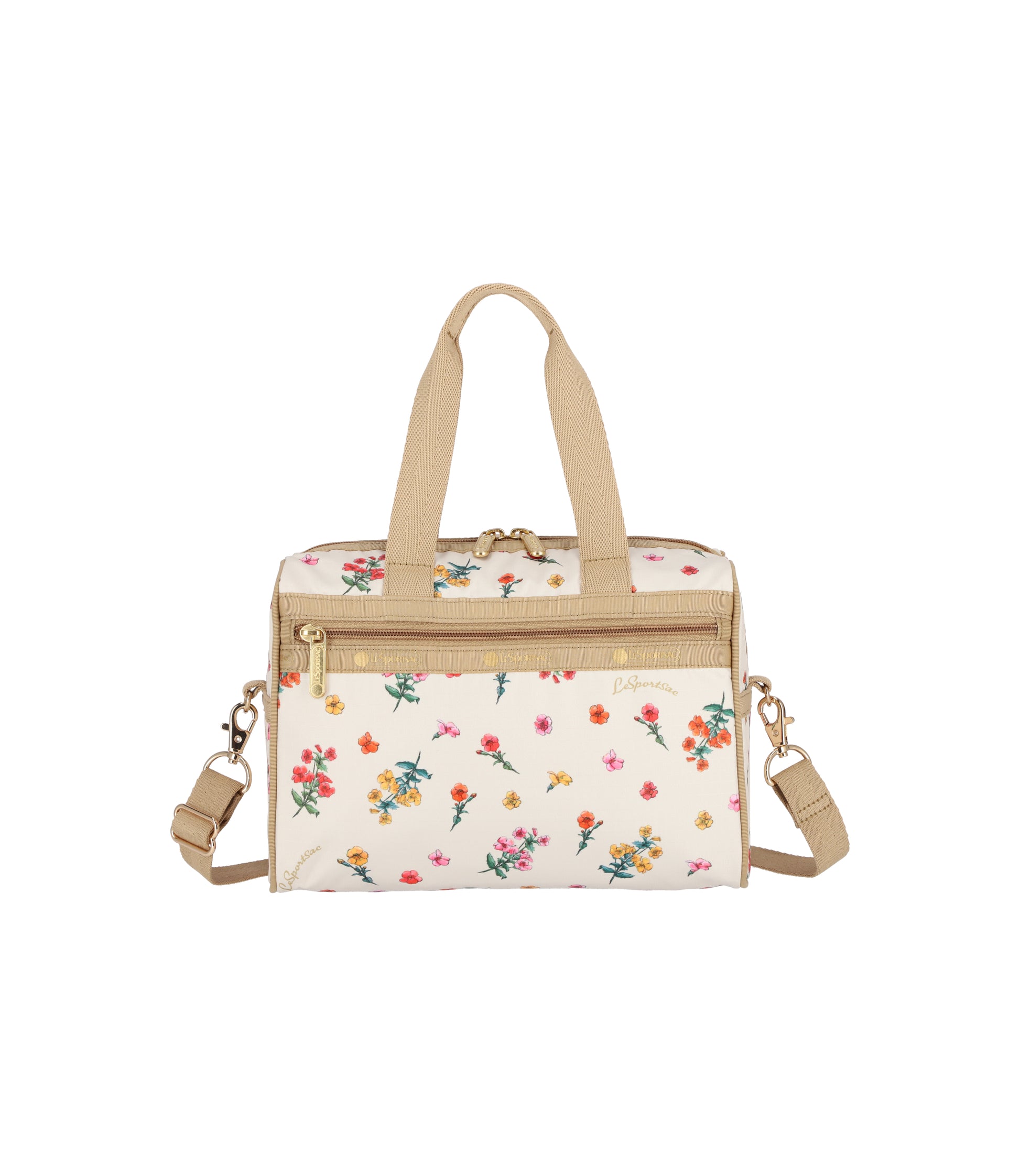 Zip top main closure with dual zipper pulls, Exterior front and back zipper pockets, Interior front wall open pocket, Interior back wall combination zip/open pocket, 1in/2.5cm wide pinched top handles (Drop: 4.5in/11.4cm), 1in/2.5cm wide adjustable/removable shoulder strap (Min Length: 26in/66cm, Max Length: 50in/127cm)