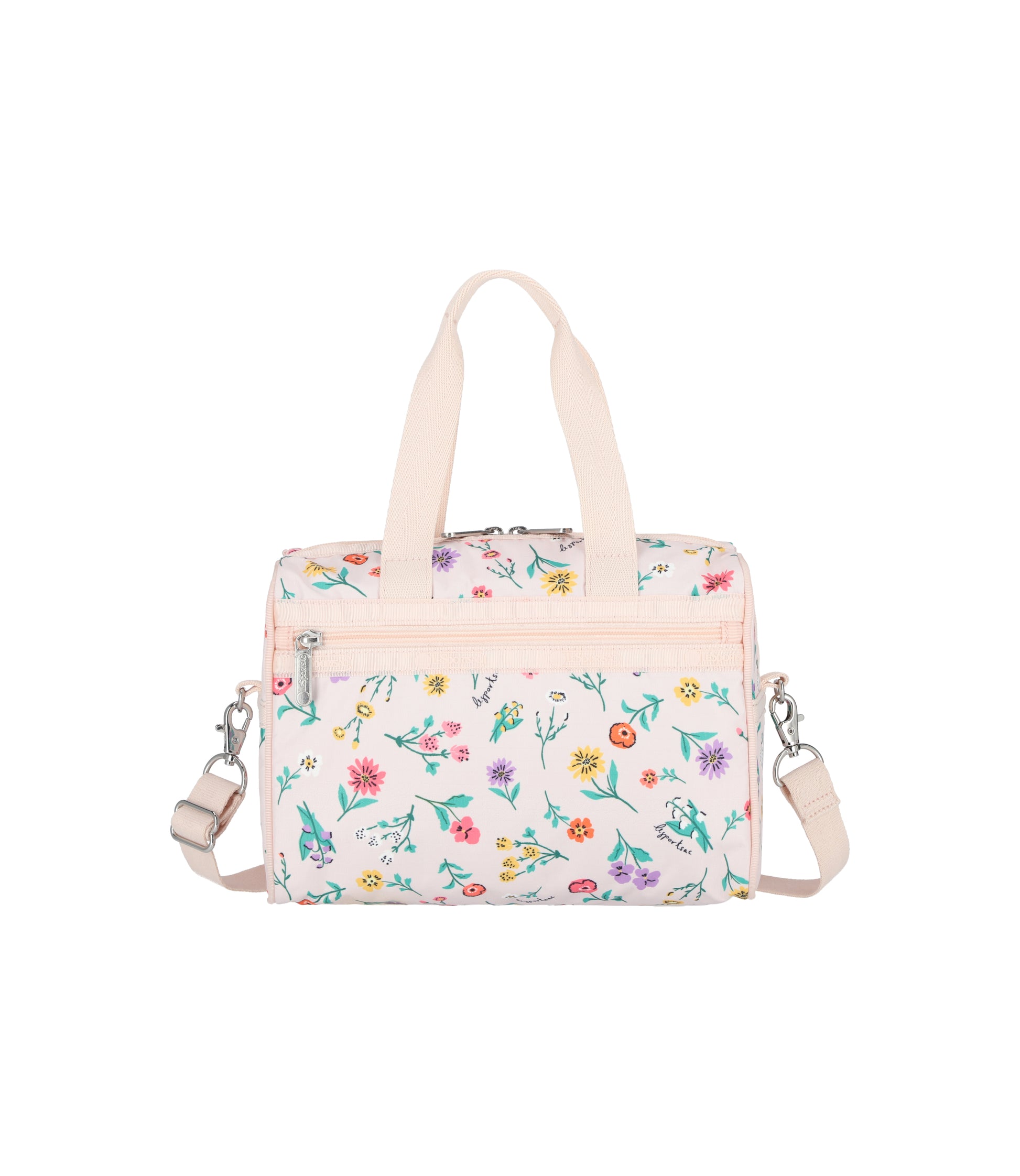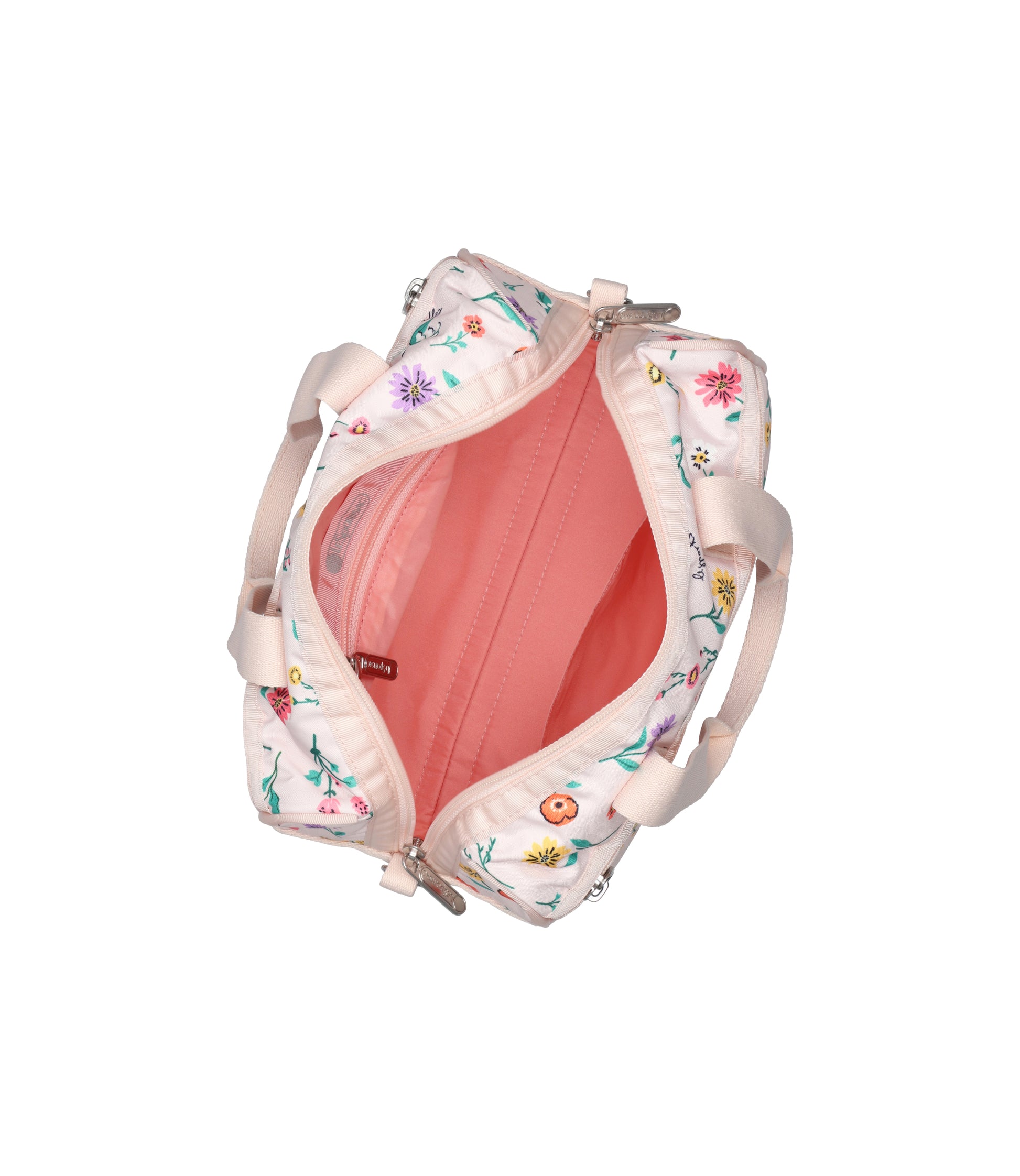 Zip top main closure with dual zipper pulls, Exterior front and back zipper pockets, Interior front wall open pocket, Interior back wall combination zip/open pocket, 1in/2.5cm wide pinched top handles (Drop: 4.5in/11.4cm), 1in/2.5cm wide adjustable/removable shoulder strap (Min Length: 26in/66cm, Max Length: 50in/127cm)