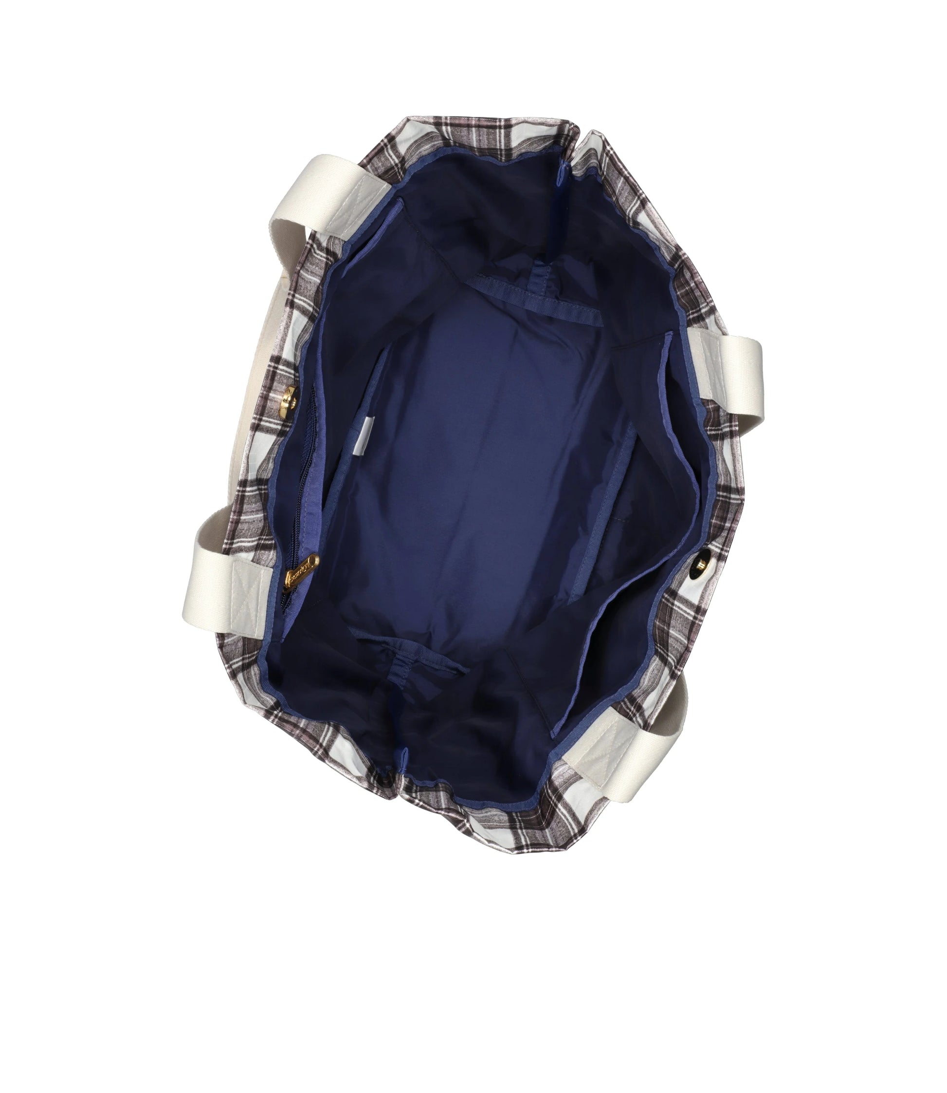 Open top with magnetic snap closure, Exterior back zip pocket, Two interior front wall open pockets, Interior back wall zip pocket, 1.5in/3.8cm wide pinched top handles (Drop:9in/23cm), Hidden magnets in top corners to adjust the shape of the bag opening