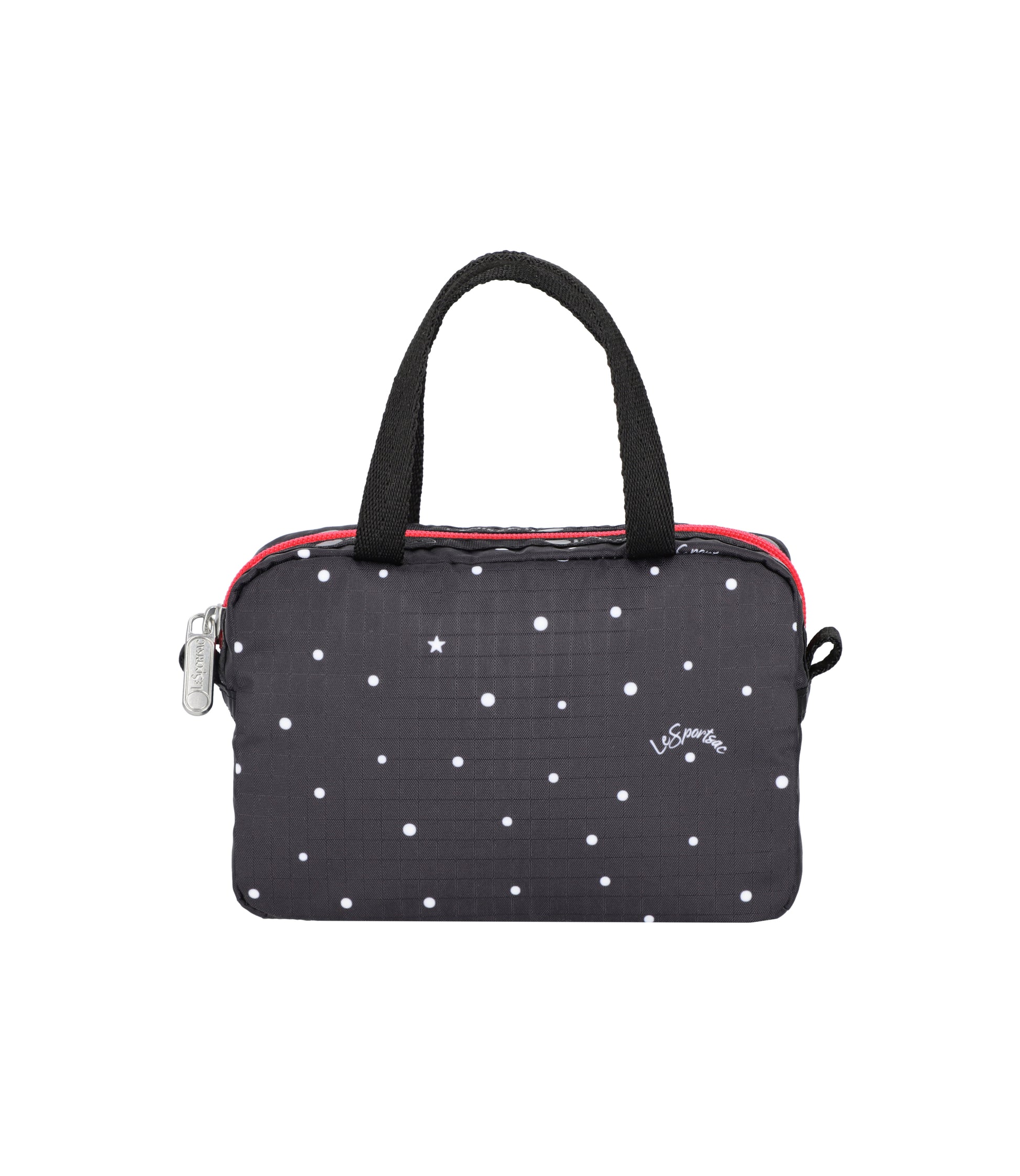 Zip top closure, 3.25in (8.89cm) handle drop, Two Interior back wall open pockets, Exterior webbing side loops.
