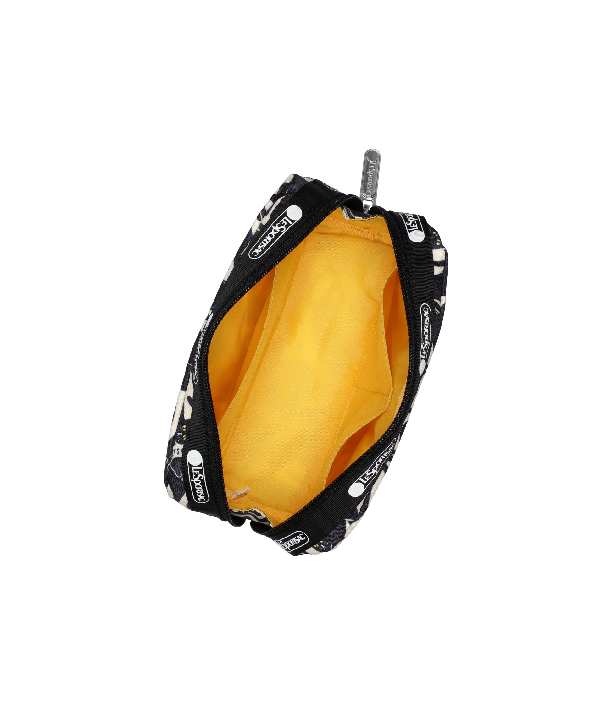 Zipped main closure, Interior back wall open pocket, Two interior front wall open pockets