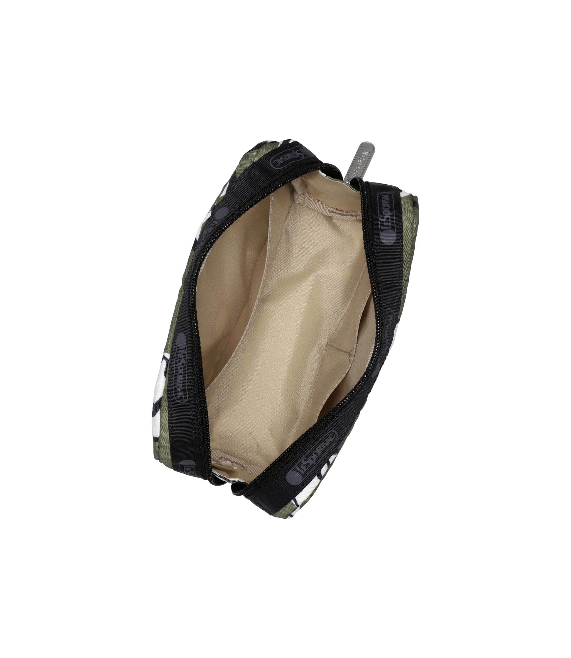 Zipped main closure, Interior back wall open pocket, Two interior front wall open pockets