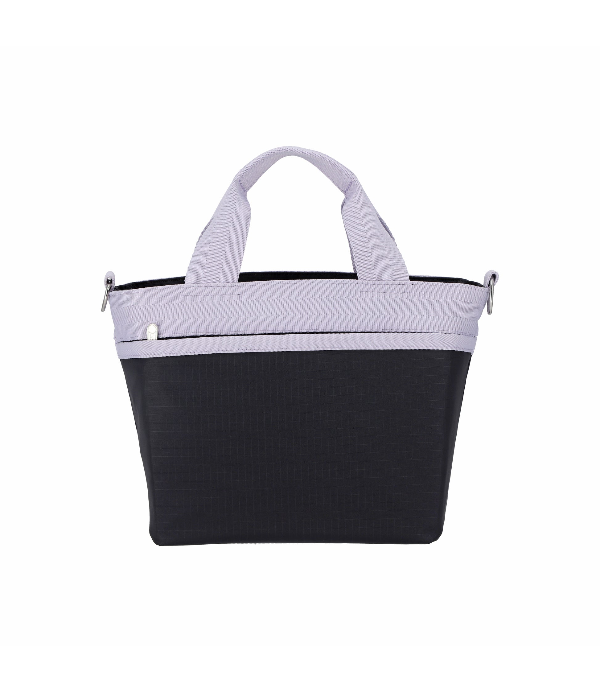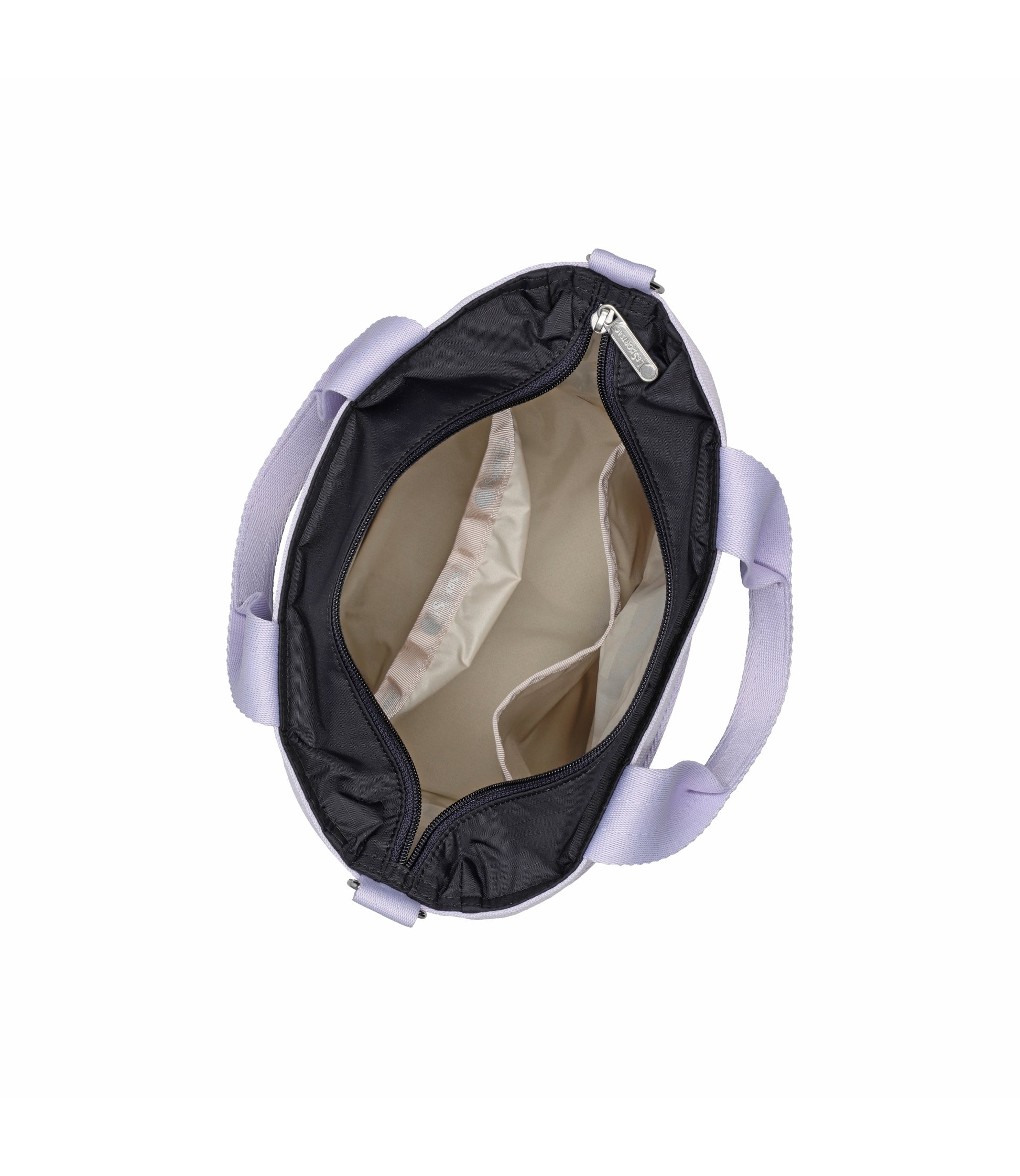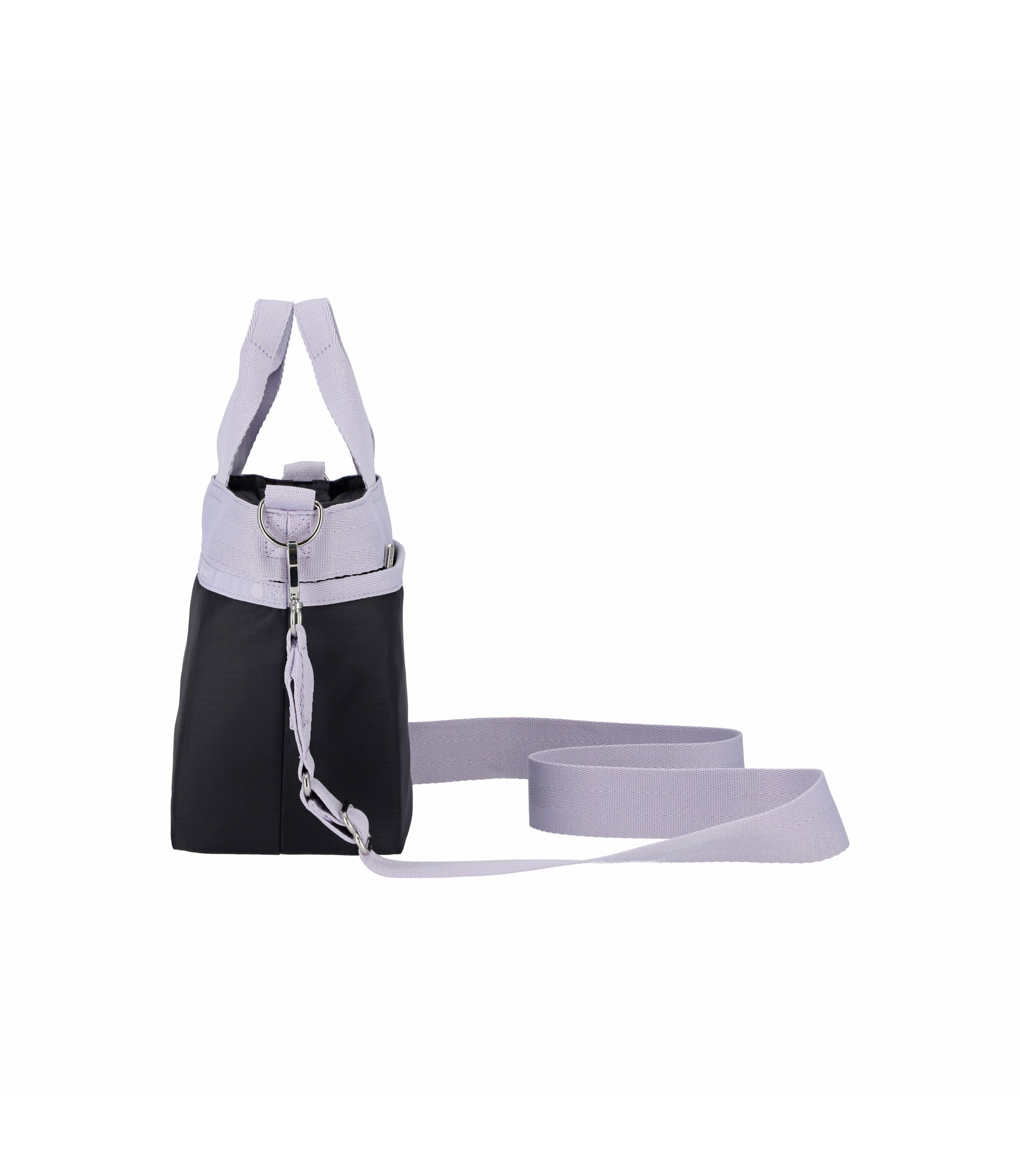 The Small Bucket Tote has a zipped main closure with an exterior front zip pocket, interior front double slash pockets and one interior back slash pocket. The top handle pinched webbing straps are 3.81 cm in width with a drop 10 cm and a length of 26 cm. The 1.5 inch adjustable/detachable crossbody strap has a maximum length of 113 cm and a minimum length of 65 cm.