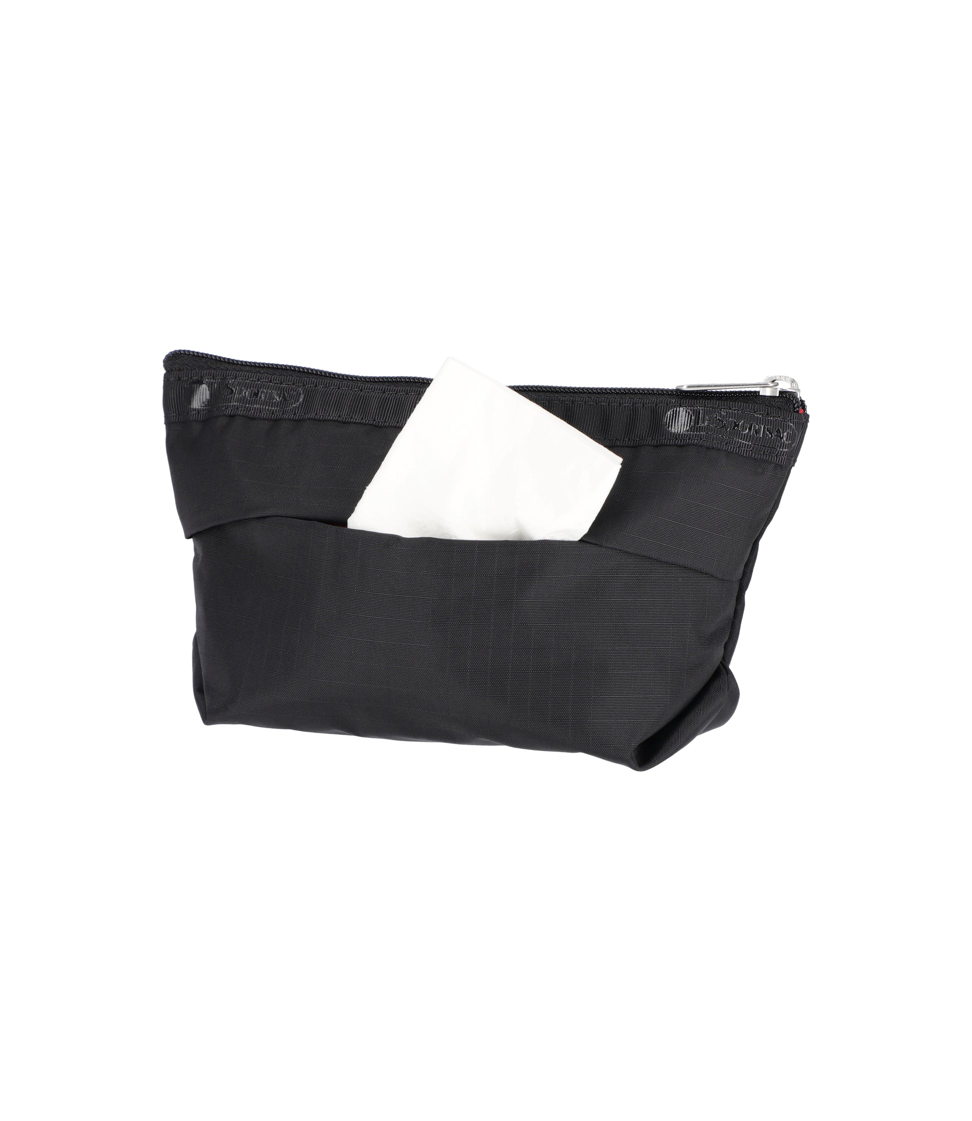 Zip top main closure, Exterior back panel tissue pocket (tissues not included)