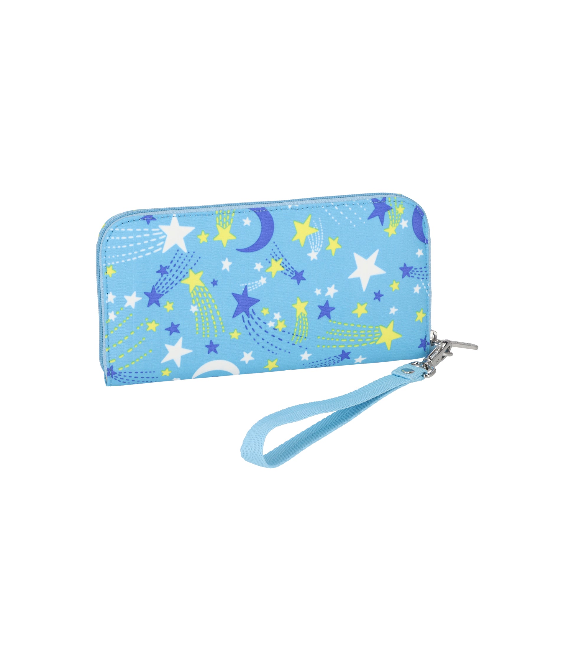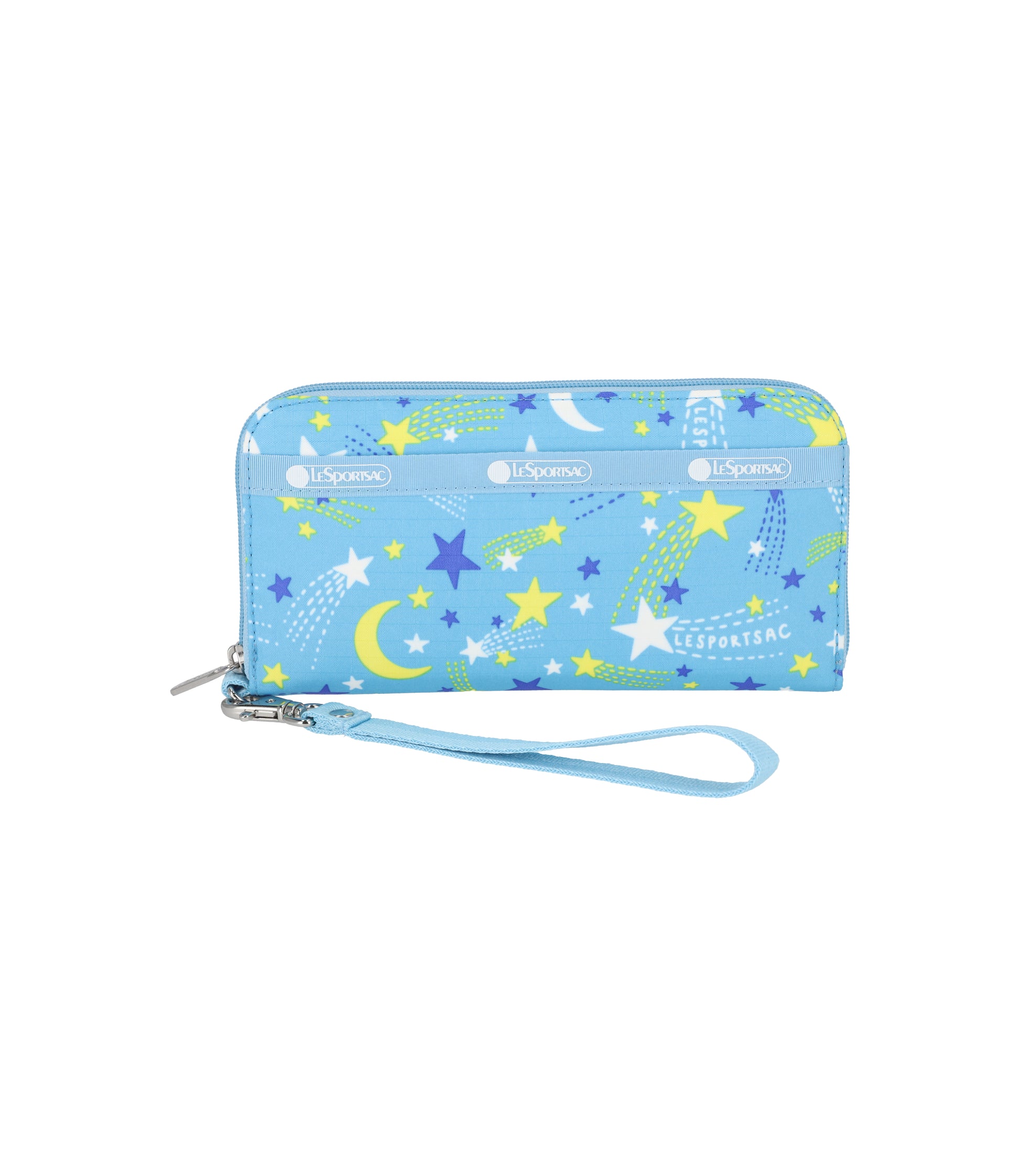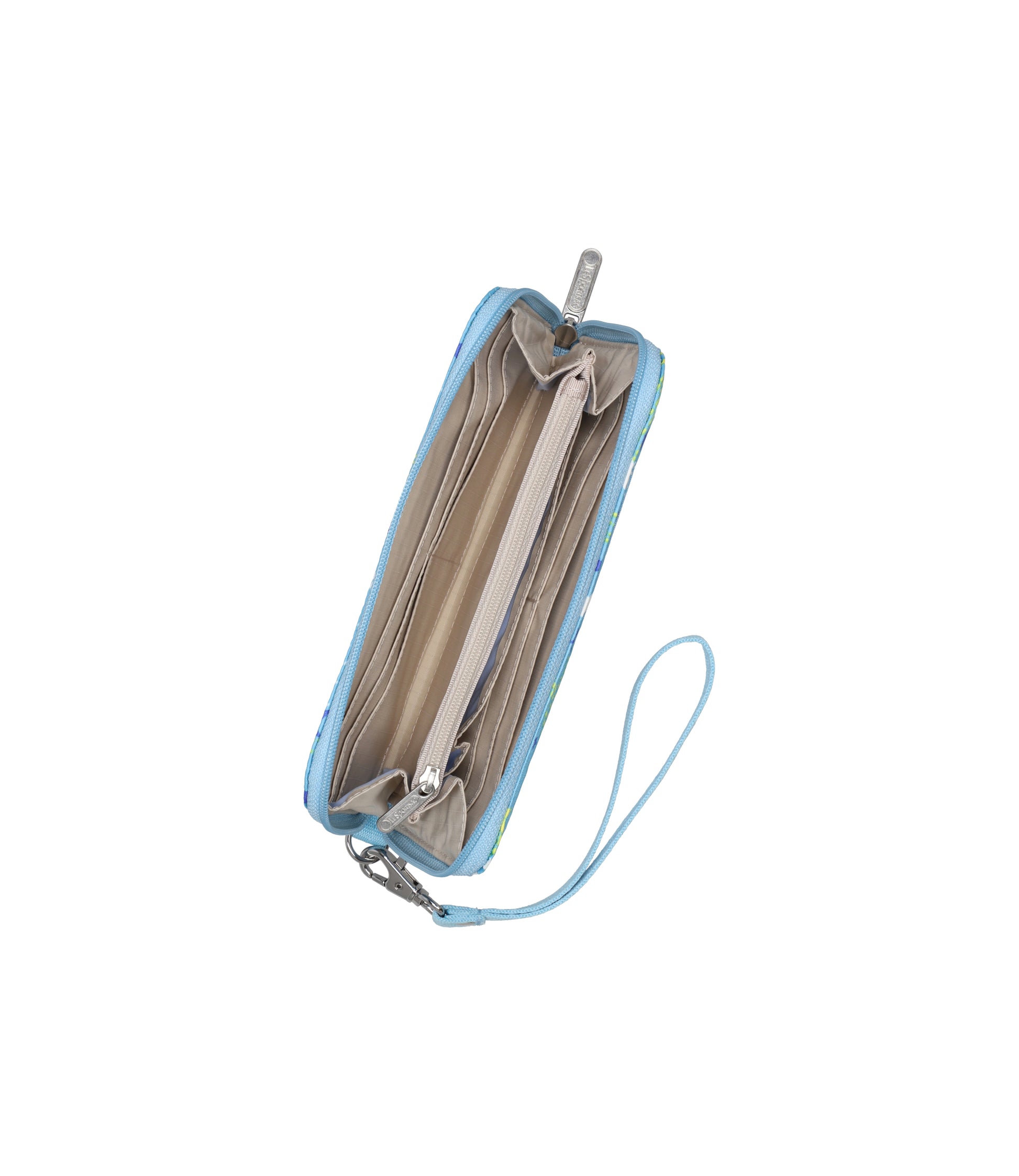 Zip around main closure, Exterior front open pocket, Detachable wristlet strap (0.5in/1.3cm wide webbing strap with a total loop length of 6.5 in/16.5 cm from end to end), Interior features eight total card slots and two full-length bill pockets, Interior center zip closure pocket for coins, Interior open cell phone pocket, Two Interior gusset pockets (to hold receipts, pens or additional paper currency)