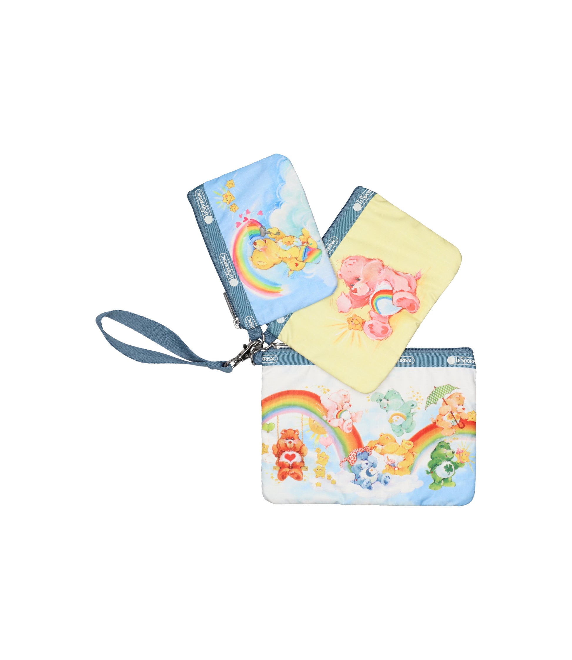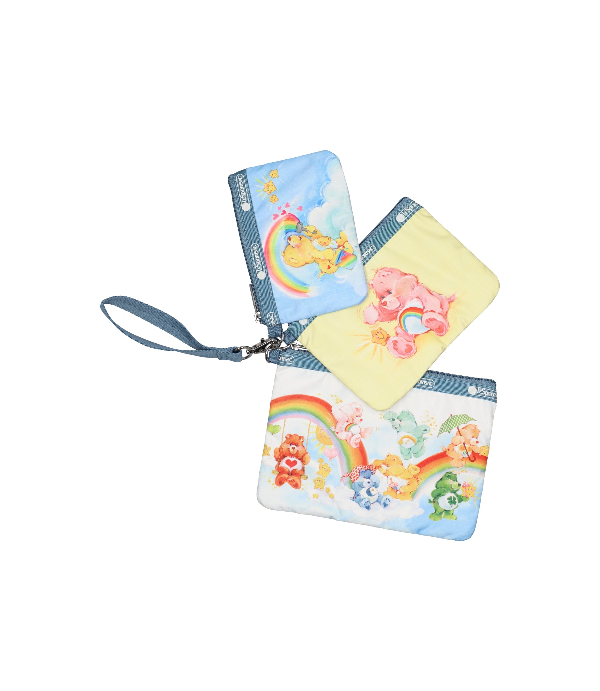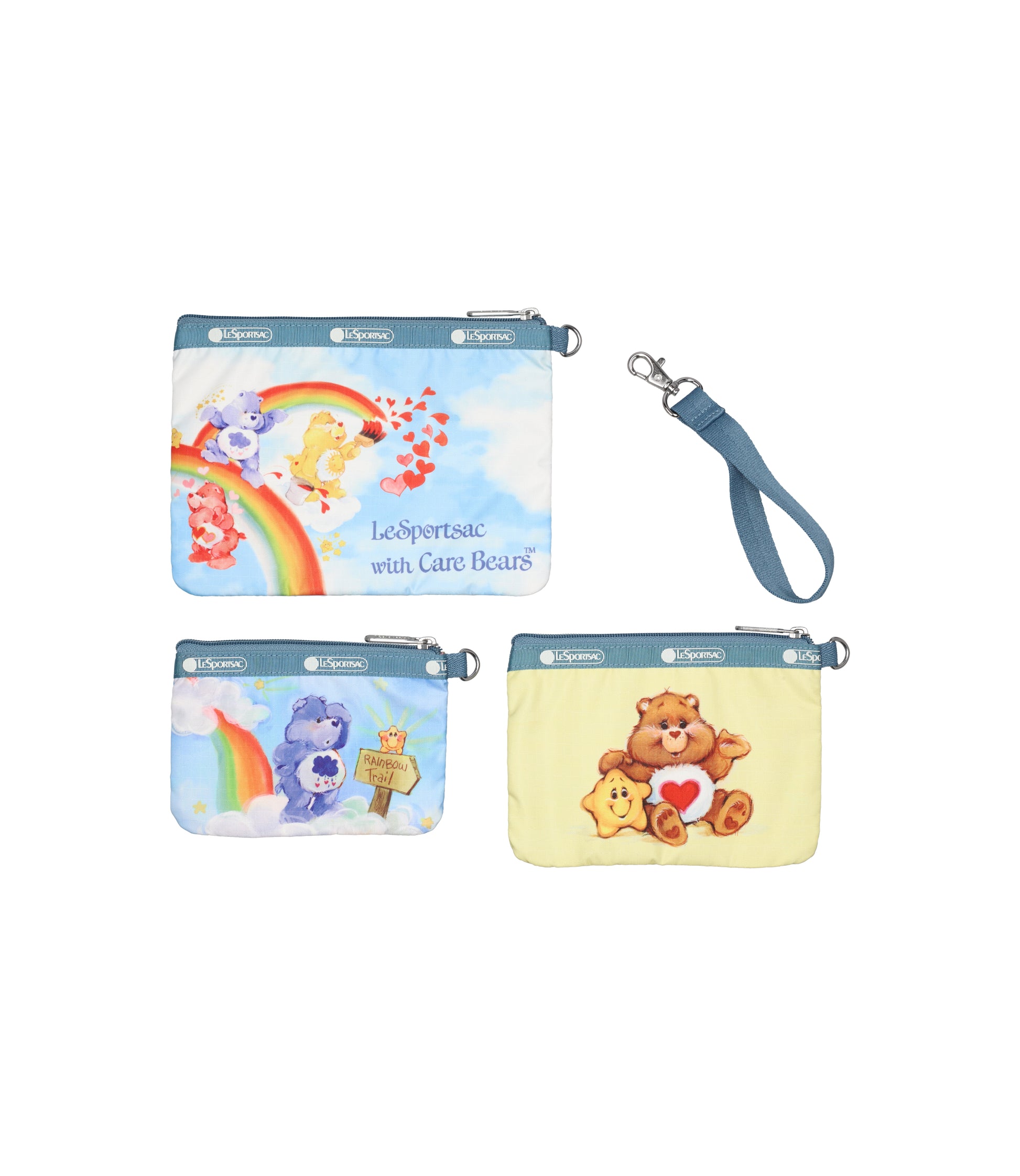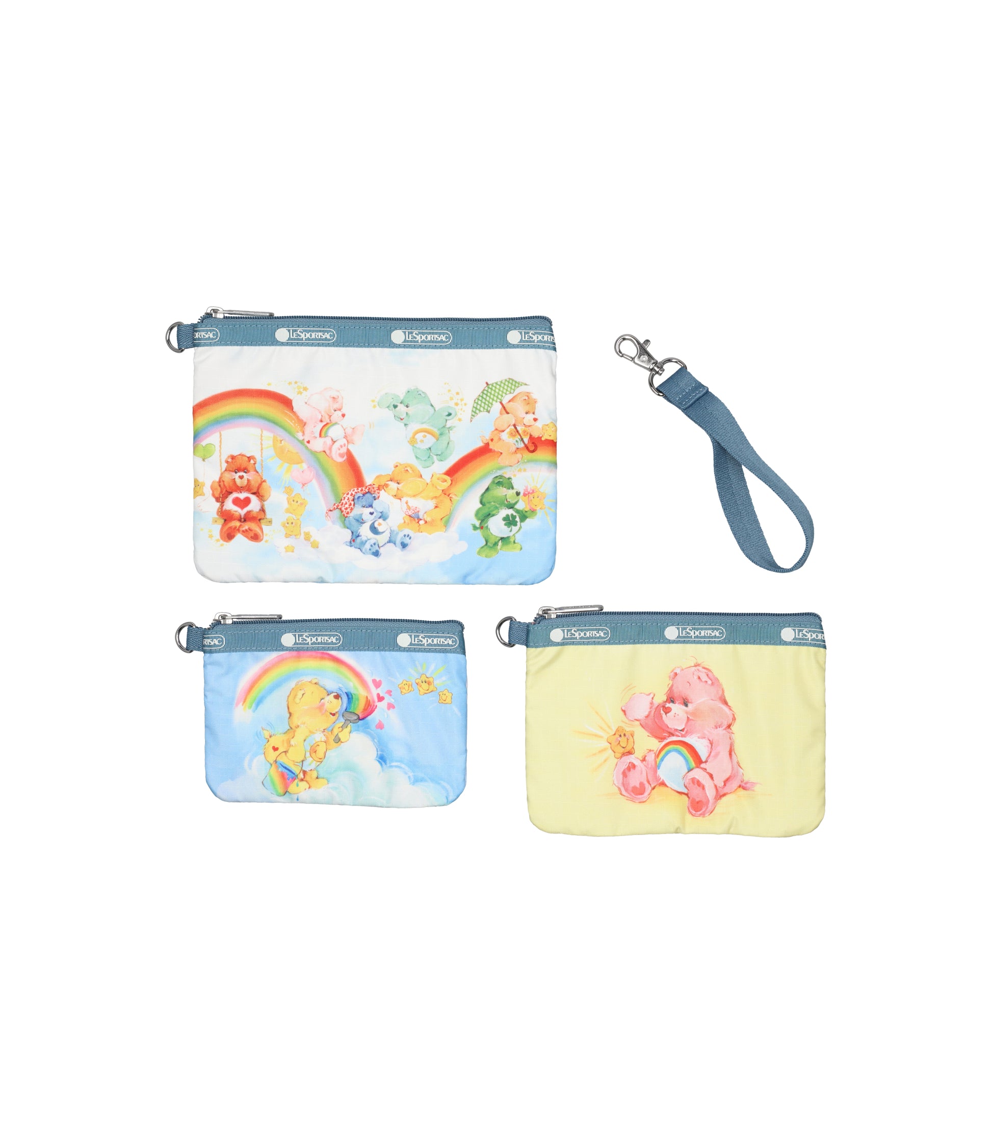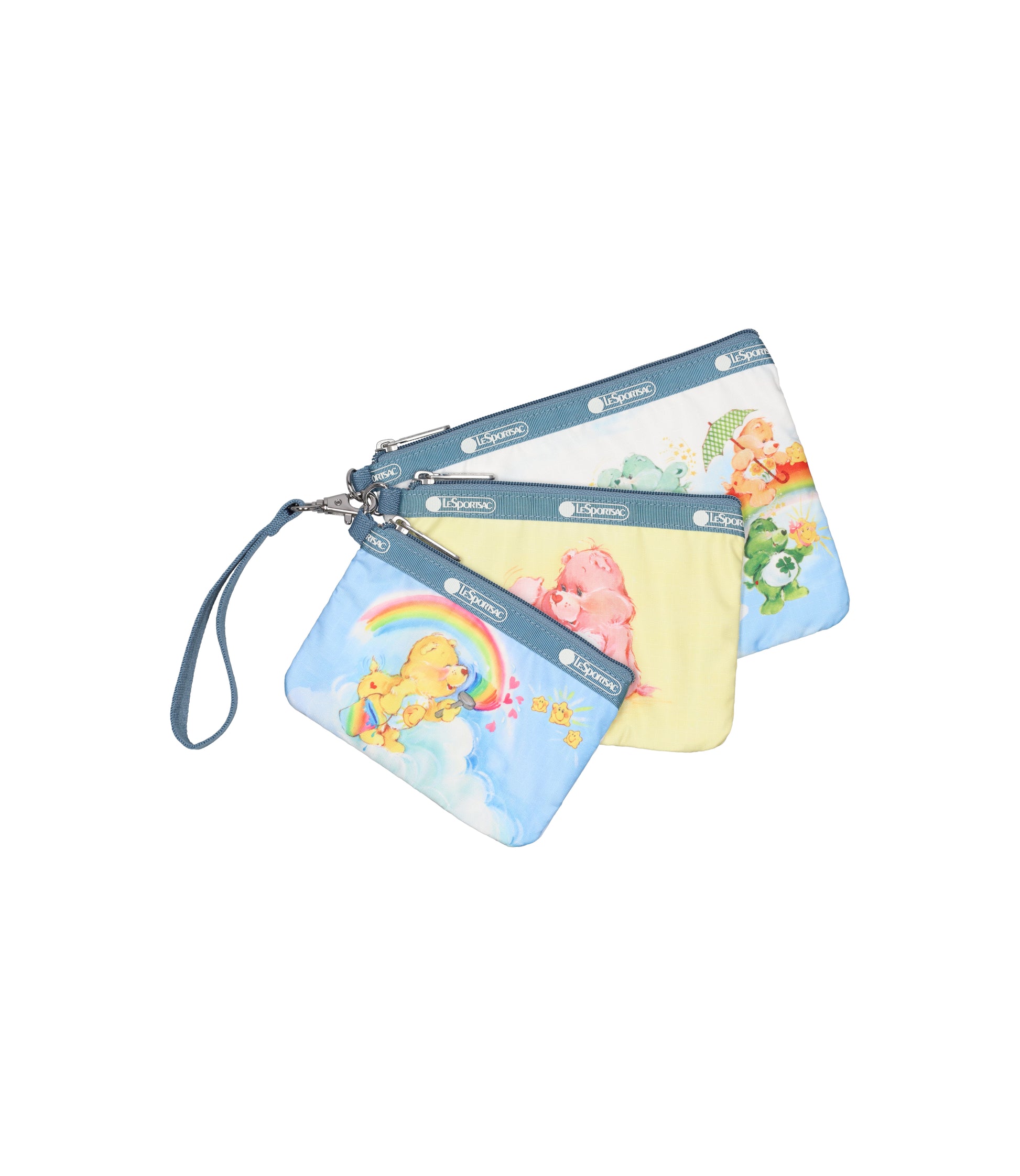Set of three zip closure pouches with metal D-rings on the upper left corners and a detachable wristlet strap (0.75in/1.9 cm wide webbing and 5.8in/14.8cm loop length end to end)